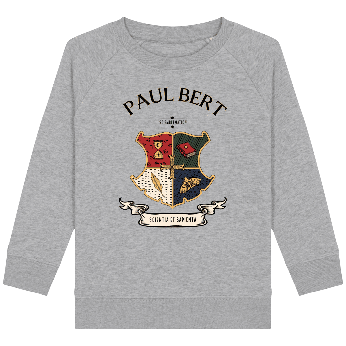 Sweat Enfant BLASON ECOLE PAUL BERT. Sweat enfant col rond en coton BIO de la marque STANLEY STELLA. Manches raglan, Col en côte 1×1. Bande de propreté intérieur col en jersey. 1/2 lune intérieur col dans la matière principale, Côte 1×1 au bas de manches et bas de corps. Surpiqûre double aux emmanchures, bas de manches et bas de corps. Sweat intérieur en molleton non brossé (non duveteux). 85% coton biologique filé et peigné, 15% polyester recyclé. Coupe normale du 3/4 ans au 12/14 ans. 300 G/M².