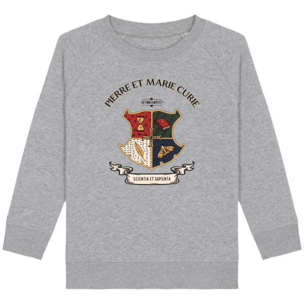 Sweat Enfant BLASON ECOLE PIERRE ET MARIE CURIE. Sweat enfant col rond en coton BIO de la marque STANLEY STELLA. Manches raglan, Col en côte 1×1. Bande de propreté intérieur col en jersey. 1/2 lune intérieur col dans la matière principale, Côte 1×1 au bas de manches et bas de corps. Surpiqûre double aux emmanchures, bas de manches et bas de corps. Sweat intérieur en molleton non brossé (non duveteux). 85% coton biologique filé et peigné, 15% polyester recyclé. Coupe normale du 3/4 ans au 12/14 ans. 300 G/M².