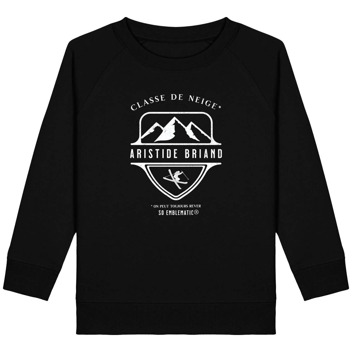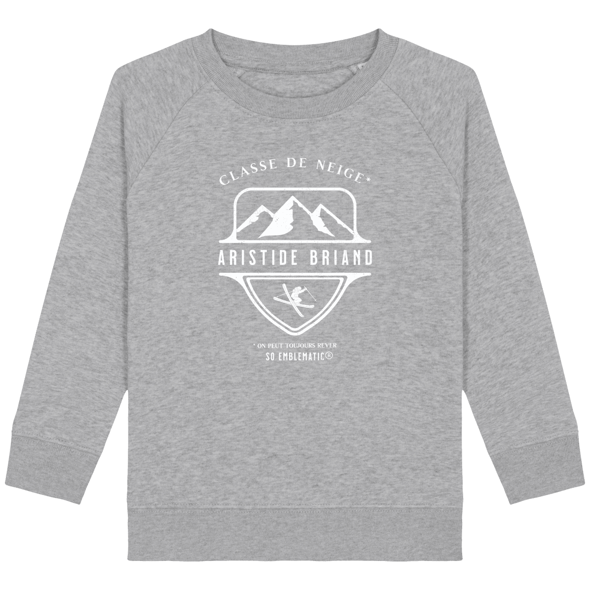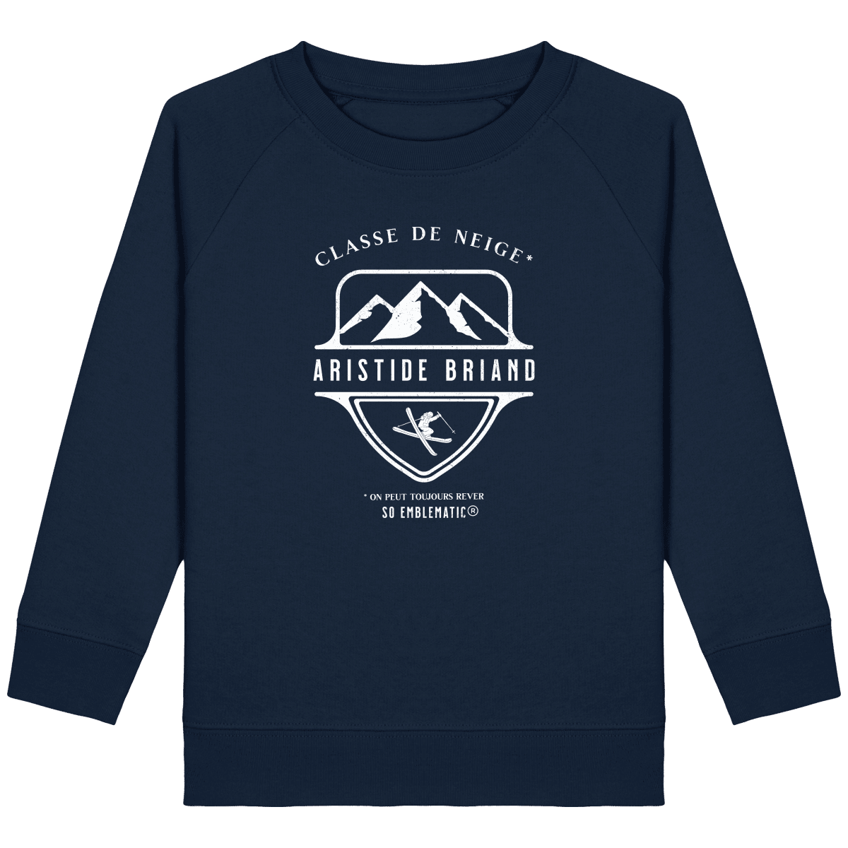 Sweat Enfant Classe de neige ARISTIDE BRIAND. Sweat enfant col rond en coton BIO de la marque STANLEY STELLA. Manches raglan, Col en côte 1×1. Bande de propreté intérieur col en jersey. 1/2 lune intérieur col dans la matière principale, Côte 1×1 au bas de manches et bas de corps. Surpiqûre double aux emmanchures, bas de manches et bas de corps. Sweat intérieur en molleton non brossé (non duveteux). 85% coton biologique filé et peigné, 15% polyester recyclé. Coupe normale du 3/4 ans au 12/14 ans. 300 G/M².