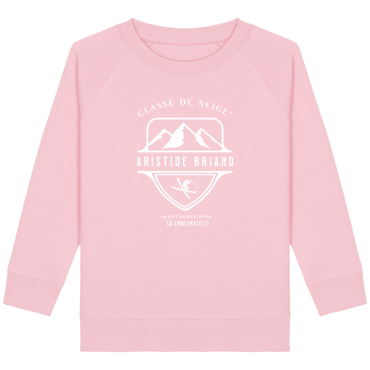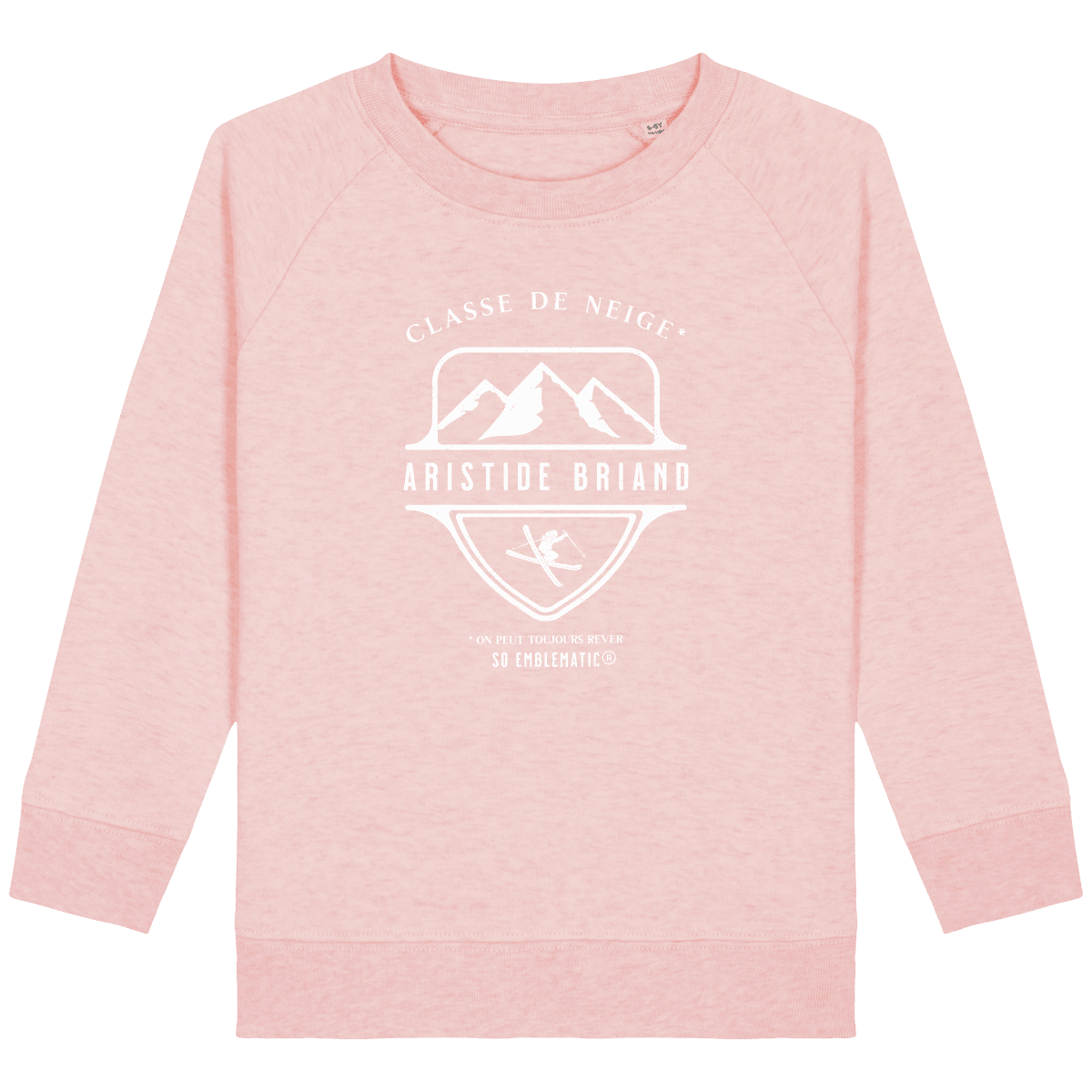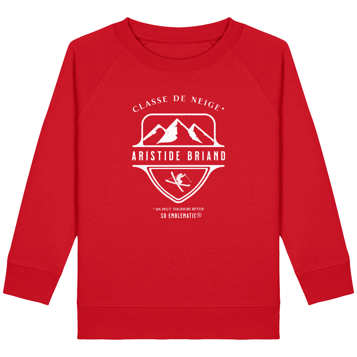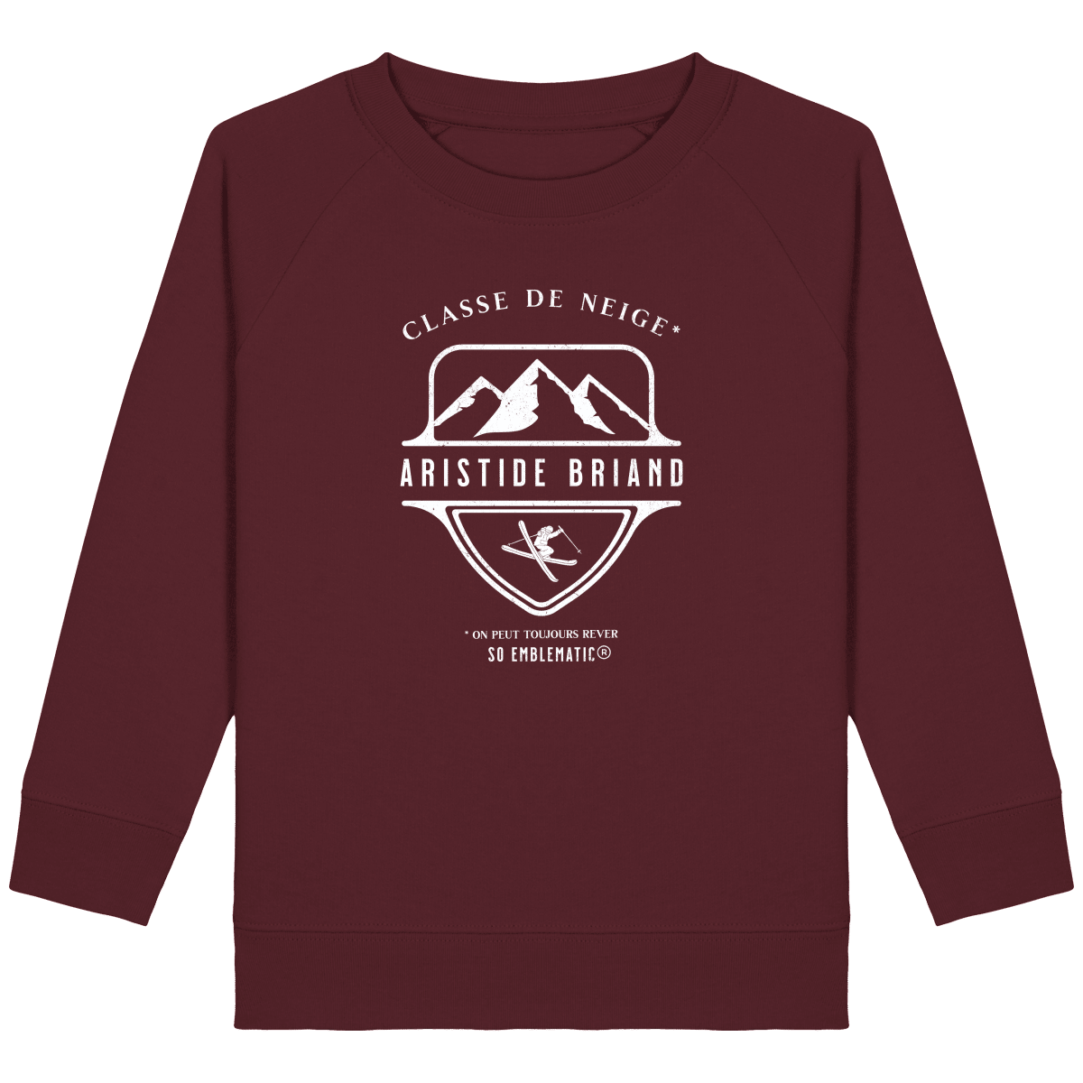 Sweat Enfant Classe de neige ARISTIDE BRIAND. Sweat enfant col rond en coton BIO de la marque STANLEY STELLA. Manches raglan, Col en côte 1×1. Bande de propreté intérieur col en jersey. 1/2 lune intérieur col dans la matière principale, Côte 1×1 au bas de manches et bas de corps. Surpiqûre double aux emmanchures, bas de manches et bas de corps. Sweat intérieur en molleton non brossé (non duveteux). 85% coton biologique filé et peigné, 15% polyester recyclé. Coupe normale du 3/4 ans au 12/14 ans. 300 G/M².