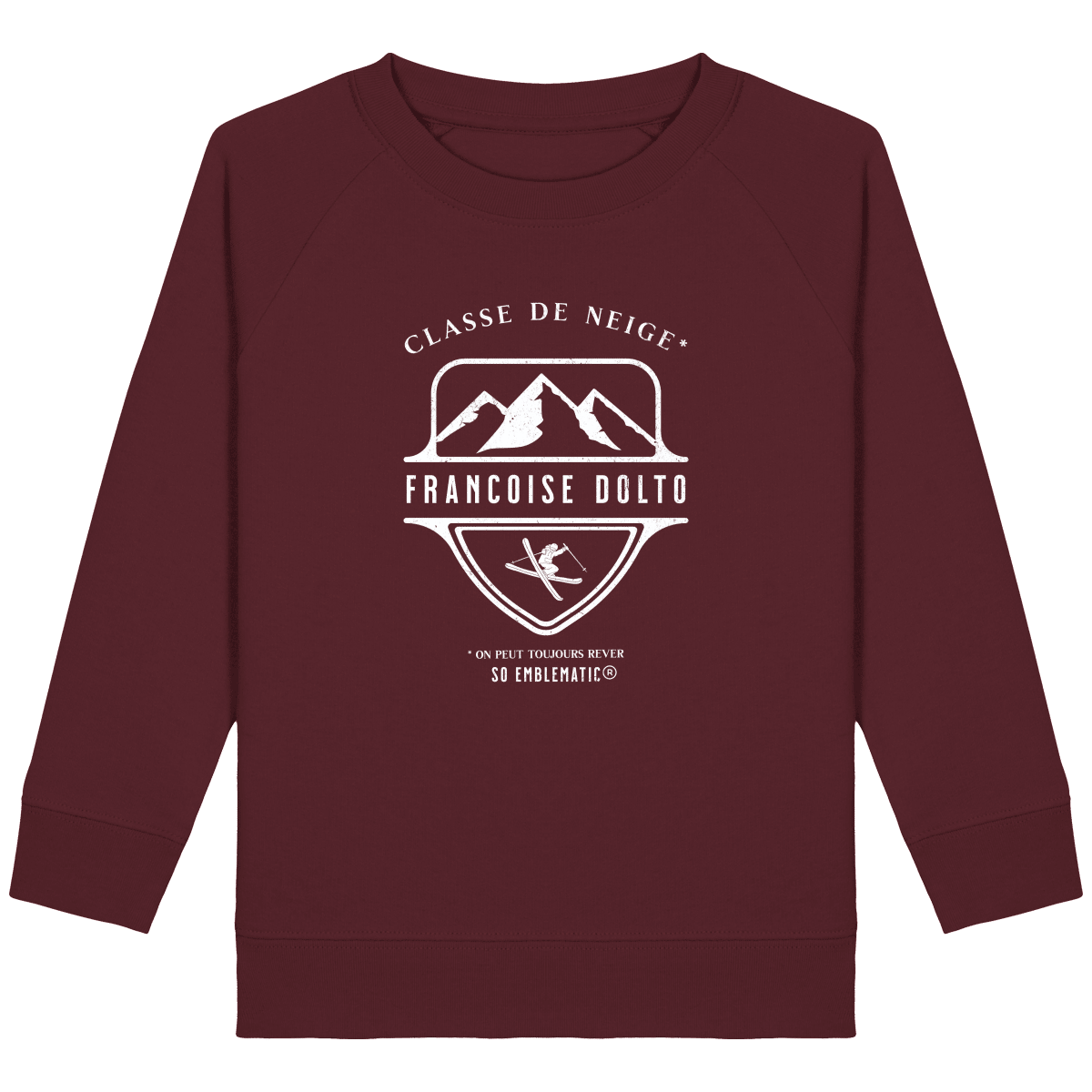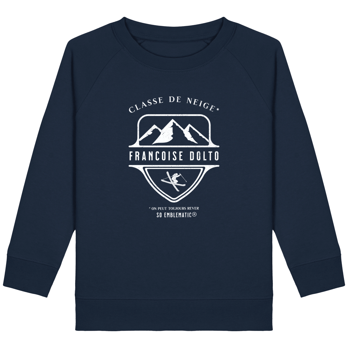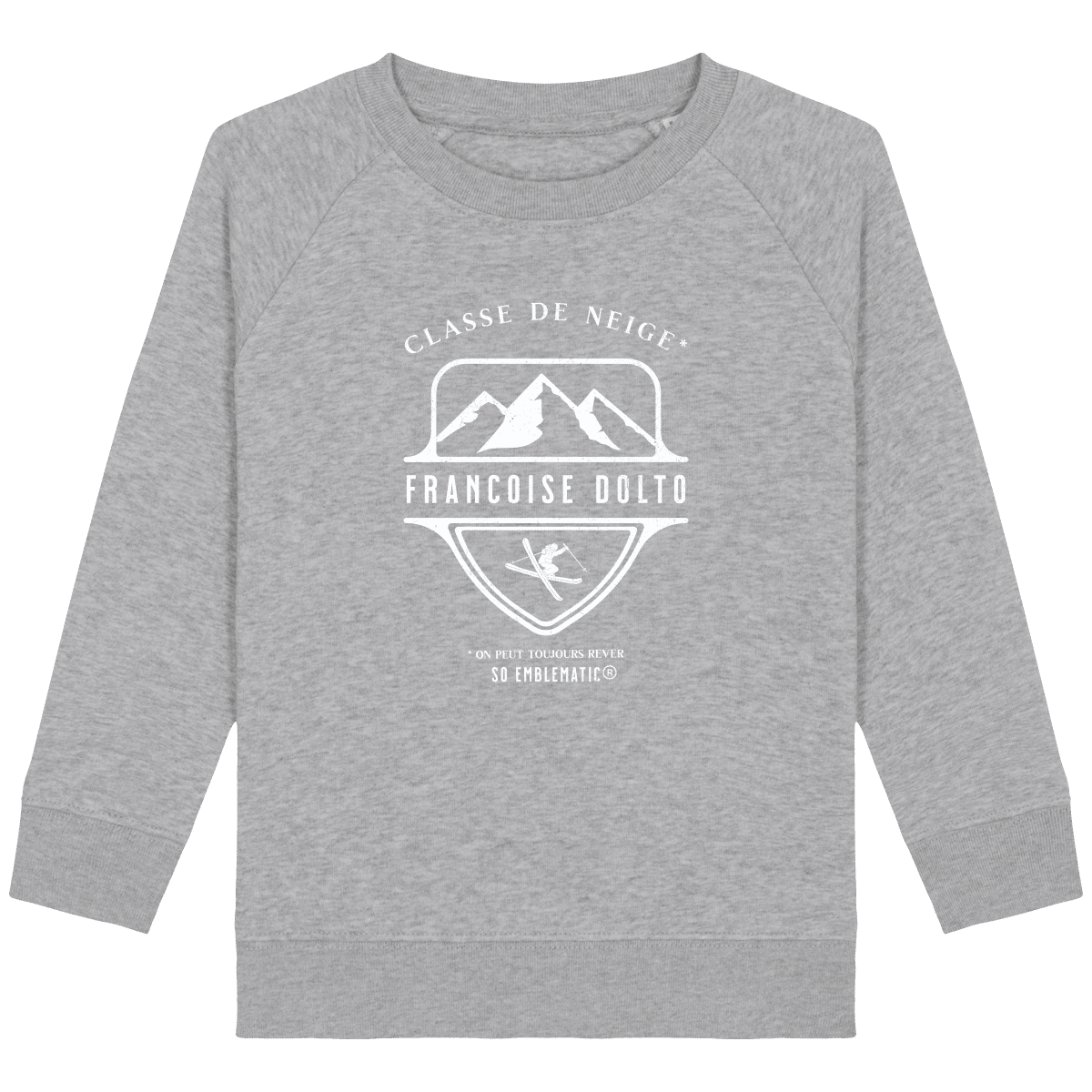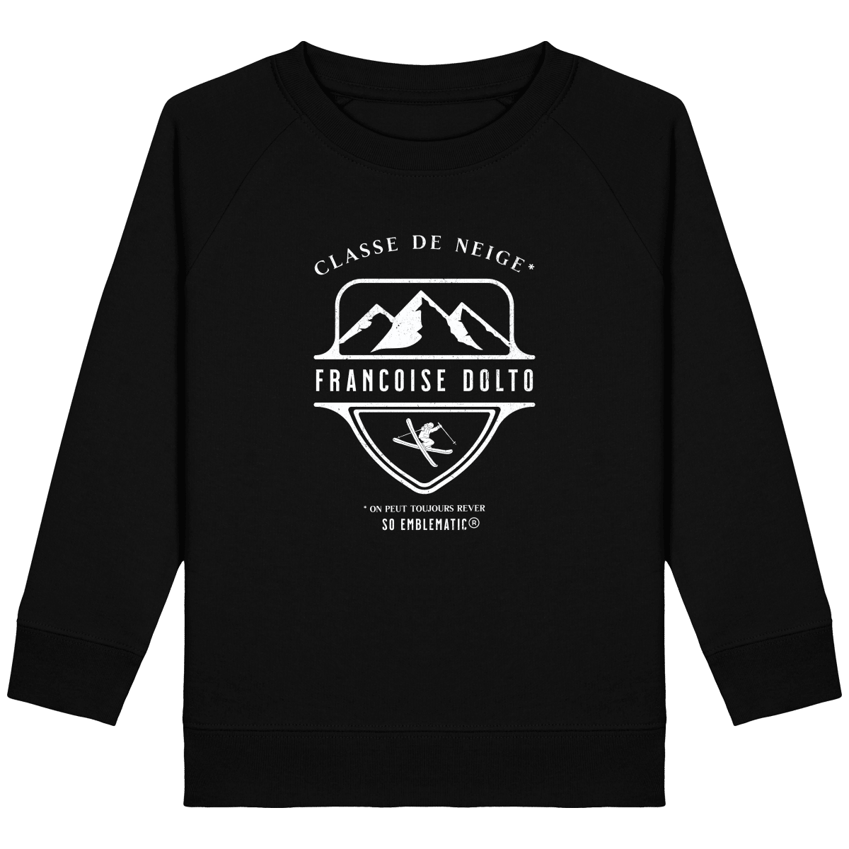 Sweat humoristique Enfant Classe de neige avec le nom d’école FRANCOISE DOLTO. Sweat enfant col rond en coton BIO de la marque STANLEY STELLA. Manches raglan, Col en côte 1×1. Bande de propreté intérieur col en jersey. 1/2 lune intérieur col dans la matière principale, Côte 1×1 au bas de manches et bas de corps. Surpiqûre double aux emmanchures, bas de manches et bas de corps. Sweat intérieur en molleton non brossé (non duveteux). 85% coton biologique filé et peigné, 15% polyester recyclé. Coupe normale du 3/4 ans au 12/14 ans. 300 G/M².