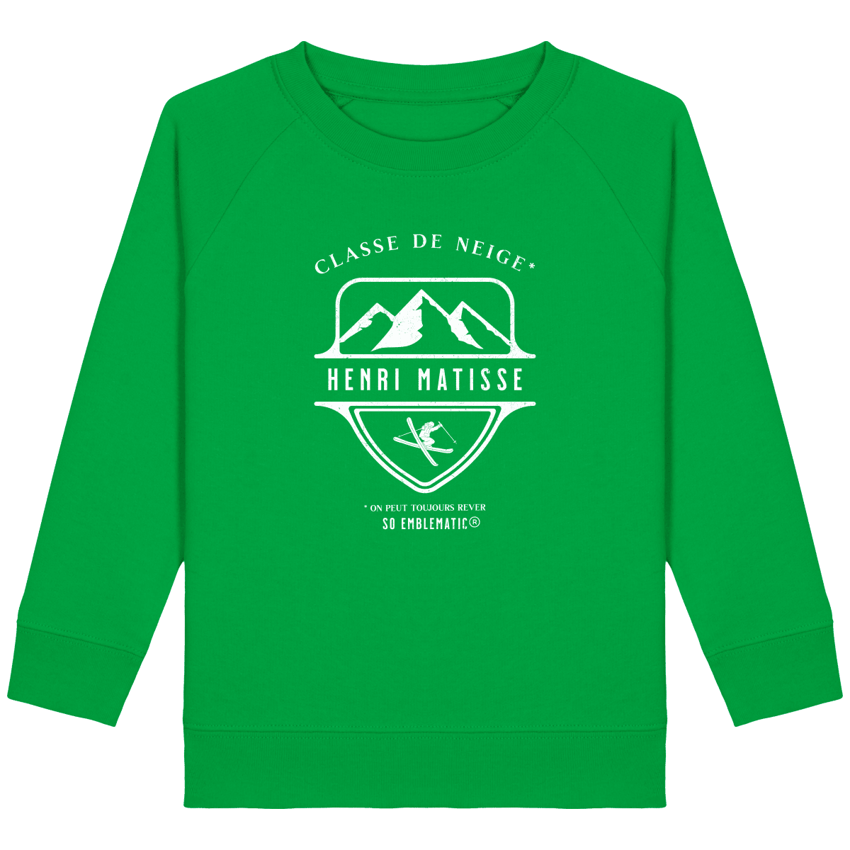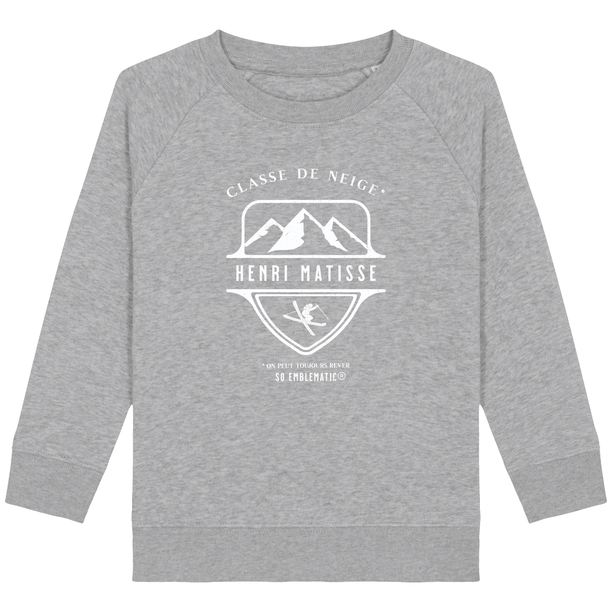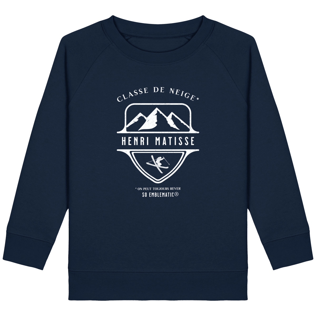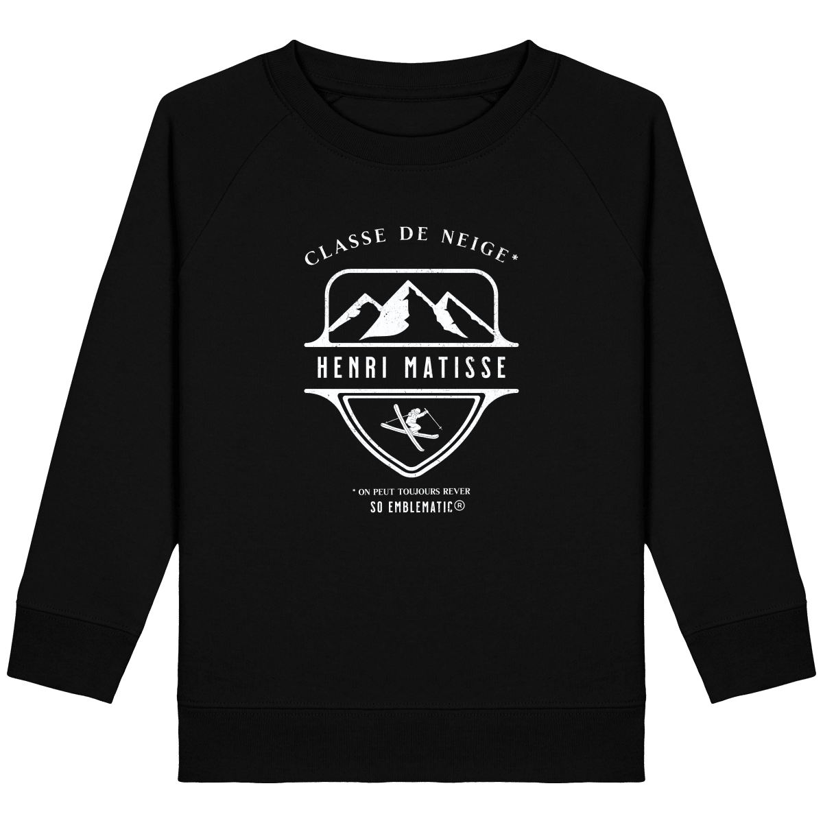 Sweat humoristique Enfant Classe de neige HENRI MATISSE. Sweat enfant col rond en coton BIO de la marque STANLEY STELLA. Manches raglan, Col en côte 1×1. Bande de propreté intérieur col en jersey. 1/2 lune intérieur col dans la matière principale, Côte 1×1 au bas de manches et bas de corps. Surpiqûre double aux emmanchures, bas de manches et bas de corps. Sweat intérieur en molleton non brossé (non duveteux). 85% coton biologique filé et peigné, 15% polyester recyclé. Coupe normale du 3/4 ans au 12/14 ans. 300 G/M².