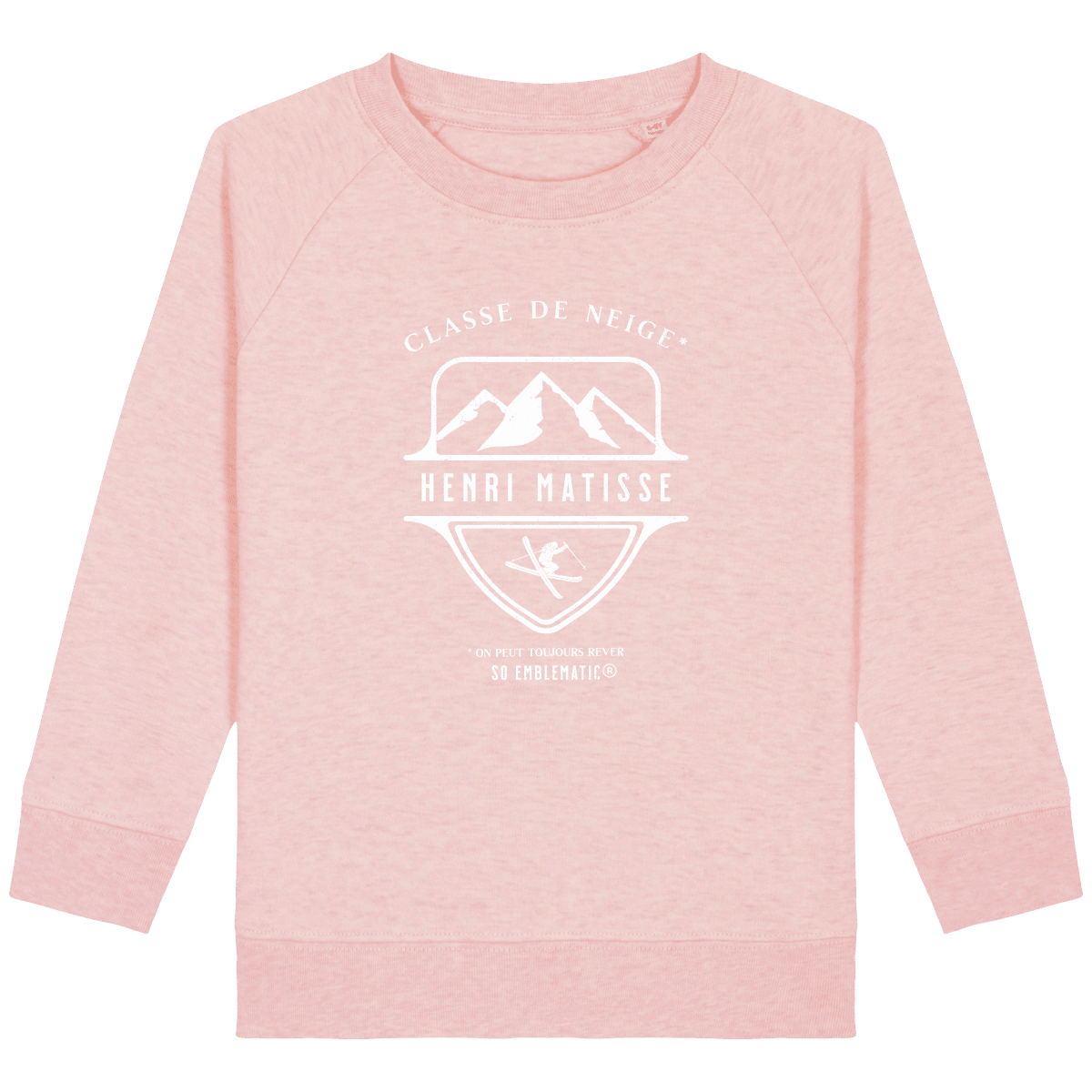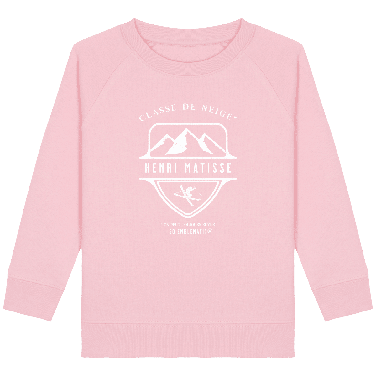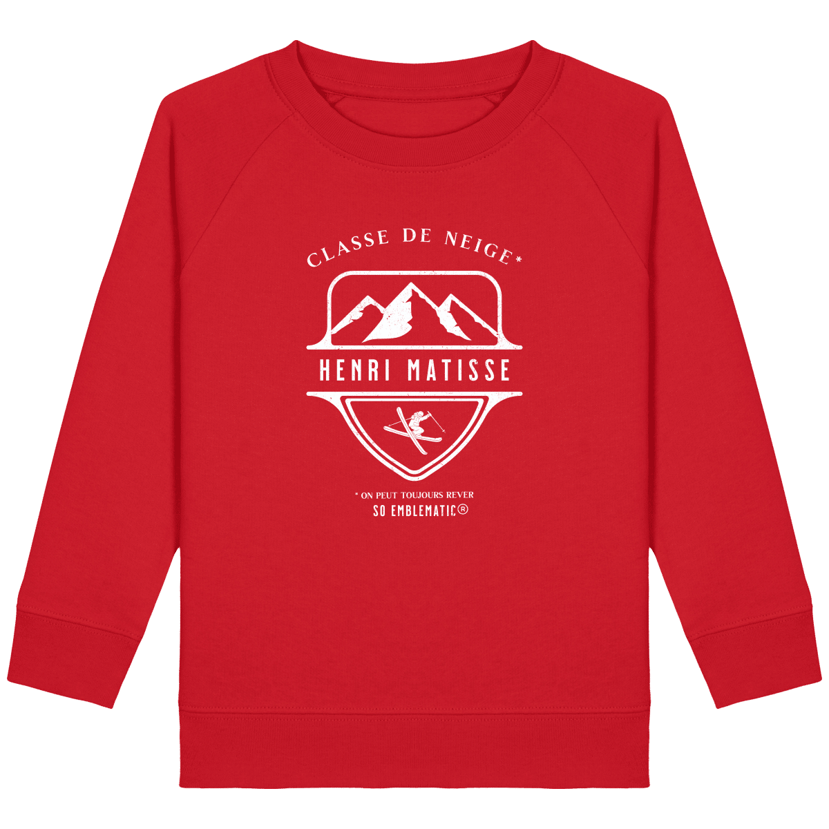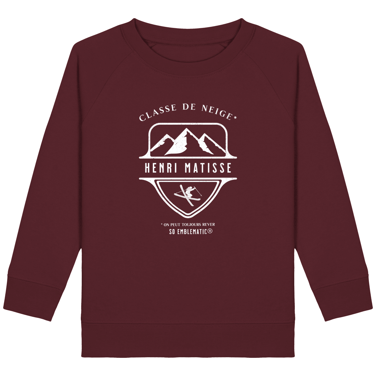 Sweat humoristique Enfant Classe de neige HENRI MATISSE. Sweat enfant col rond en coton BIO de la marque STANLEY STELLA. Manches raglan, Col en côte 1×1. Bande de propreté intérieur col en jersey. 1/2 lune intérieur col dans la matière principale, Côte 1×1 au bas de manches et bas de corps. Surpiqûre double aux emmanchures, bas de manches et bas de corps. Sweat intérieur en molleton non brossé (non duveteux). 85% coton biologique filé et peigné, 15% polyester recyclé. Coupe normale du 3/4 ans au 12/14 ans. 300 G/M².