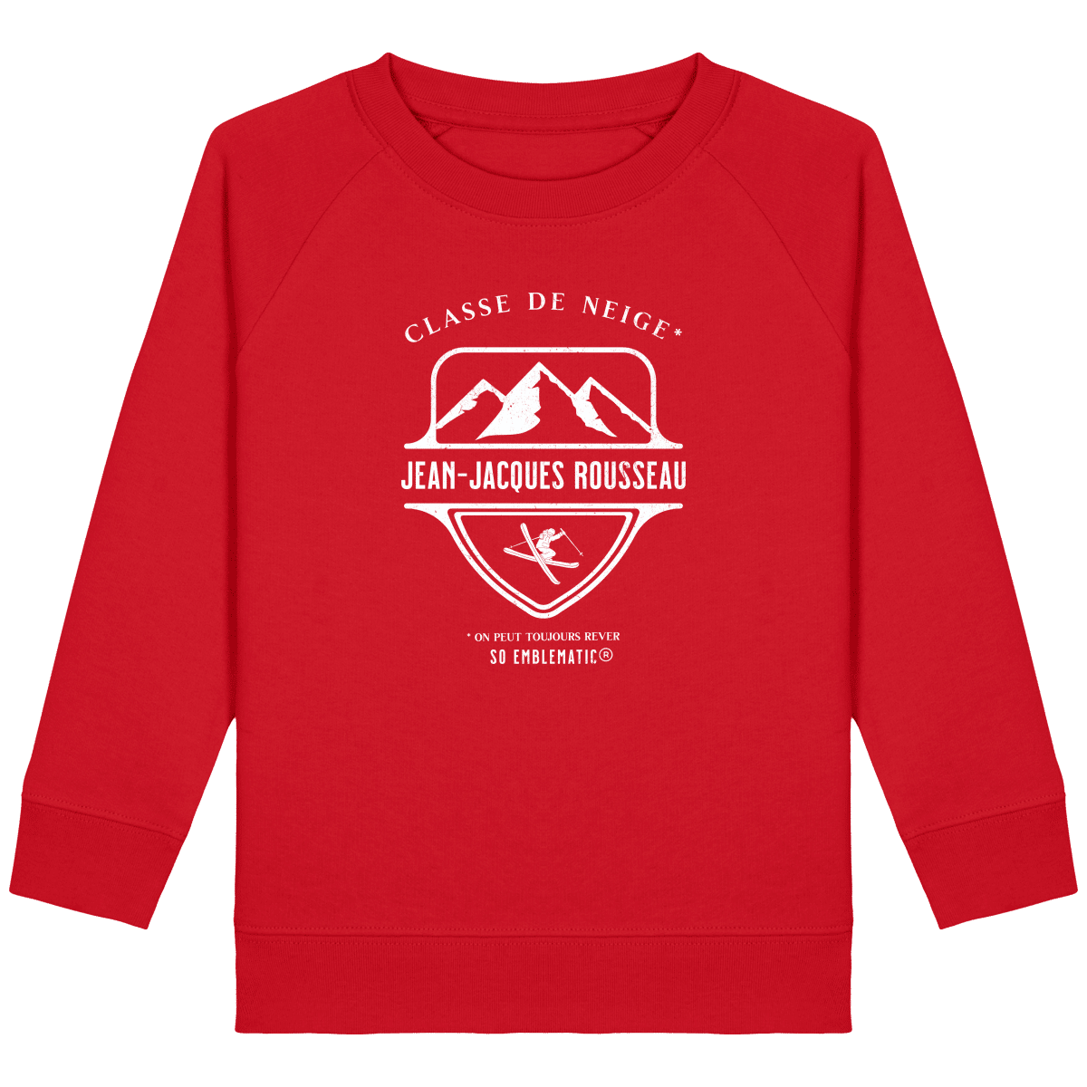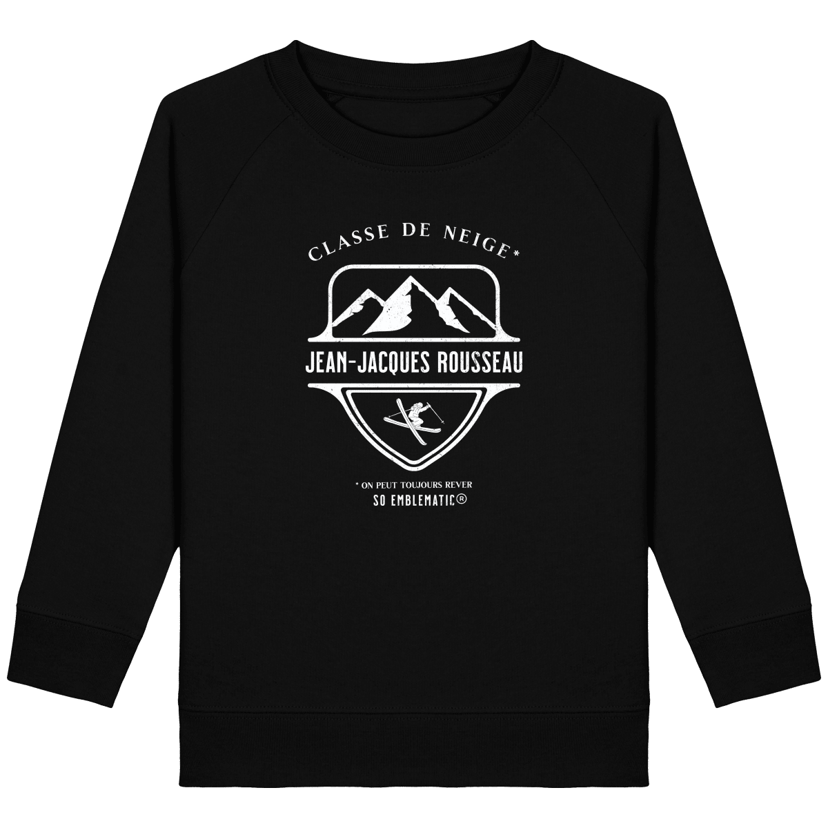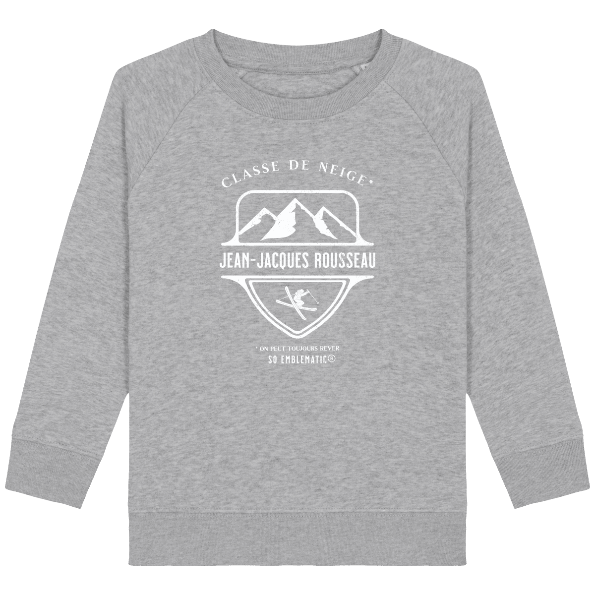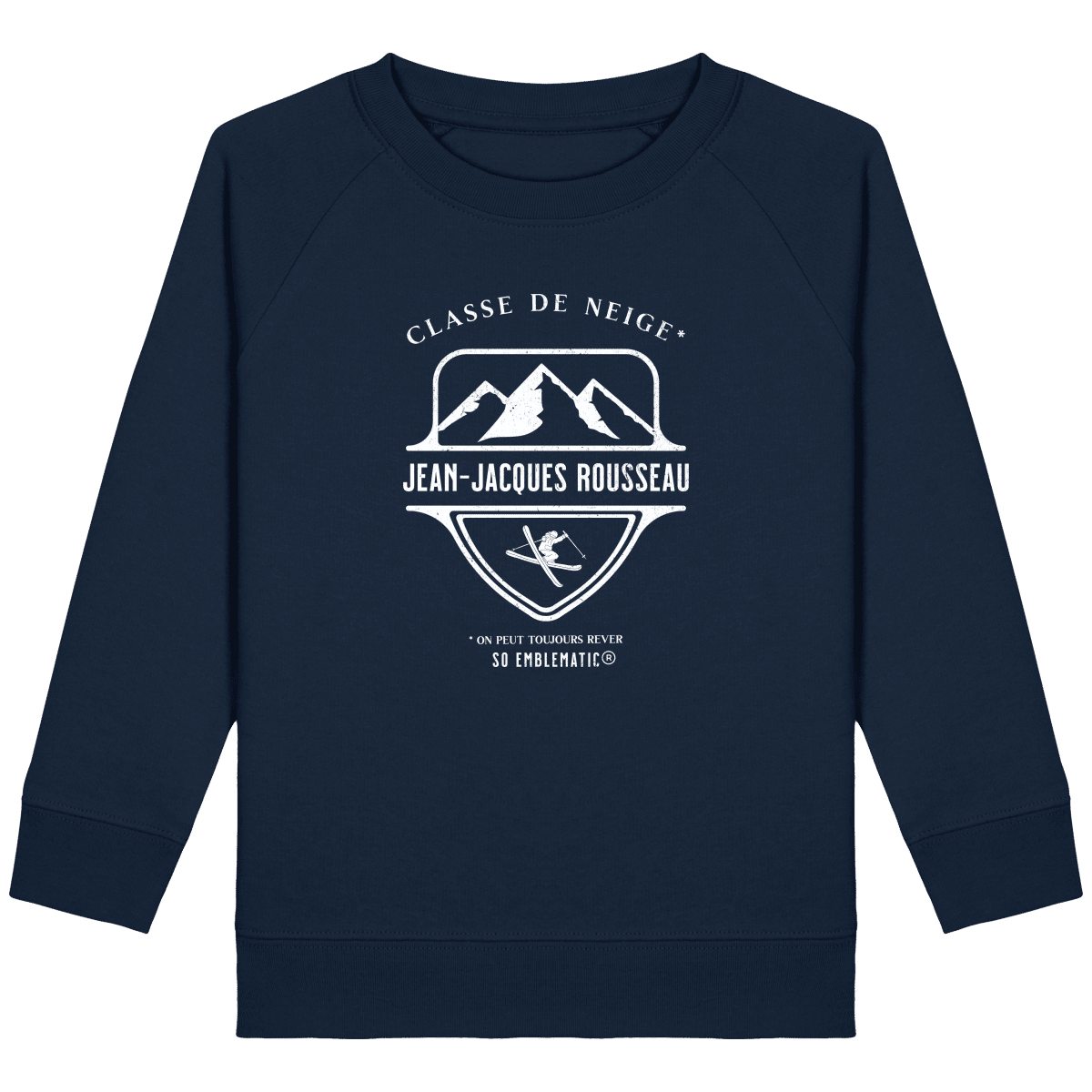 Sweat Enfant Classe de neige JEAN-JACQUES ROUSSEAU. Sweat enfant col rond en coton BIO de la marque STANLEY STELLA. Manches raglan, Col en côte 1×1. Bande de propreté intérieur col en jersey. 1/2 lune intérieur col dans la matière principale, Côte 1×1 au bas de manches et bas de corps. Surpiqûre double aux emmanchures, bas de manches et bas de corps. Sweat intérieur en molleton non brossé (non duveteux). 85% coton biologique filé et peigné, 15% polyester recyclé. Coupe normale du 3/4 ans au 12/14 ans. 300 G/M².