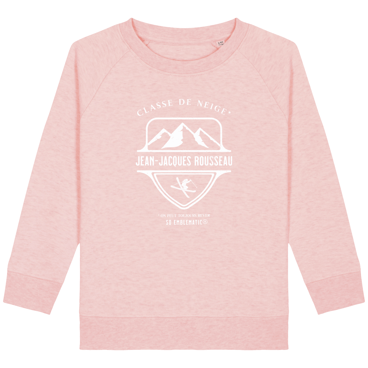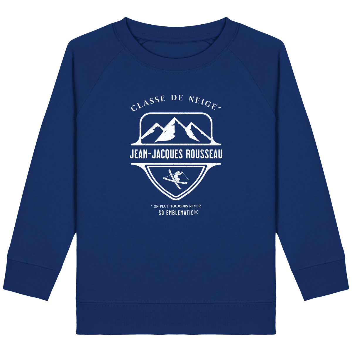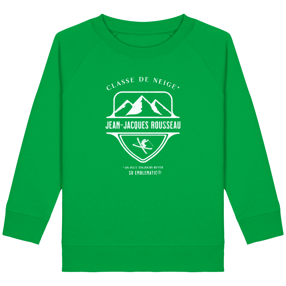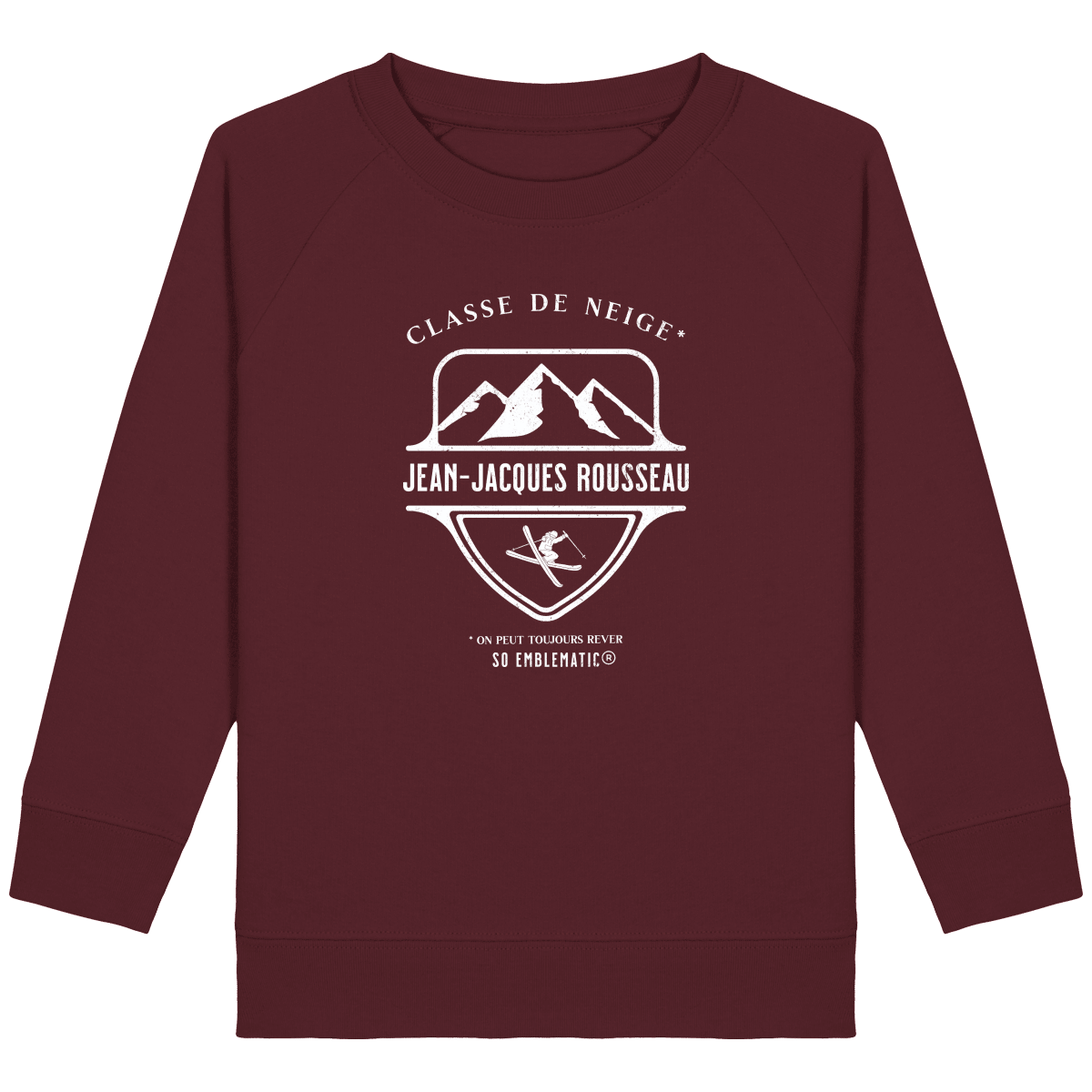 Sweat Enfant Classe de neige JEAN-JACQUES ROUSSEAU. Sweat enfant col rond en coton BIO de la marque STANLEY STELLA. Manches raglan, Col en côte 1×1. Bande de propreté intérieur col en jersey. 1/2 lune intérieur col dans la matière principale, Côte 1×1 au bas de manches et bas de corps. Surpiqûre double aux emmanchures, bas de manches et bas de corps. Sweat intérieur en molleton non brossé (non duveteux). 85% coton biologique filé et peigné, 15% polyester recyclé. Coupe normale du 3/4 ans au 12/14 ans. 300 G/M².