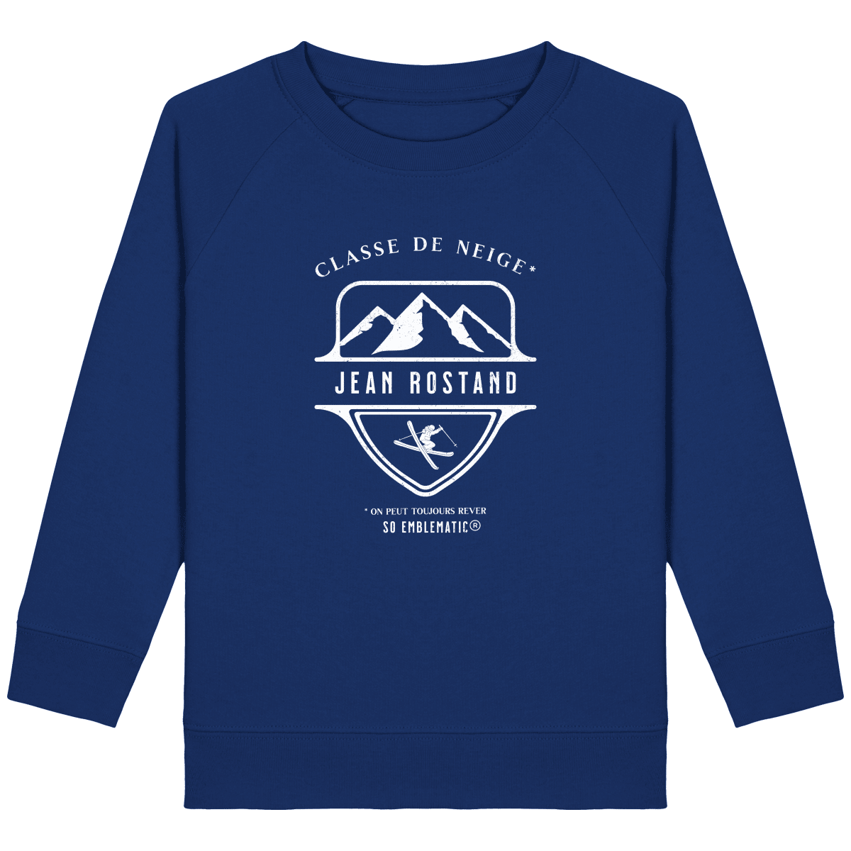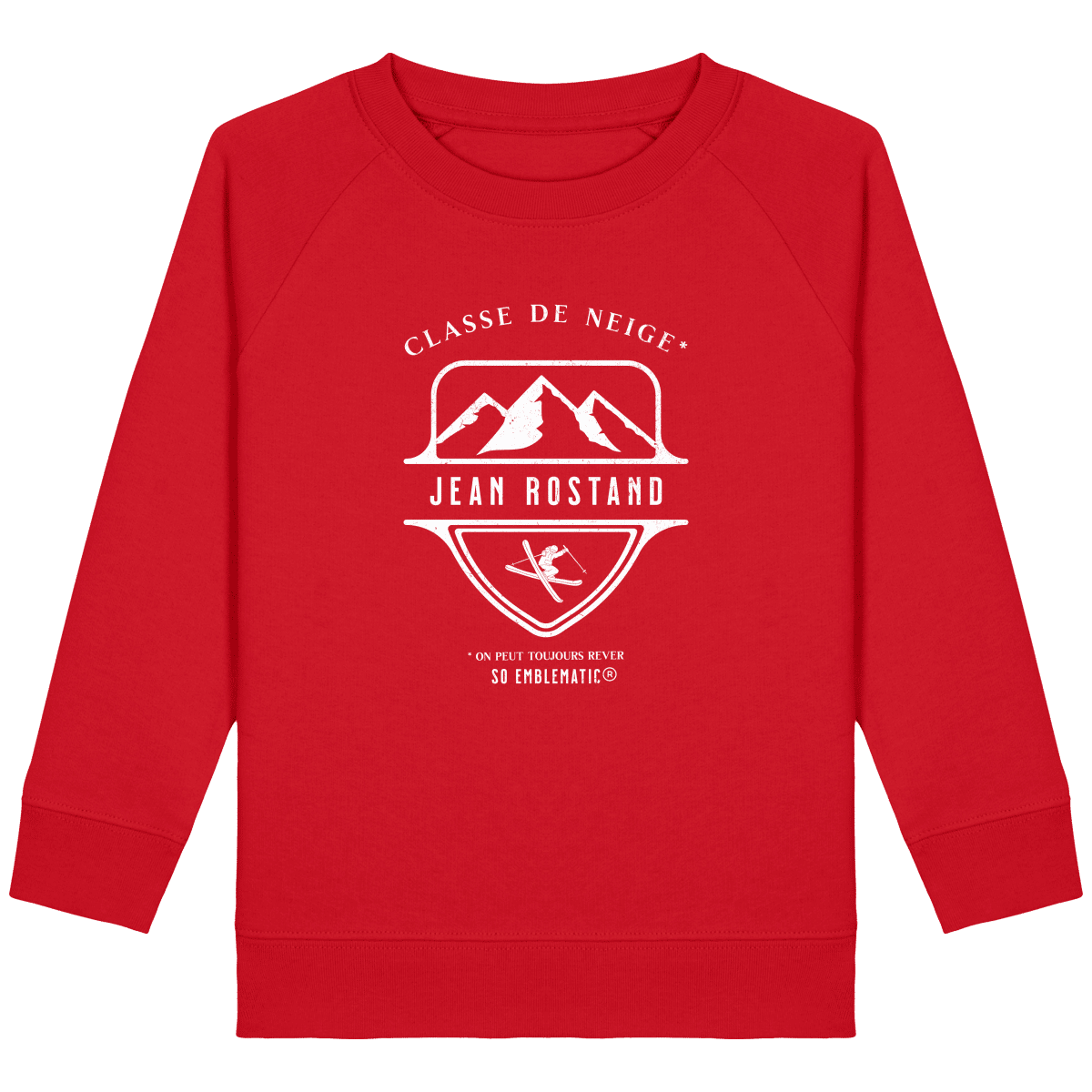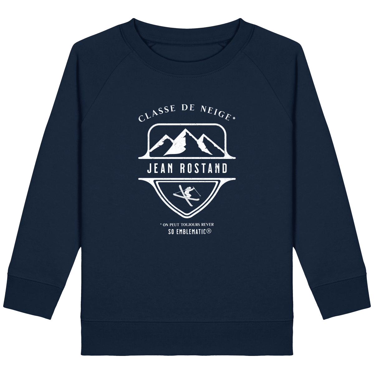 Sweat Enfant Classe de neige JEAN ROSTAND. Sweat enfant col rond en coton BIO de la marque STANLEY STELLA. Manches raglan, Col en côte 1×1. Bande de propreté intérieur col en jersey. 1/2 lune intérieur col dans la matière principale, Côte 1×1 au bas de manches et bas de corps. Surpiqûre double aux emmanchures, bas de manches et bas de corps. Sweat intérieur en molleton non brossé (non duveteux). 85% coton biologique filé et peigné, 15% polyester recyclé. Coupe normale du 3/4 ans au 12/14 ans. 300 G/M².
