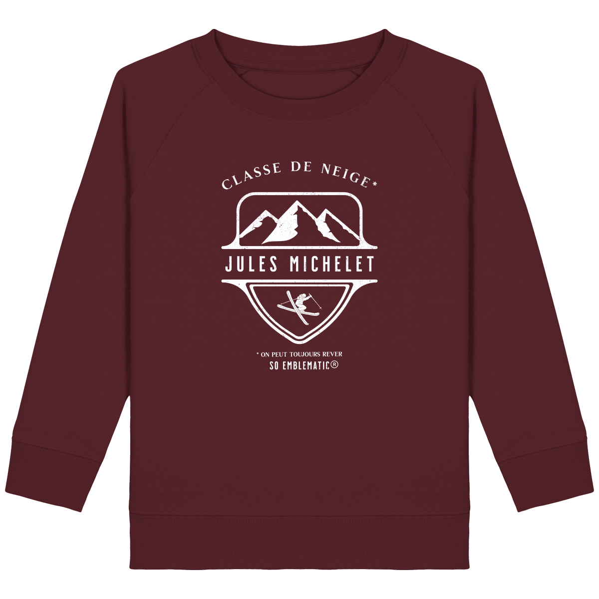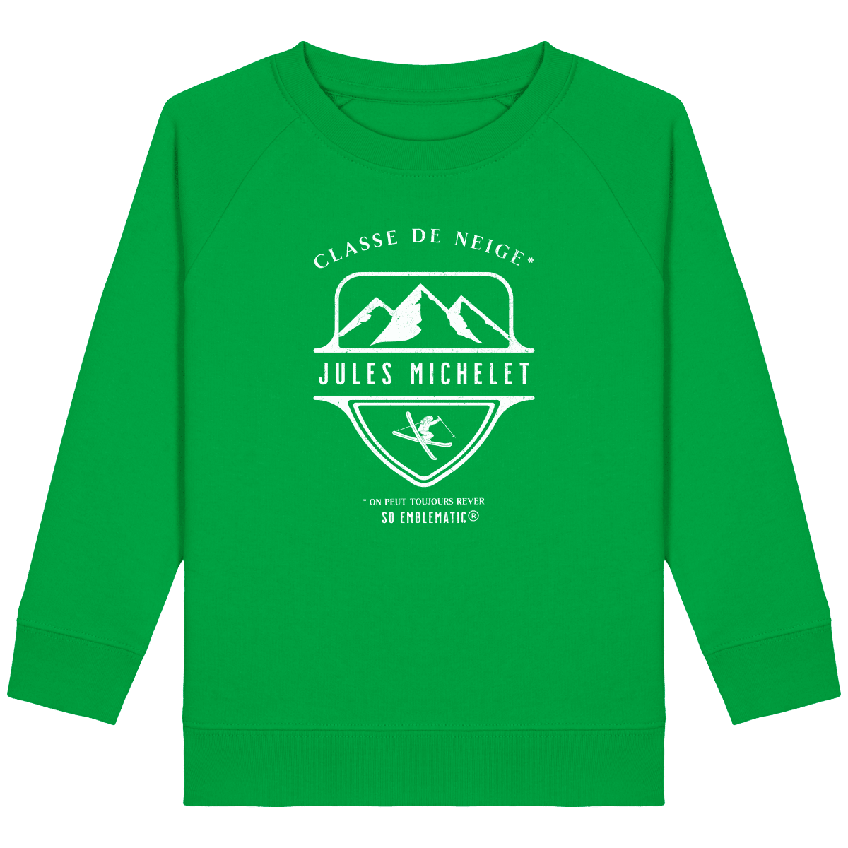 Sweat Enfant Classe de neige JULES MICHELET. Sweat enfant col rond en coton BIO de la marque STANLEY STELLA. Manches raglan, Col en côte 1×1. Bande de propreté intérieur col en jersey. 1/2 lune intérieur col dans la matière principale, Côte 1×1 au bas de manches et bas de corps. Surpiqûre double aux emmanchures, bas de manches et bas de corps. Sweat intérieur en molleton non brossé (non duveteux). 85% coton biologique filé et peigné, 15% polyester recyclé. Coupe normale du 3/4 ans au 12/14 ans. 300 G/M².