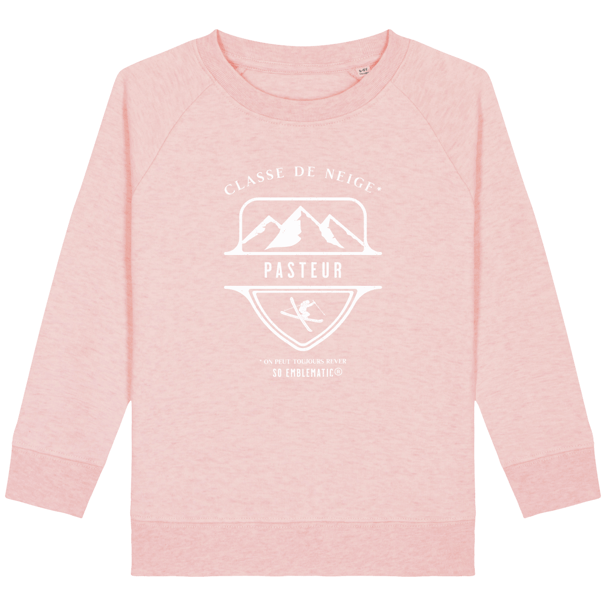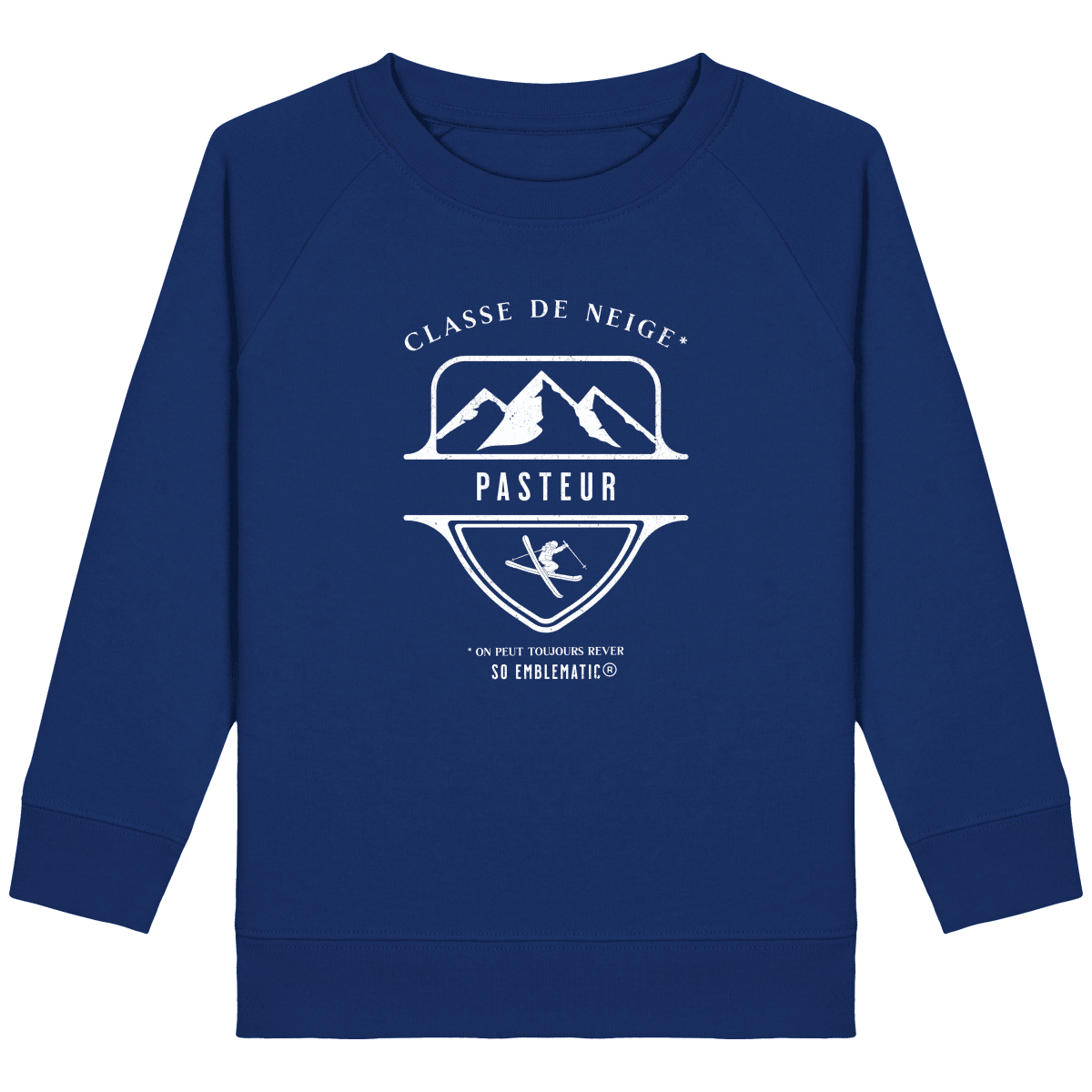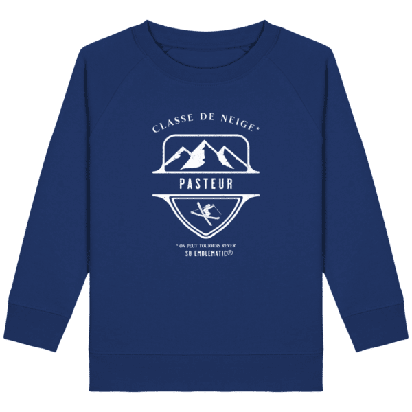 Sweat Enfant Classe de neige PASTEUR. Sweat enfant col rond en coton BIO de la marque STANLEY STELLA. Manches raglan, Col en côte 1×1. Bande de propreté intérieur col en jersey. 1/2 lune intérieur col dans la matière principale, Côte 1×1 au bas de manches et bas de corps. Surpiqûre double aux emmanchures, bas de manches et bas de corps. Sweat intérieur en molleton non brossé (non duveteux). 85% coton biologique filé et peigné, 15% polyester recyclé. Coupe normale du 3/4 ans au 12/14 ans. 300 G/M².