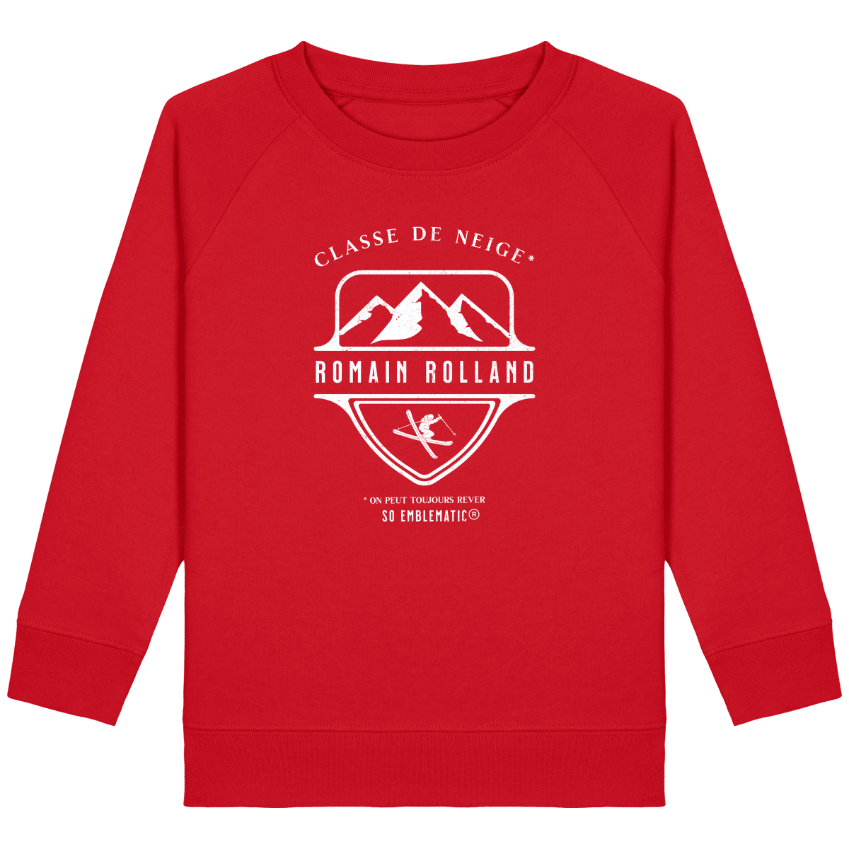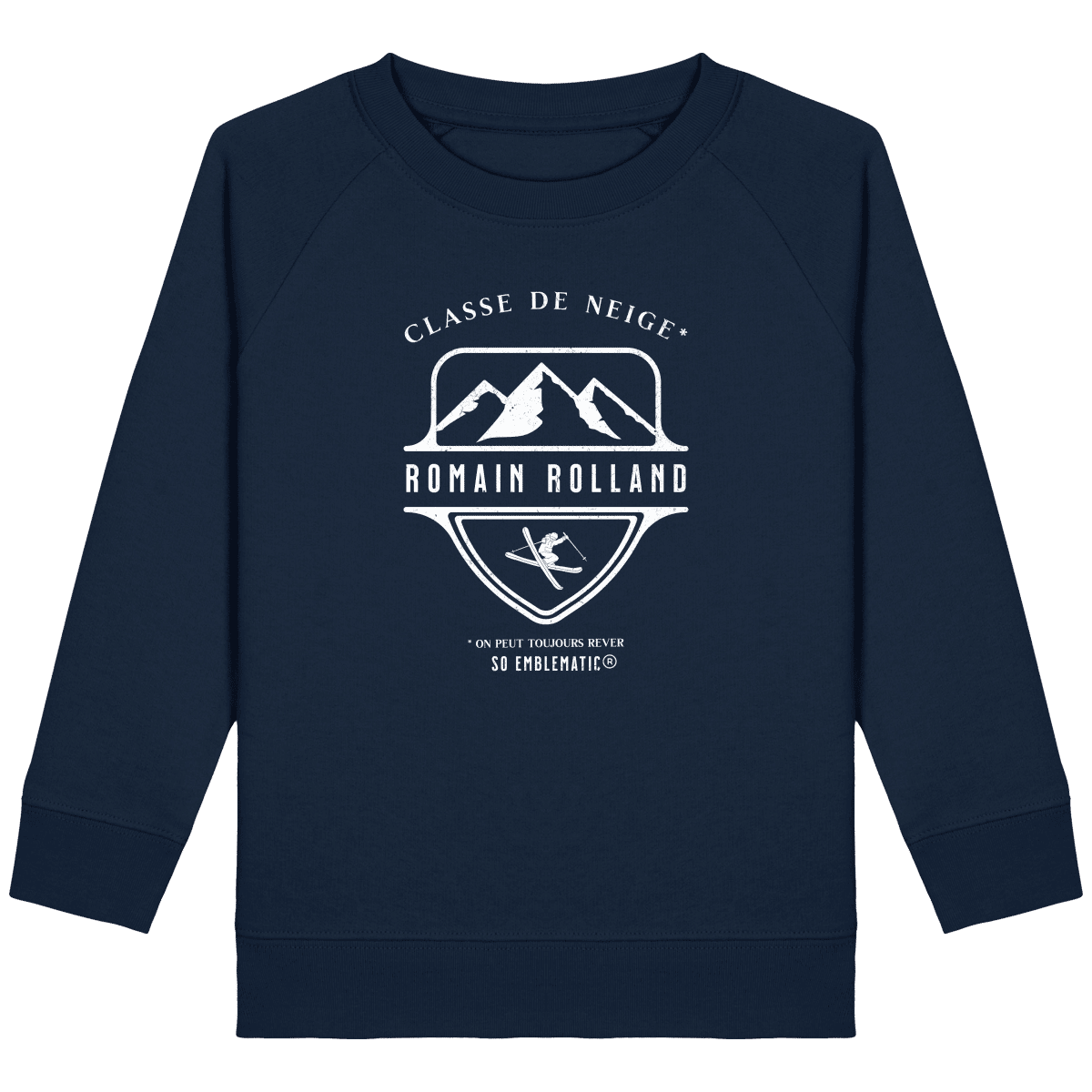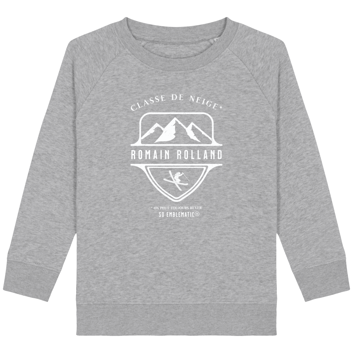 Sweat Enfant Classe de neige ROMAIN ROLLAND. Sweat enfant col rond en coton BIO de la marque STANLEY STELLA. Manches raglan, Col en côte 1×1. Bande de propreté intérieur col en jersey. 1/2 lune intérieur col dans la matière principale, Côte 1×1 au bas de manches et bas de corps. Surpiqûre double aux emmanchures, bas de manches et bas de corps. Sweat intérieur en molleton non brossé (non duveteux). 85% coton biologique filé et peigné, 15% polyester recyclé. Coupe normale du 3/4 ans au 12/14 ans. 300 G/M².