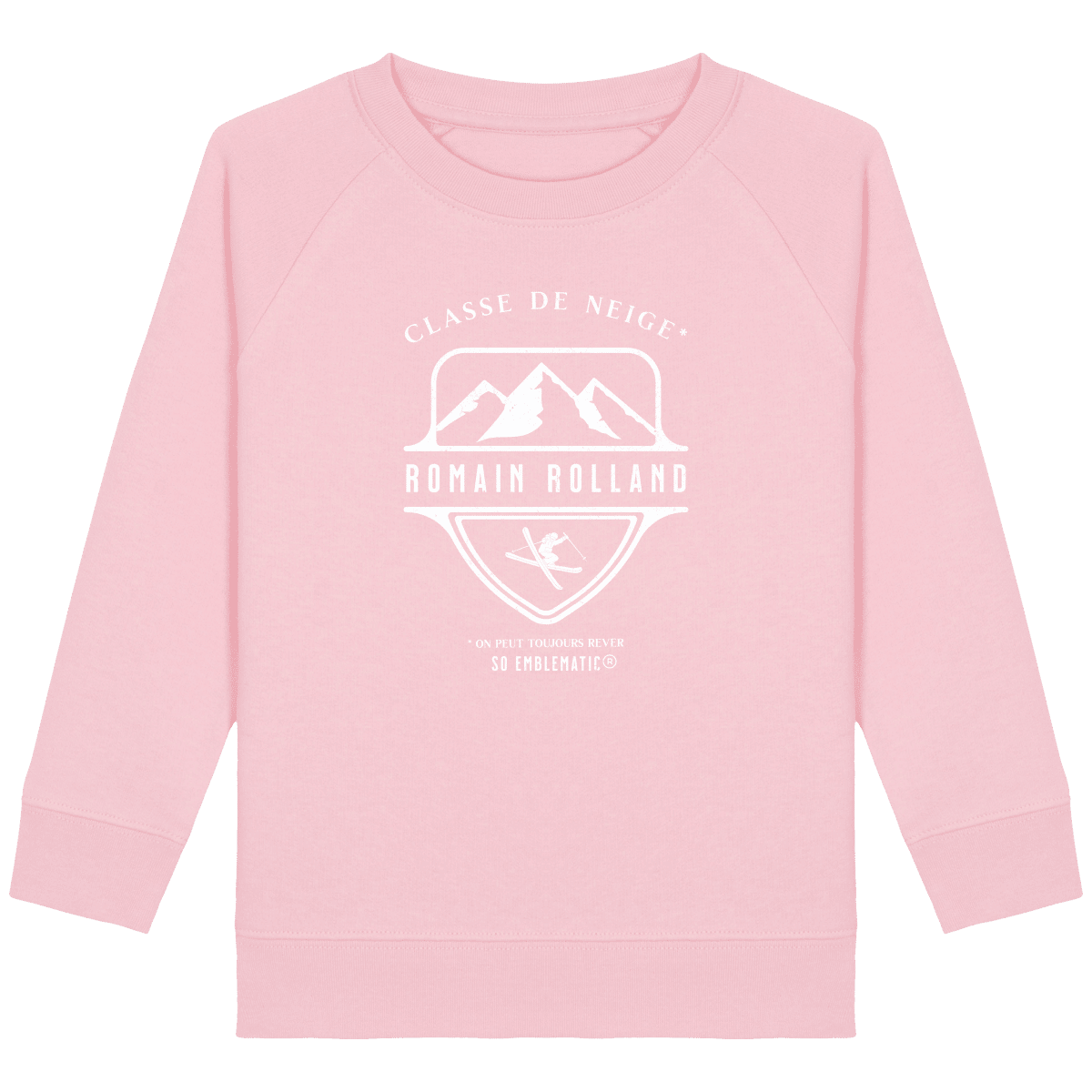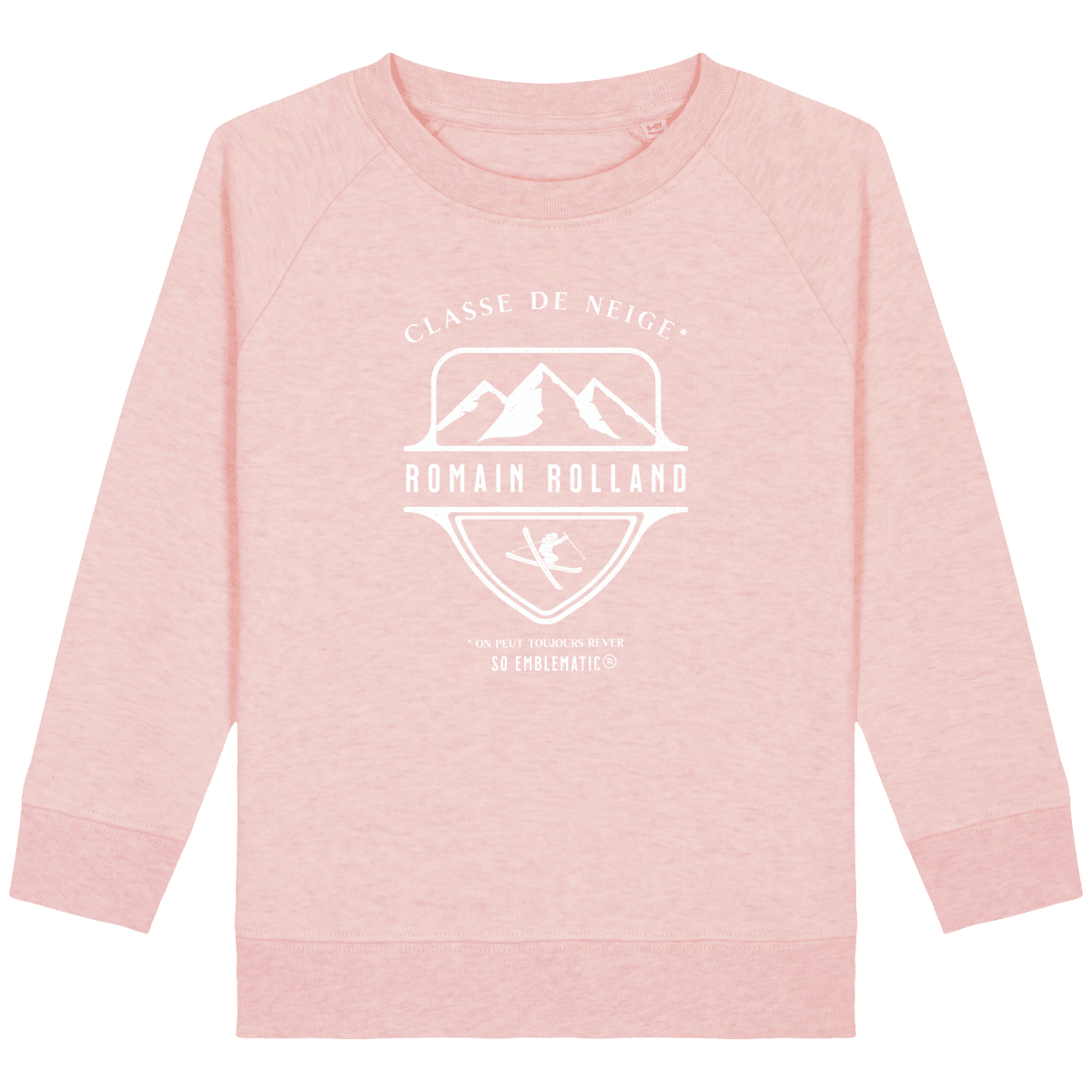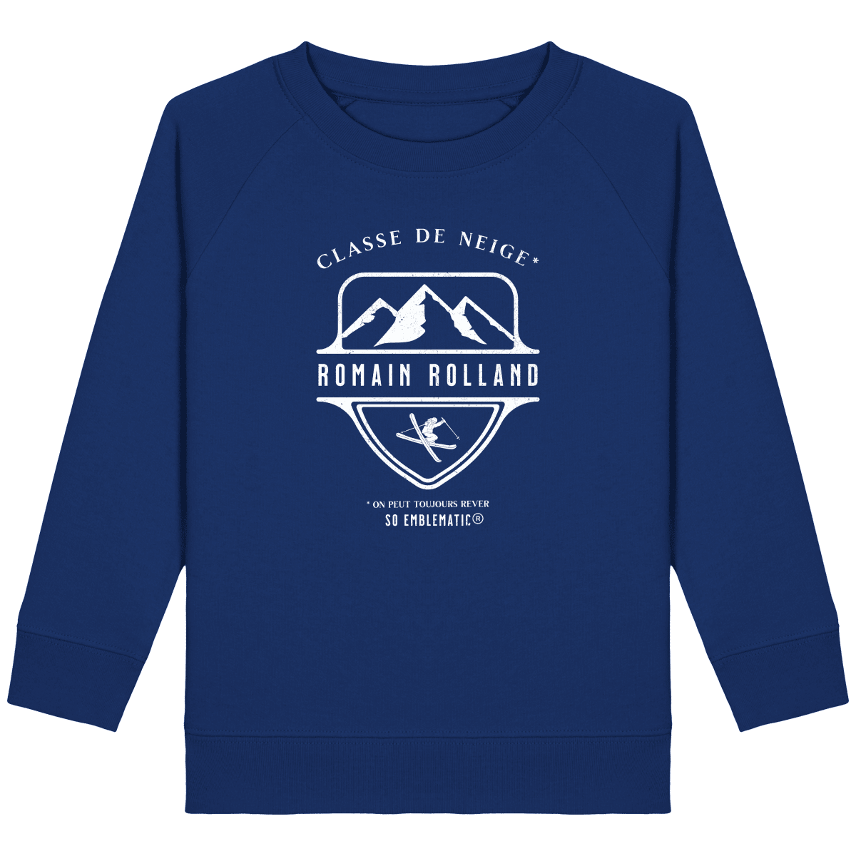 Sweat Enfant Classe de neige ROMAIN ROLLAND. Sweat enfant col rond en coton BIO de la marque STANLEY STELLA. Manches raglan, Col en côte 1×1. Bande de propreté intérieur col en jersey. 1/2 lune intérieur col dans la matière principale, Côte 1×1 au bas de manches et bas de corps. Surpiqûre double aux emmanchures, bas de manches et bas de corps. Sweat intérieur en molleton non brossé (non duveteux). 85% coton biologique filé et peigné, 15% polyester recyclé. Coupe normale du 3/4 ans au 12/14 ans. 300 G/M².