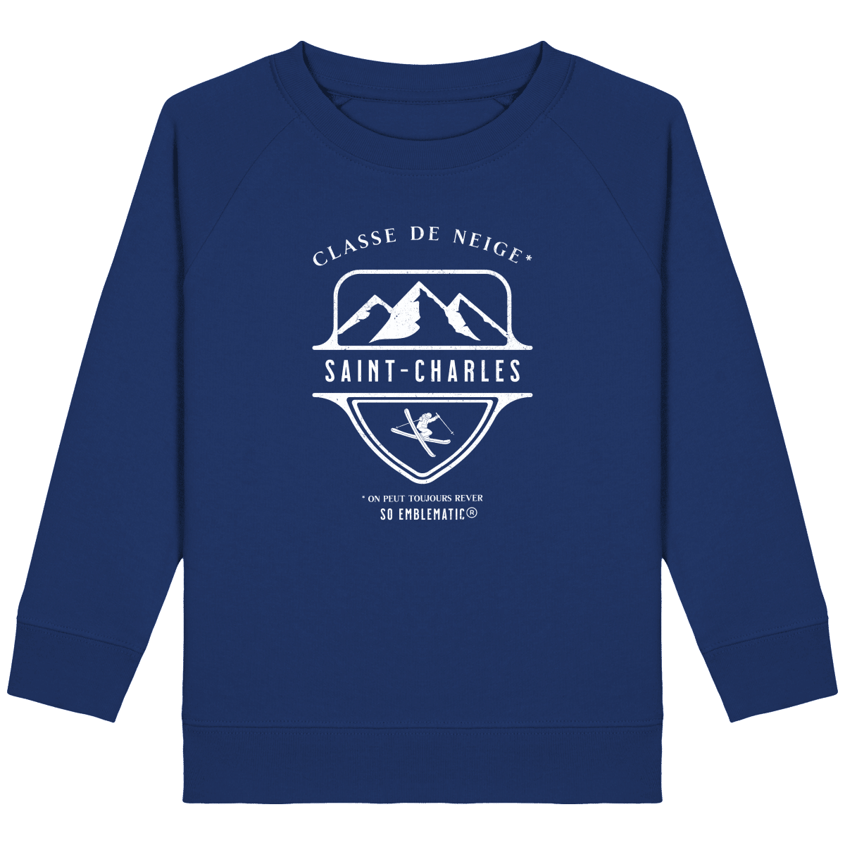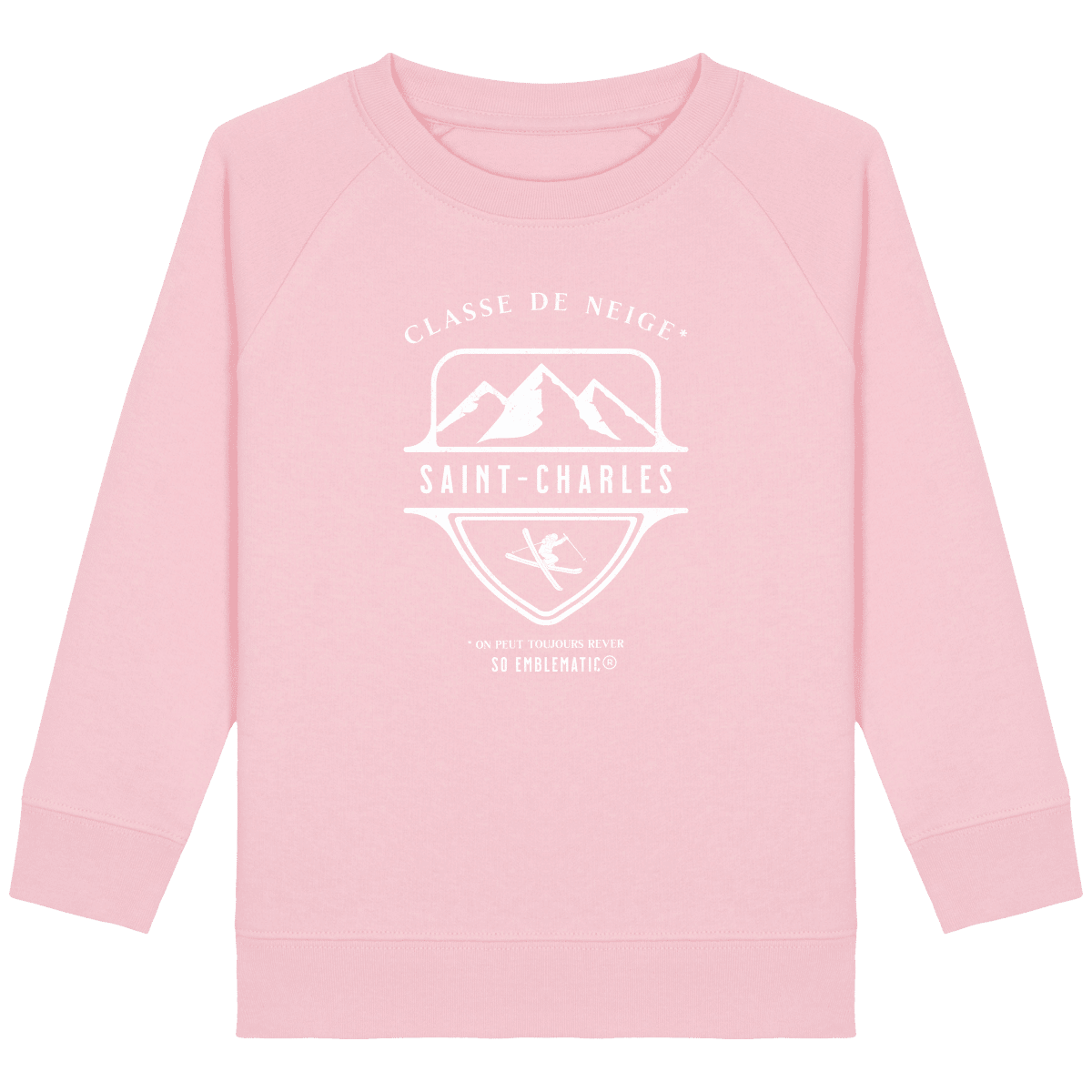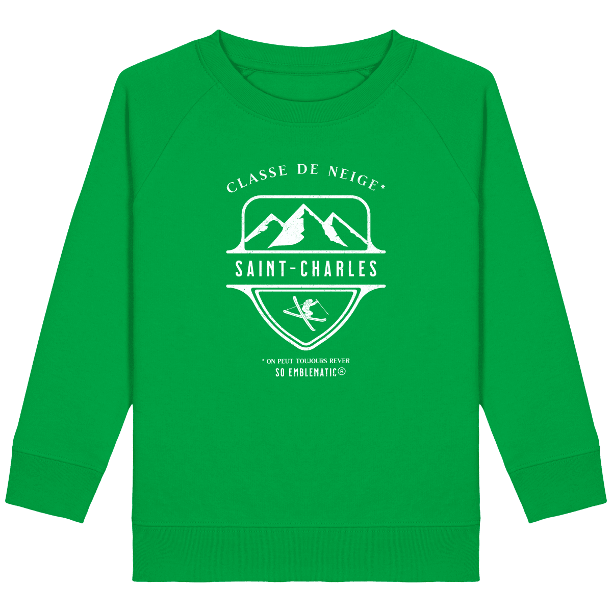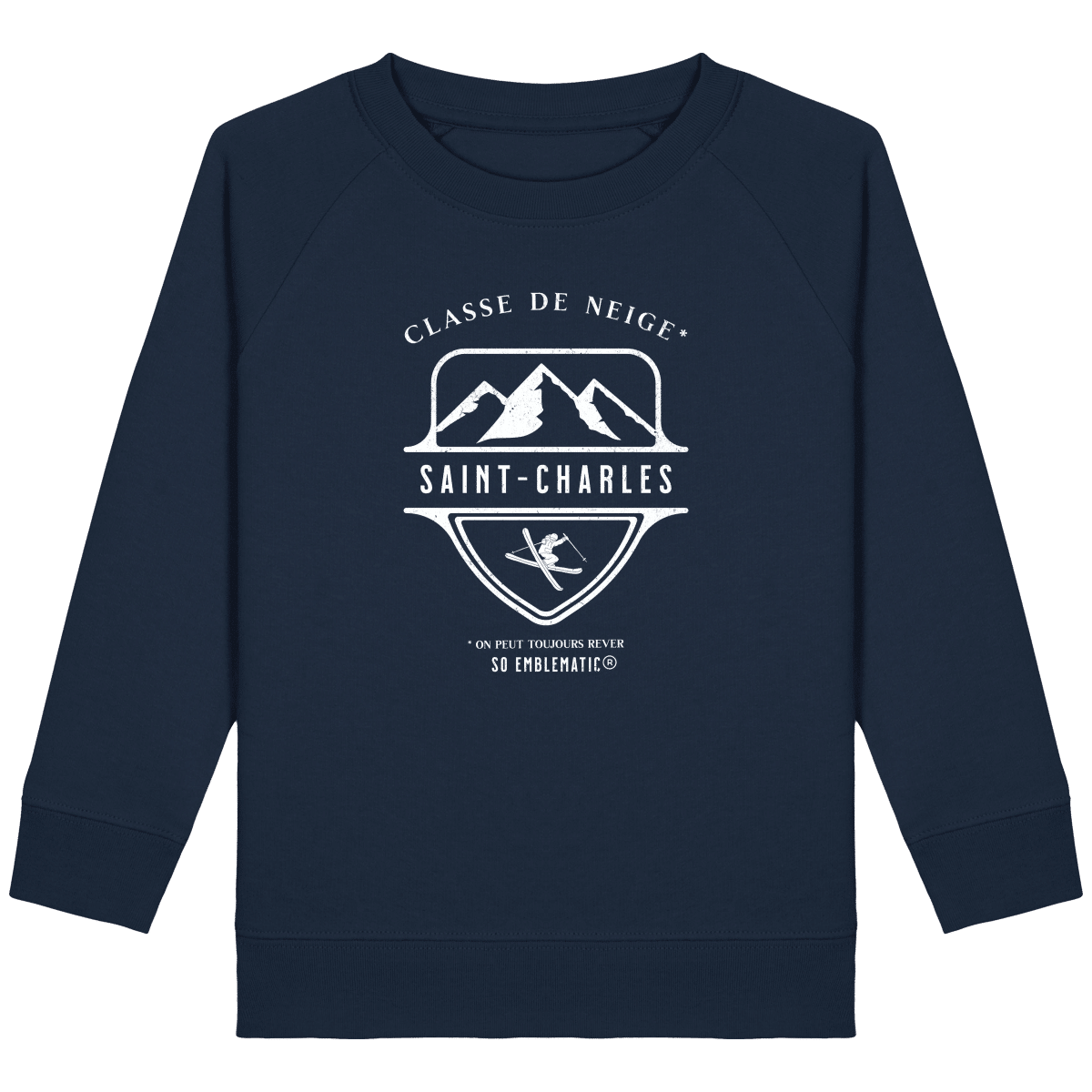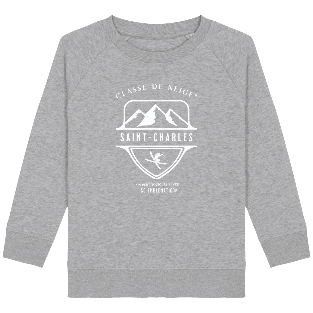 Sweat Enfant Classe de neige Saint-Charles. Sweat enfant col rond en coton BIO de la marque STANLEY STELLA. Manches raglan, Col en côte 1×1. Bande de propreté intérieur col en jersey. 1/2 lune intérieur col dans la matière principale, Côte 1×1 au bas de manches et bas de corps. Surpiqûre double aux emmanchures, bas de manches et bas de corps. Sweat intérieur en molleton non brossé (non duveteux). 85% coton biologique filé et peigné, 15% polyester recyclé. Coupe normale du 3/4 ans au 12/14 ans. 300 G/M².