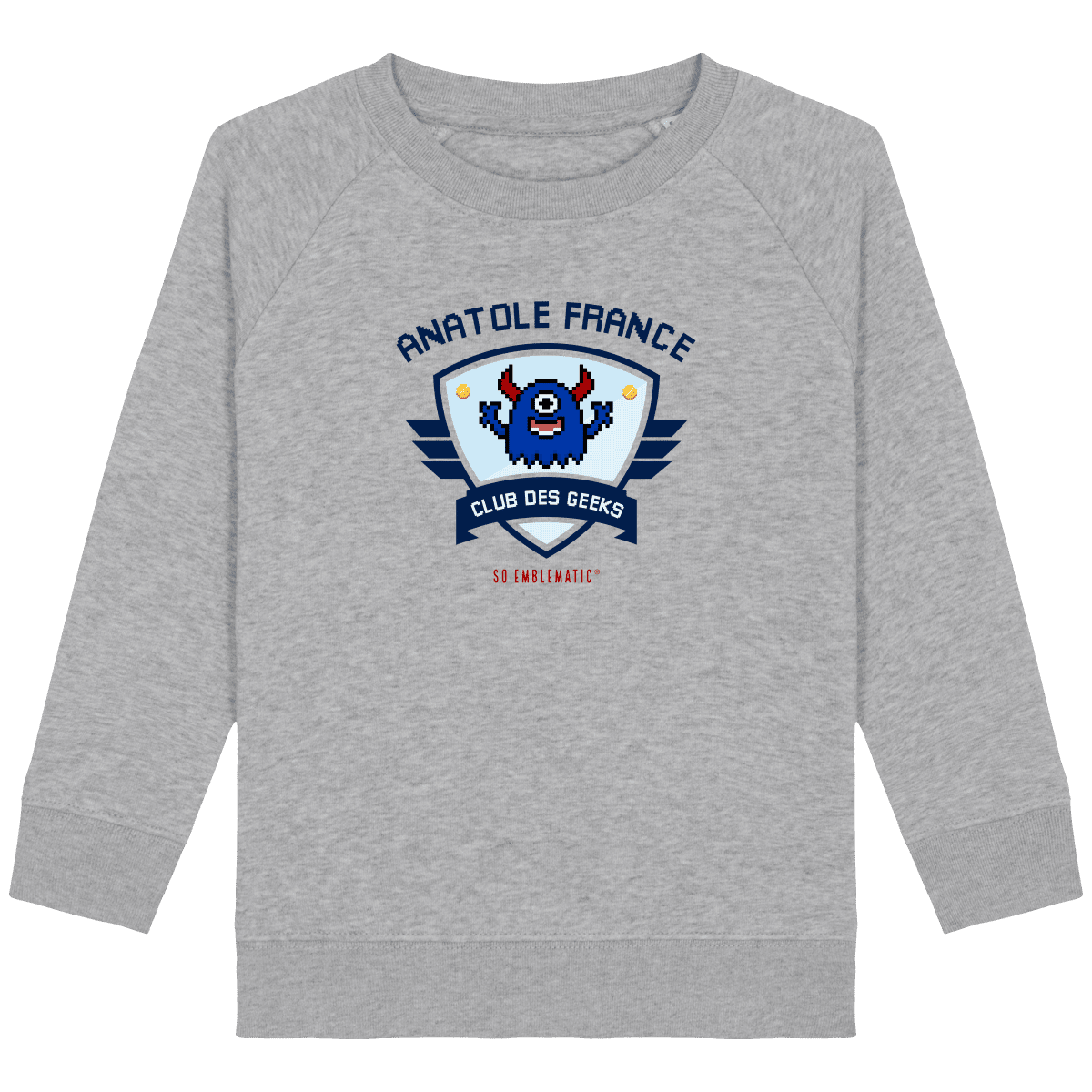 Sweat Enfant CLUB DES GEEKS ANATOLE FRANCE. Sweat enfant col rond en coton BIO de la marque STANLEY STELLA. Manches raglan, Col en côte 1×1. Bande de propreté intérieur col en jersey. 1/2 lune intérieur col dans la matière principale, Côte 1×1 au bas de manches et bas de corps. Surpiqûre double aux emmanchures, bas de manches et bas de corps. Sweat intérieur en molleton non brossé (non duveteux). 85% coton biologique filé et peigné, 15% polyester recyclé. Coupe normale du 3/4 ans au 12/14 ans. 300 G/M².