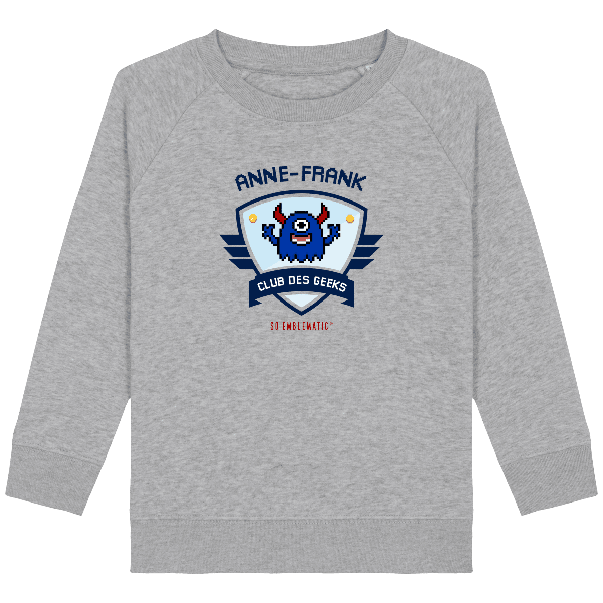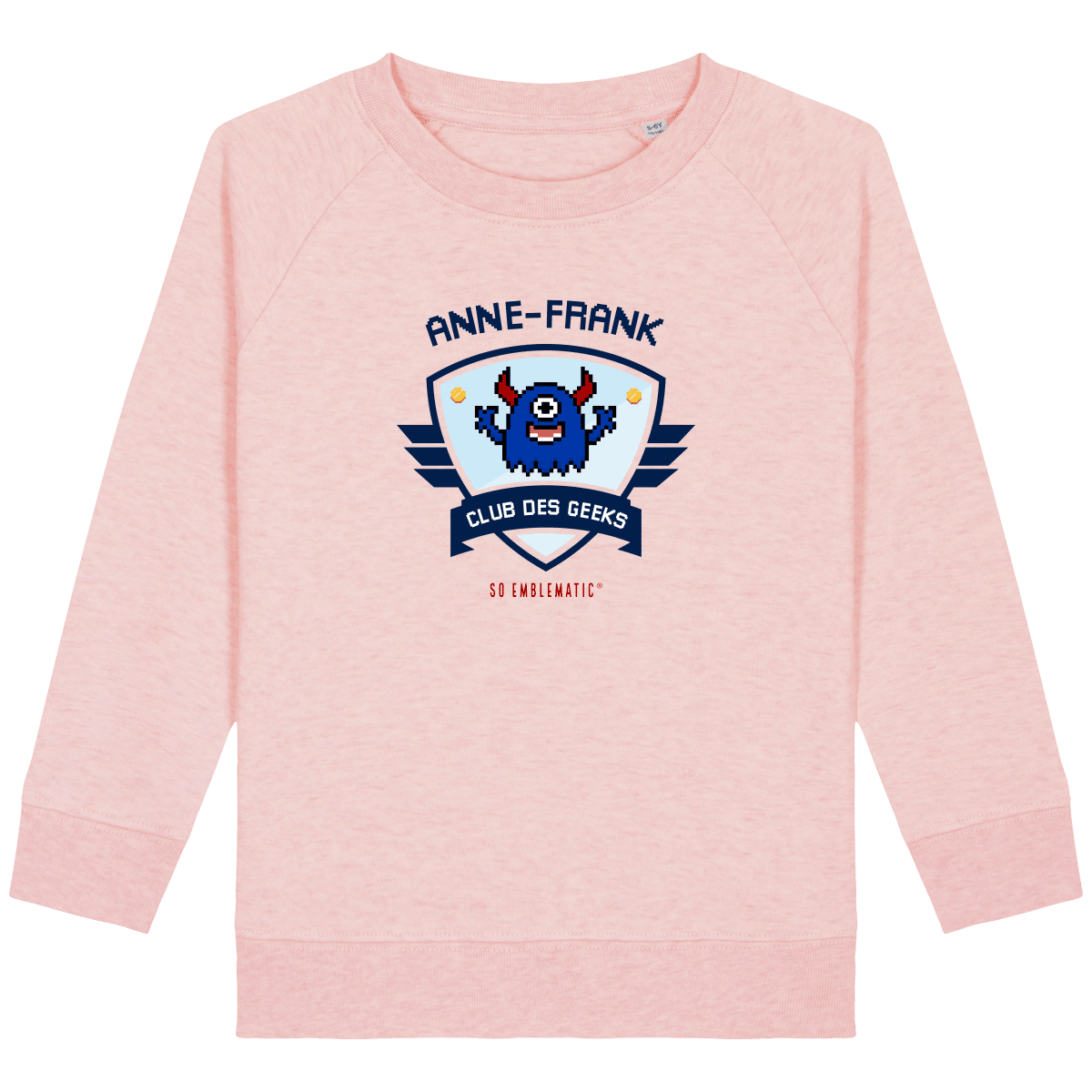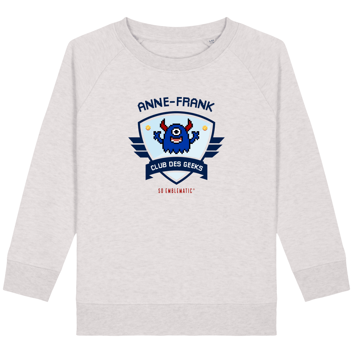 Sweat Enfant CLUB DES GEEKS ANNE FRANK. Sweat enfant col rond en coton BIO de la marque STANLEY STELLA. Manches raglan, Col en côte 1×1. Bande de propreté intérieur col en jersey. 1/2 lune intérieur col dans la matière principale, Côte 1×1 au bas de manches et bas de corps. Surpiqûre double aux emmanchures, bas de manches et bas de corps. Sweat intérieur en molleton non brossé (non duveteux). 85% coton biologique filé et peigné, 15% polyester recyclé. Coupe normale du 3/4 ans au 12/14 ans. 300 G/M².