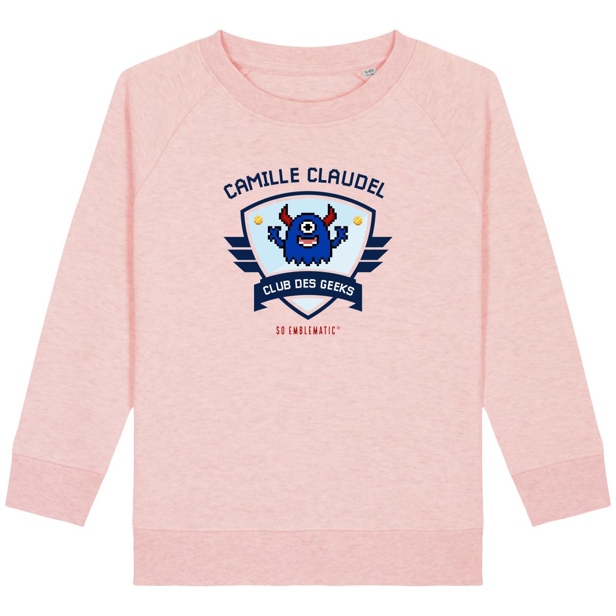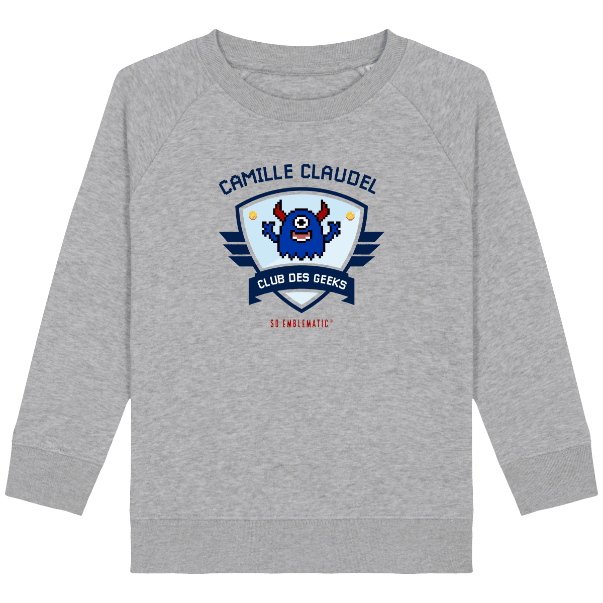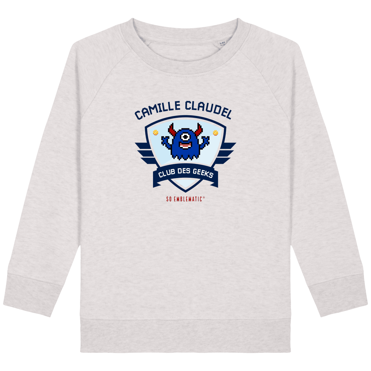 Sweat Enfant CLUB DES GEEKS CAMILLE CLAUDEL. Sweat enfant col rond en coton BIO de la marque STANLEY STELLA. Manches raglan, Col en côte 1×1. Bande de propreté intérieur col en jersey. 1/2 lune intérieur col dans la matière principale, Côte 1×1 au bas de manches et bas de corps. Surpiqûre double aux emmanchures, bas de manches et bas de corps. Sweat intérieur en molleton non brossé (non duveteux). 85% coton biologique filé et peigné, 15% polyester recyclé. Coupe normale du 3/4 ans au 12/14 ans. 300 G/M².