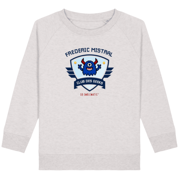 Sweat Enfant CLUB DES GEEKS FREDERIC MISTRAL. Sweat enfant col rond en coton BIO de la marque STANLEY STELLA. Manches raglan, Col en côte 1×1. Bande de propreté intérieur col en jersey. 1/2 lune intérieur col dans la matière principale, Côte 1×1 au bas de manches et bas de corps. Surpiqûre double aux emmanchures, bas de manches et bas de corps. Sweat intérieur en molleton non brossé (non duveteux). 85% coton biologique filé et peigné, 15% polyester recyclé. Coupe normale du 3/4 ans au 12/14 ans. 300 G/M².