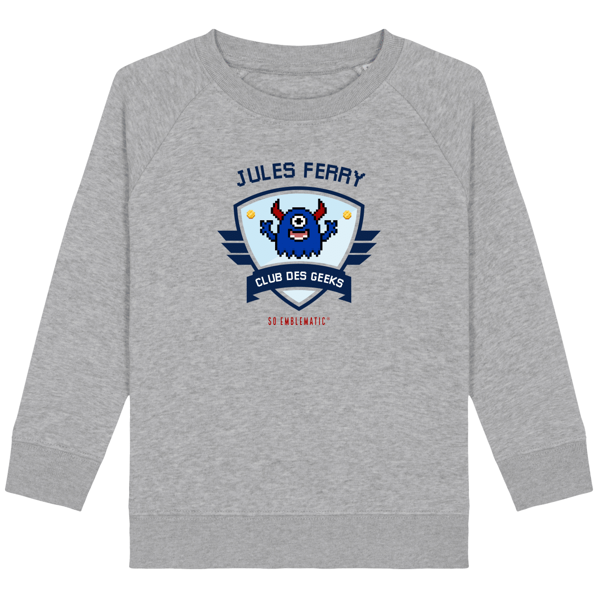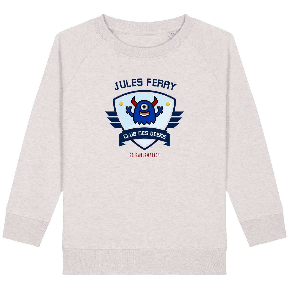 Sweat Enfant CLUB DES GEEKS JULES FERRY. Sweat enfant col rond en coton BIO de la marque STANLEY STELLA. Manches raglan, Col en côte 1×1. Bande de propreté intérieur col en jersey. 1/2 lune intérieur col dans la matière principale, Côte 1×1 au bas de manches et bas de corps. Surpiqûre double aux emmanchures, bas de manches et bas de corps. Sweat intérieur en molleton non brossé (non duveteux). 85% coton biologique filé et peigné, 15% polyester recyclé. Coupe normale du 3/4 ans au 12/14 ans. 300 G/M².
