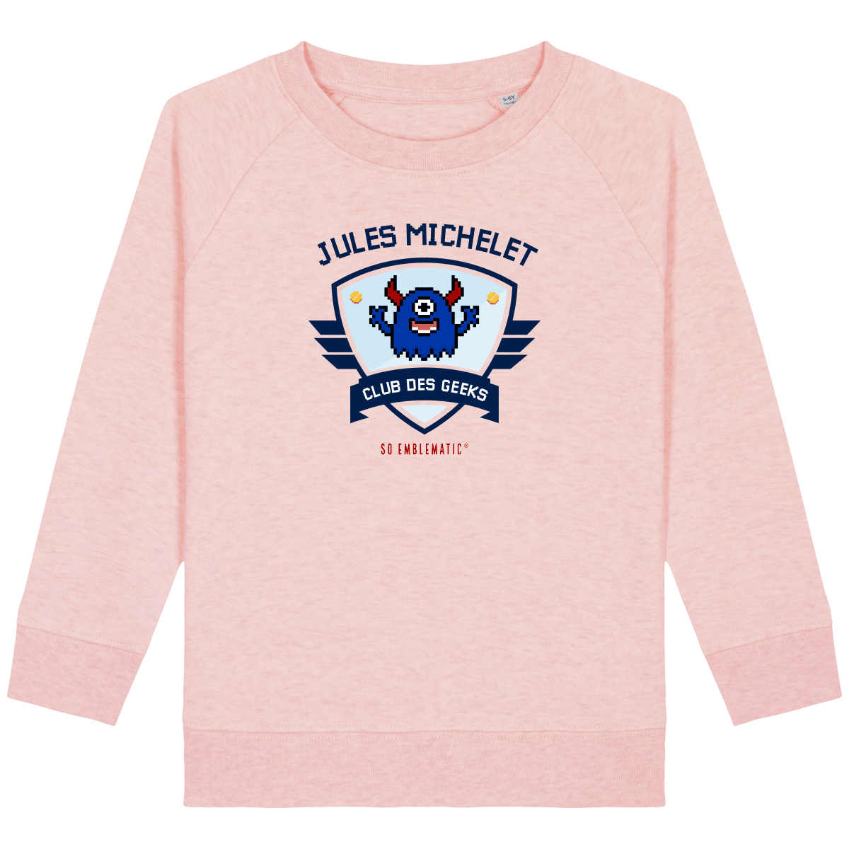 Sweat Enfant CLUB DES GEEKS JULES MICHELET. Sweat enfant col rond en coton BIO de la marque STANLEY STELLA. Manches raglan, Col en côte 1×1. Bande de propreté intérieur col en jersey. 1/2 lune intérieur col dans la matière principale, Côte 1×1 au bas de manches et bas de corps. Surpiqûre double aux emmanchures, bas de manches et bas de corps. Sweat intérieur en molleton non brossé (non duveteux). 85% coton biologique filé et peigné, 15% polyester recyclé. Coupe normale du 3/4 ans au 12/14 ans. 300 G/M².