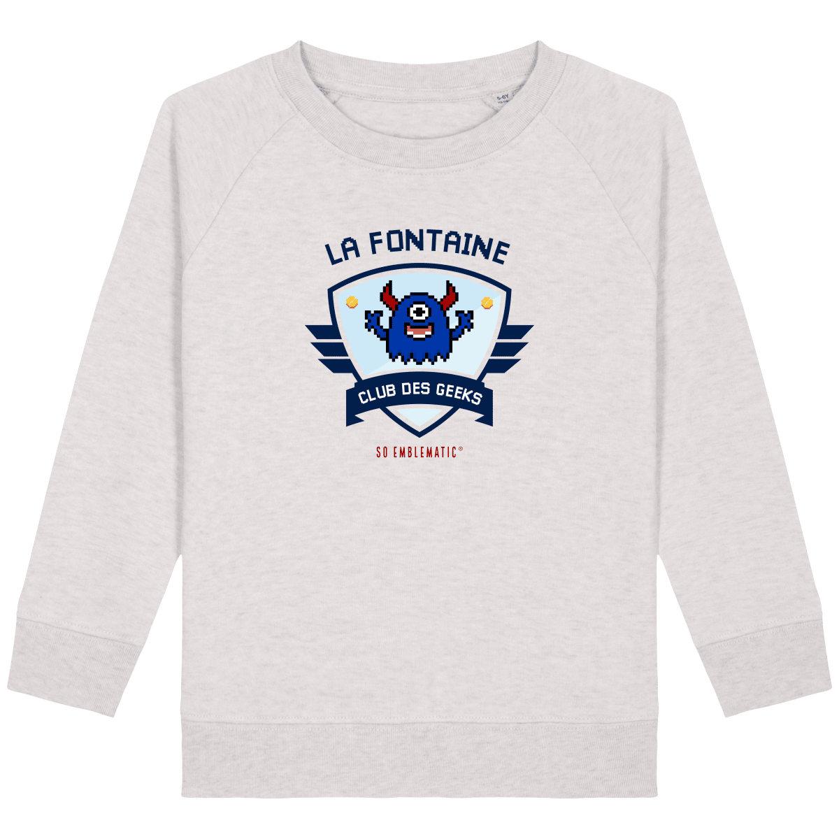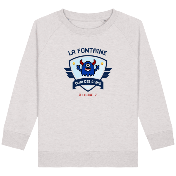 Sweat Enfant CLUB DES GEEKS LA FONTAINE. Sweat enfant col rond en coton BIO de la marque STANLEY STELLA. Manches raglan, Col en côte 1×1. Bande de propreté intérieur col en jersey. 1/2 lune intérieur col dans la matière principale, Côte 1×1 au bas de manches et bas de corps. Surpiqûre double aux emmanchures, bas de manches et bas de corps. Sweat intérieur en molleton non brossé (non duveteux). 85% coton biologique filé et peigné, 15% polyester recyclé. Coupe normale du 3/4 ans au 12/14 ans. 300 G/M².