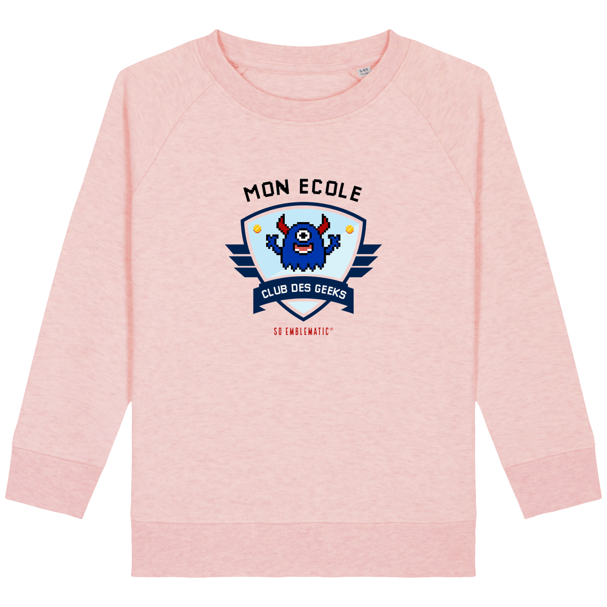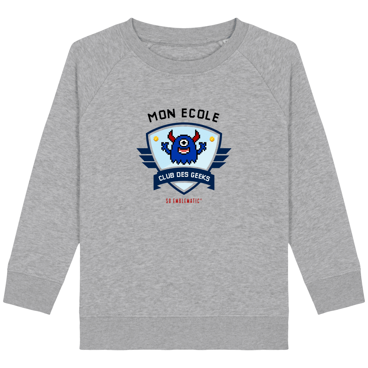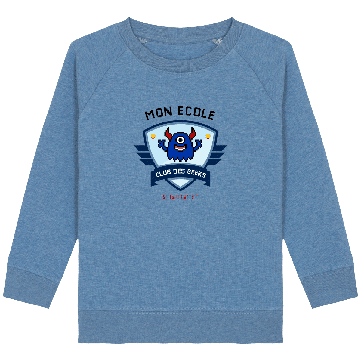 Sweat Enfant CLUB DES GEEKS MON ECOLE. Sweat enfant col rond en coton BIO de la marque STANLEY STELLA. Manches raglan, Col en côte 1×1. Bande de propreté intérieur col en jersey. 1/2 lune intérieur col dans la matière principale, Côte 1×1 au bas de manches et bas de corps. Surpiqûre double aux emmanchures, bas de manches et bas de corps. Sweat intérieur en molleton non brossé (non duveteux). 85% coton biologique filé et peigné, 15% polyester recyclé. Coupe normale du 3/4 ans au 12/14 ans. 300 G/M².
