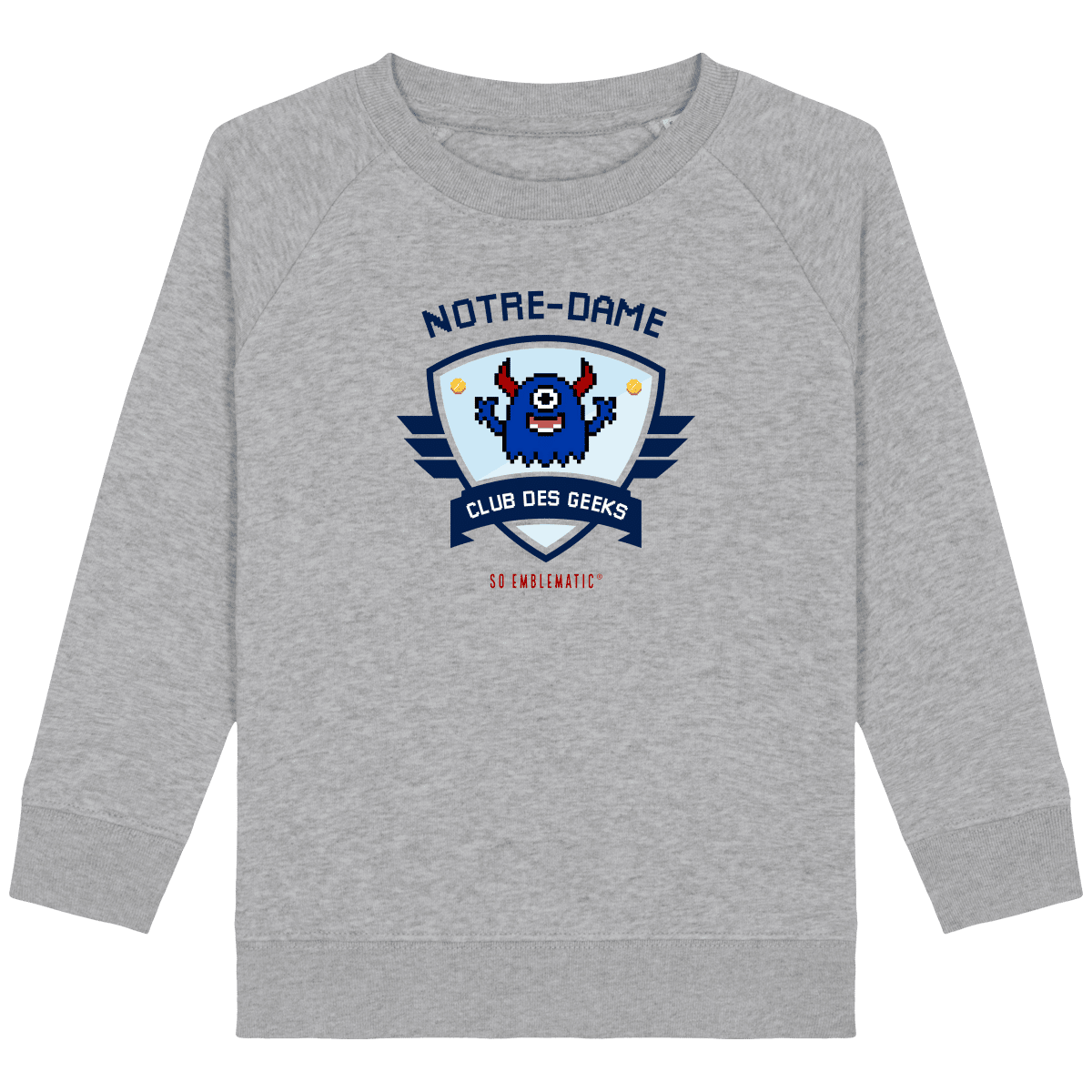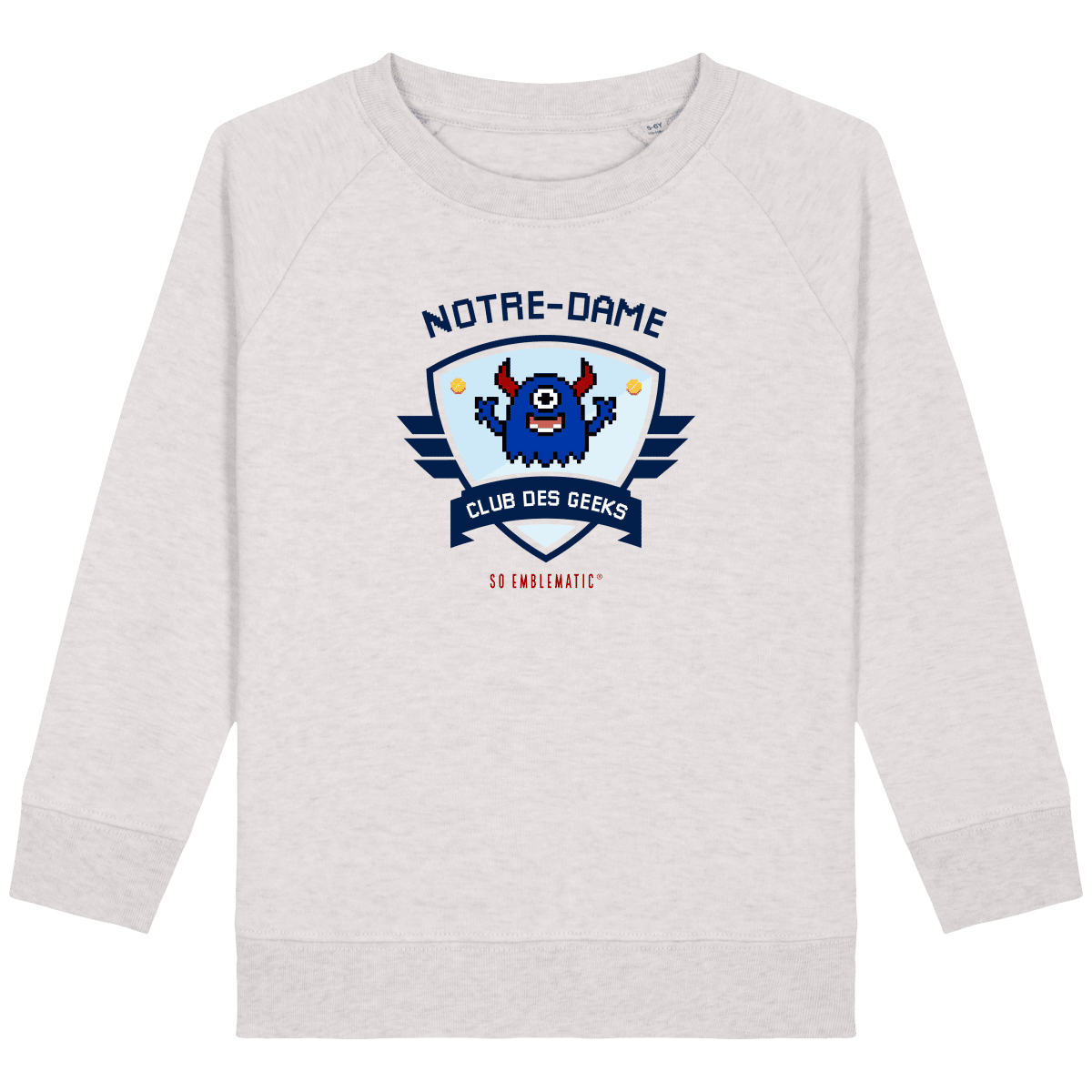 Sweat Enfant CLUB DES GEEKS NOTRE DAME. Sweat enfant col rond en coton BIO de la marque STANLEY STELLA. Manches raglan, Col en côte 1×1. Bande de propreté intérieur col en jersey. 1/2 lune intérieur col dans la matière principale, Côte 1×1 au bas de manches et bas de corps. Surpiqûre double aux emmanchures, bas de manches et bas de corps. Sweat intérieur en molleton non brossé (non duveteux). 85% coton biologique filé et peigné, 15% polyester recyclé. Coupe normale du 3/4 ans au 12/14 ans. 300 G/M².