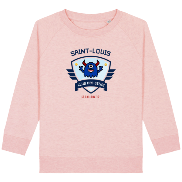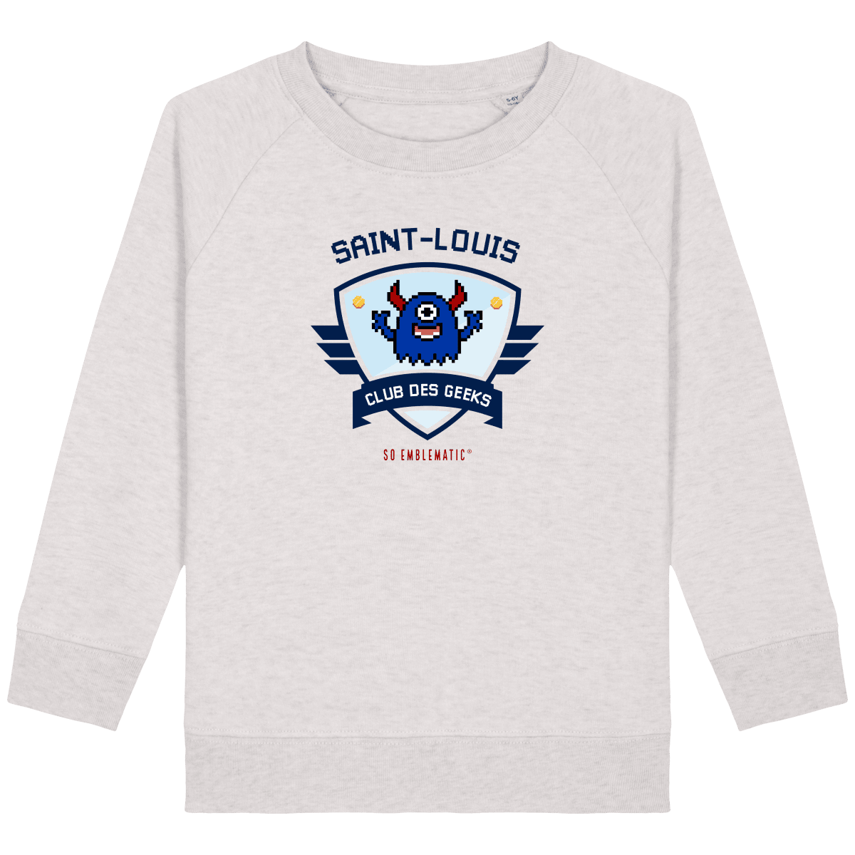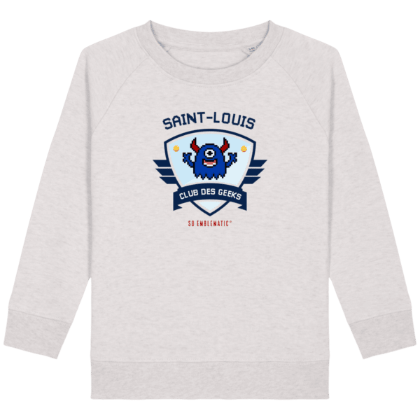 Sweat Enfant CLUB DES GEEKS SAINT-LOUIS. Sweat enfant col rond en coton BIO de la marque STANLEY STELLA. Manches raglan, Col en côte 1×1. Bande de propreté intérieur col en jersey. 1/2 lune intérieur col dans la matière principale, Côte 1×1 au bas de manches et bas de corps. Surpiqûre double aux emmanchures, bas de manches et bas de corps. Sweat intérieur en molleton non brossé (non duveteux). 85% coton biologique filé et peigné, 15% polyester recyclé. Coupe normale du 3/4 ans au 12/14 ans. 300 G/M².