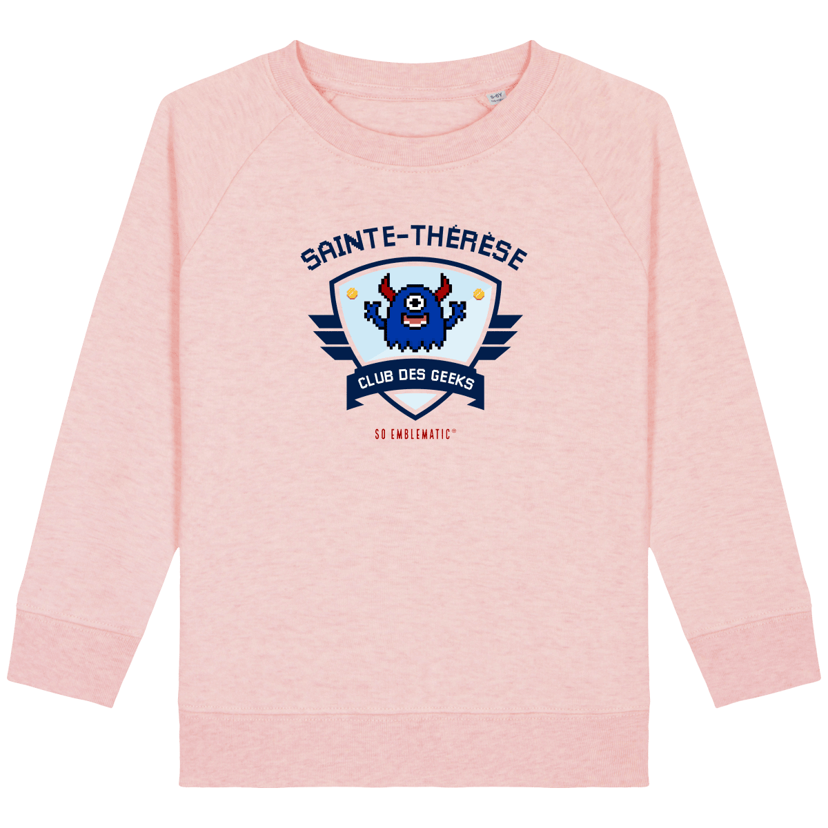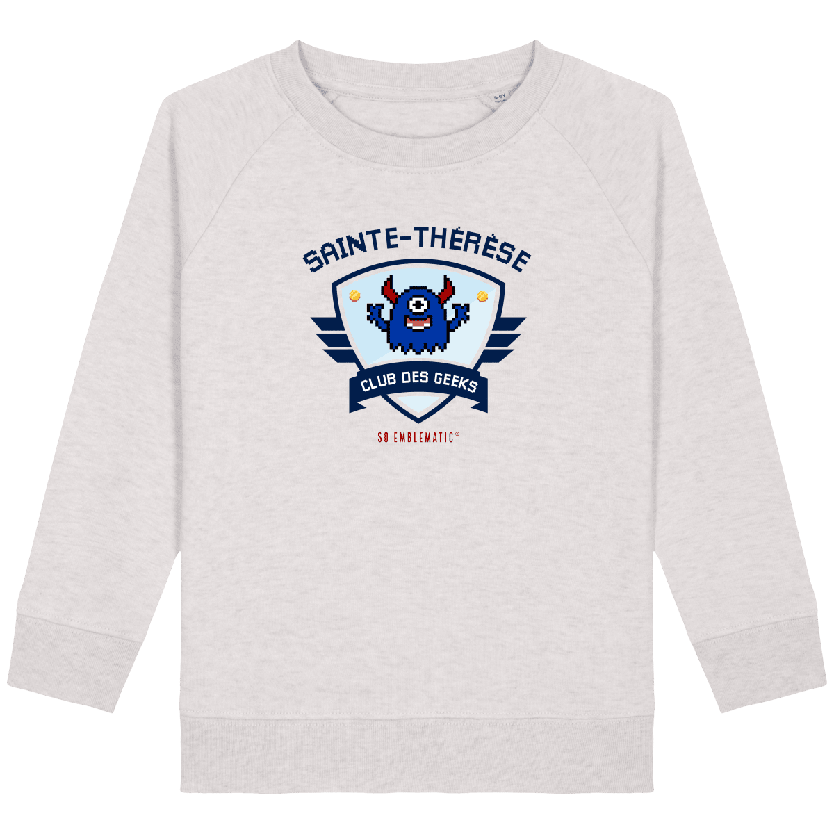 Sweat Enfant CLUB DES GEEKS SAINTE-THERESE. Sweat enfant col rond en coton BIO de la marque STANLEY STELLA. Manches raglan, Col en côte 1×1. Bande de propreté intérieur col en jersey. 1/2 lune intérieur col dans la matière principale, Côte 1×1 au bas de manches et bas de corps. Surpiqûre double aux emmanchures, bas de manches et bas de corps. Sweat intérieur en molleton non brossé (non duveteux). 85% coton biologique filé et peigné, 15% polyester recyclé. Coupe normale du 3/4 ans au 12/14 ans. 300 G/M².