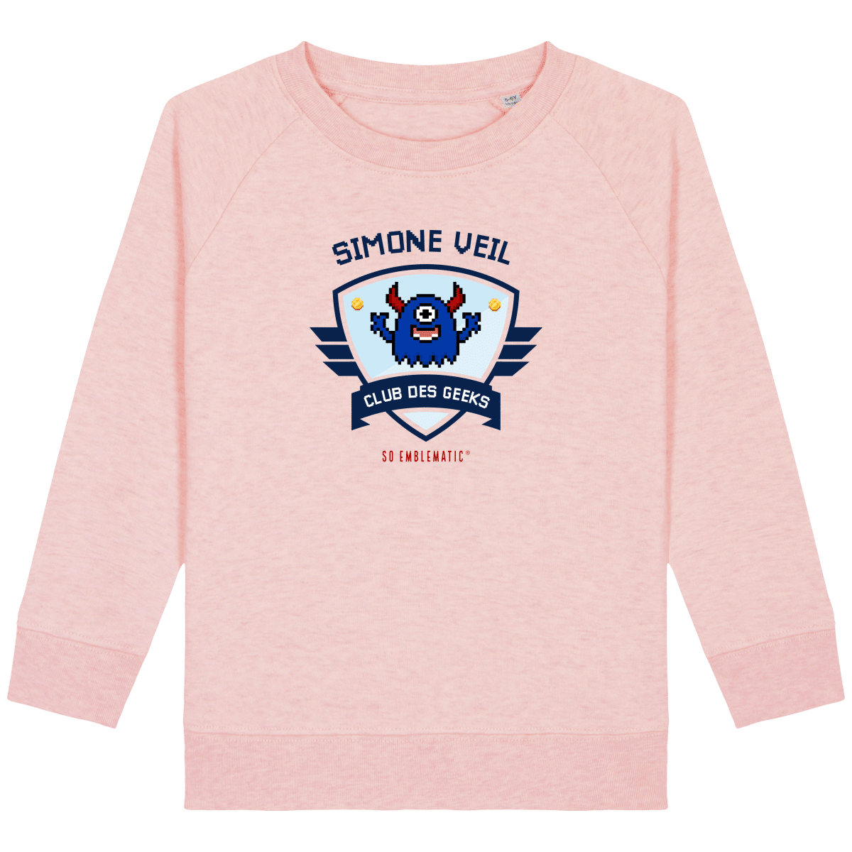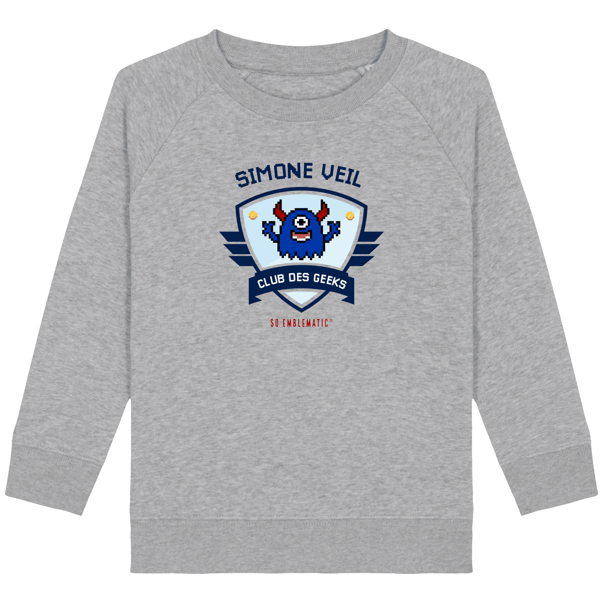 Sweat Enfant CLUB DES GEEKS SIMONE VEIL. Sweat enfant col rond en coton BIO de la marque STANLEY STELLA. Manches raglan, Col en côte 1×1. Bande de propreté intérieur col en jersey. 1/2 lune intérieur col dans la matière principale, Côte 1×1 au bas de manches et bas de corps. Surpiqûre double aux emmanchures, bas de manches et bas de corps. Sweat intérieur en molleton non brossé (non duveteux). 85% coton biologique filé et peigné, 15% polyester recyclé. Coupe normale du 3/4 ans au 12/14 ans. 300 G/M².