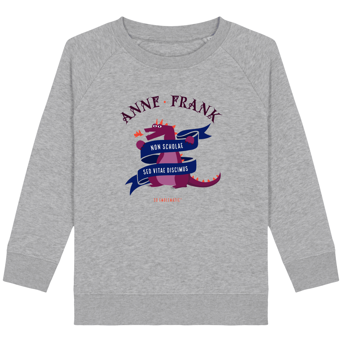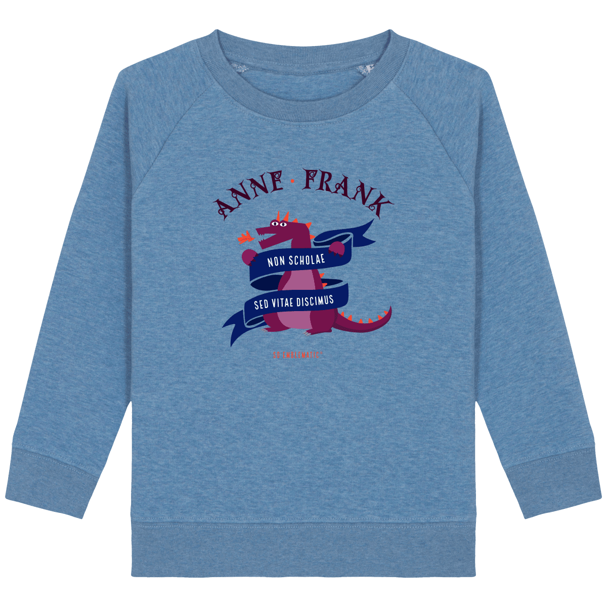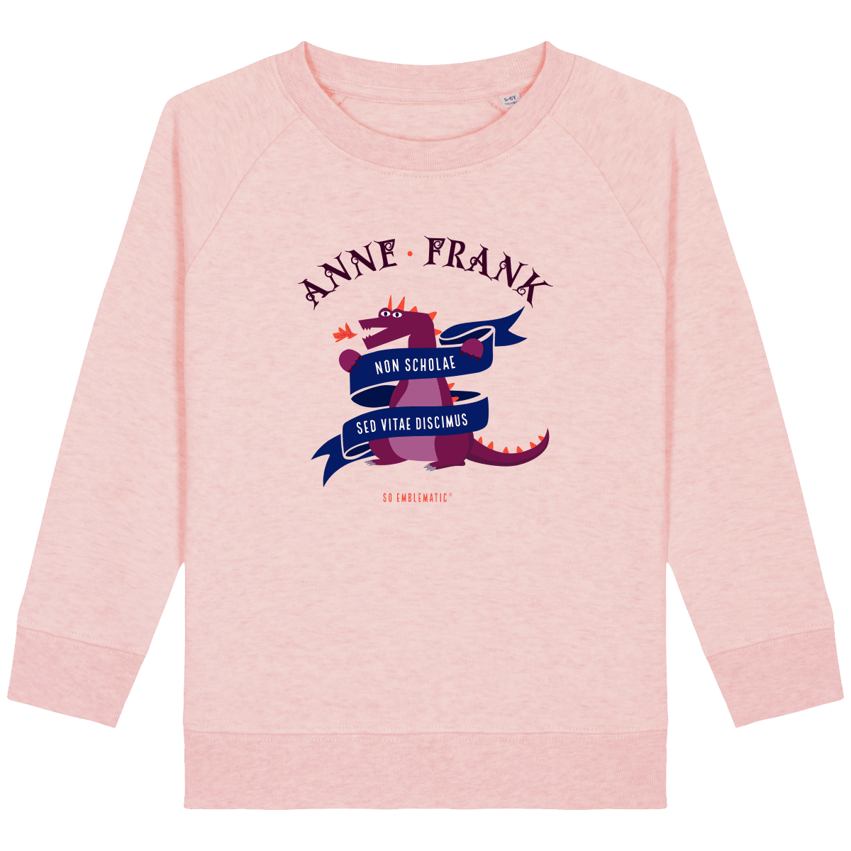 Sweat Enfant DRAGON ANNE FRANK. Sweat enfant col rond en coton BIO de la marque STANLEY STELLA. Manches raglan, Col en côte 1×1. Bande de propreté intérieur col en jersey. 1/2 lune intérieur col dans la matière principale, Côte 1×1 au bas de manches et bas de corps. Surpiqûre double aux emmanchures, bas de manches et bas de corps. Sweat intérieur en molleton non brossé (non duveteux). 85% coton biologique filé et peigné, 15% polyester recyclé. Coupe normale du 3/4 ans au 12/14 ans. 300 G/M².