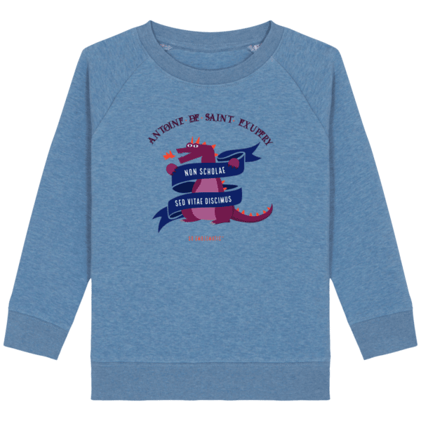 Sweat Enfant DRAGON ANTOINE DE SAINT-EXUPERY. Sweat enfant col rond en coton BIO de la marque STANLEY STELLA. Manches raglan, Col en côte 1×1. Bande de propreté intérieur col en jersey. 1/2 lune intérieur col dans la matière principale, Côte 1×1 au bas de manches et bas de corps. Surpiqûre double aux emmanchures, bas de manches et bas de corps. Sweat intérieur en molleton non brossé (non duveteux). 85% coton biologique filé et peigné, 15% polyester recyclé. Coupe normale du 3/4 ans au 12/14 ans. 300 G/M².