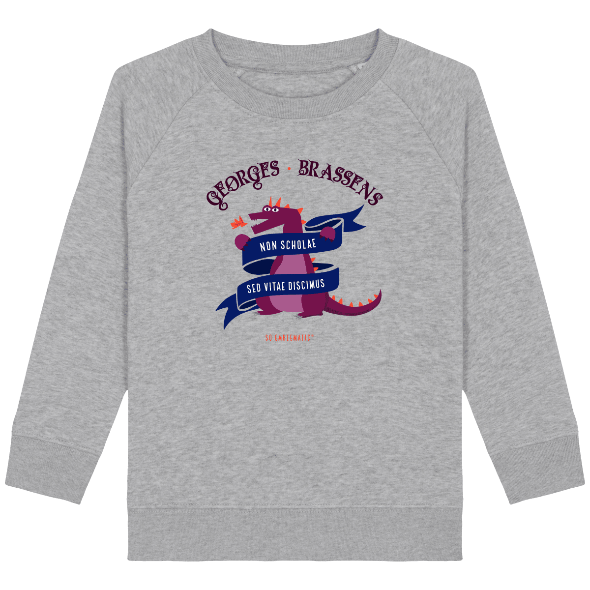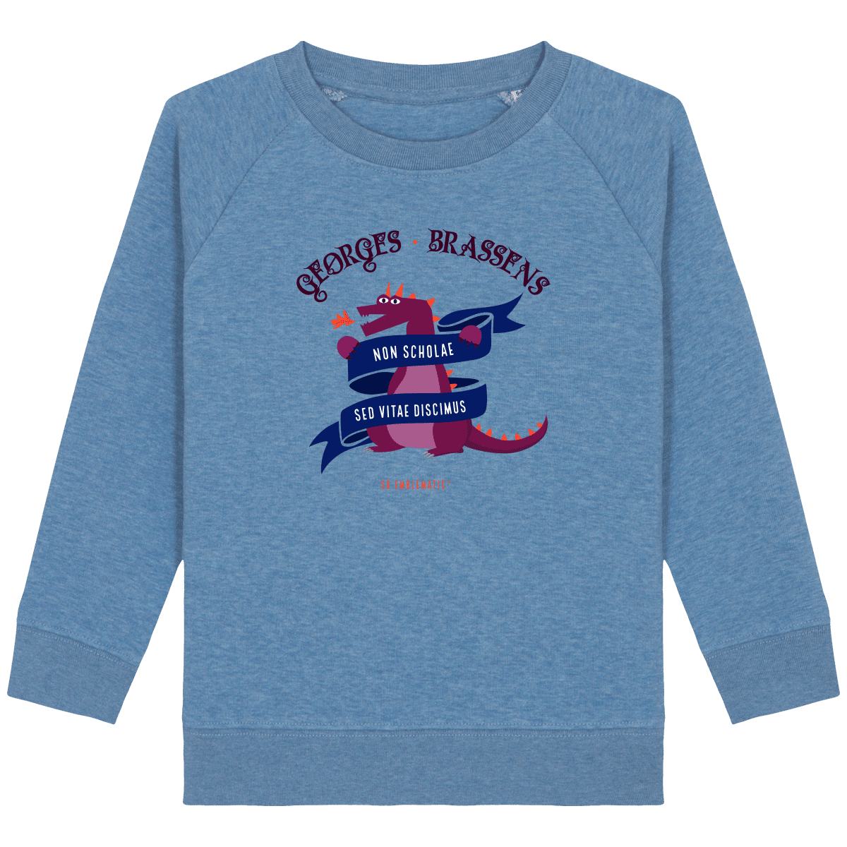 Sweat Enfant DRAGON GEORGES BRASSENS. Sweat enfant col rond en coton BIO de la marque STANLEY STELLA. Manches raglan, Col en côte 1×1. Bande de propreté intérieur col en jersey. 1/2 lune intérieur col dans la matière principale, Côte 1×1 au bas de manches et bas de corps. Surpiqûre double aux emmanchures, bas de manches et bas de corps. Sweat intérieur en molleton non brossé (non duveteux). 85% coton biologique filé et peigné, 15% polyester recyclé. Coupe normale du 3/4 ans au 12/14 ans. 300 G/M².