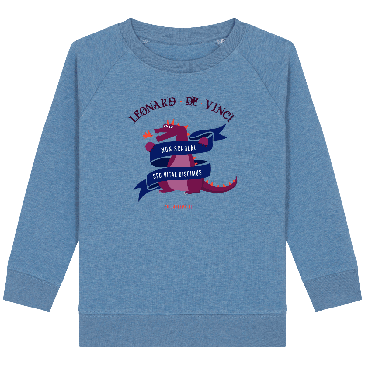 Sweat Enfant DRAGON LEONARD DE VINCI. Sweat enfant col rond en coton BIO de la marque STANLEY STELLA. Manches raglan, Col en côte 1×1. Bande de propreté intérieur col en jersey. 1/2 lune intérieur col dans la matière principale, Côte 1×1 au bas de manches et bas de corps. Surpiqûre double aux emmanchures, bas de manches et bas de corps. Sweat intérieur en molleton non brossé (non duveteux). 85% coton biologique filé et peigné, 15% polyester recyclé. Coupe normale du 3/4 ans au 12/14 ans. 300 G/M².