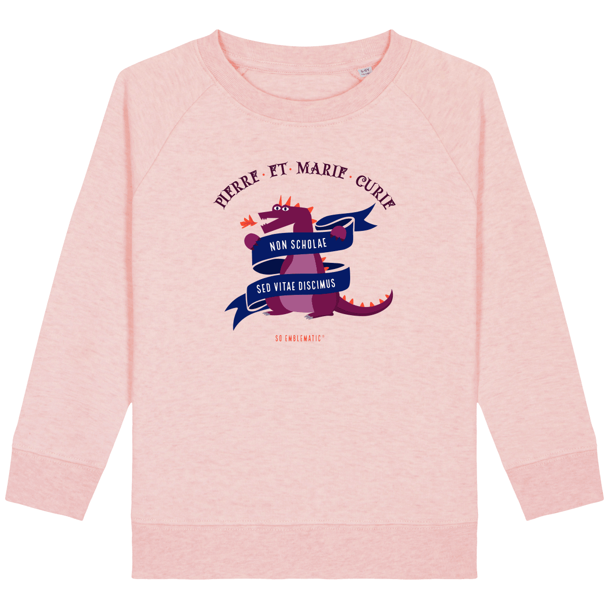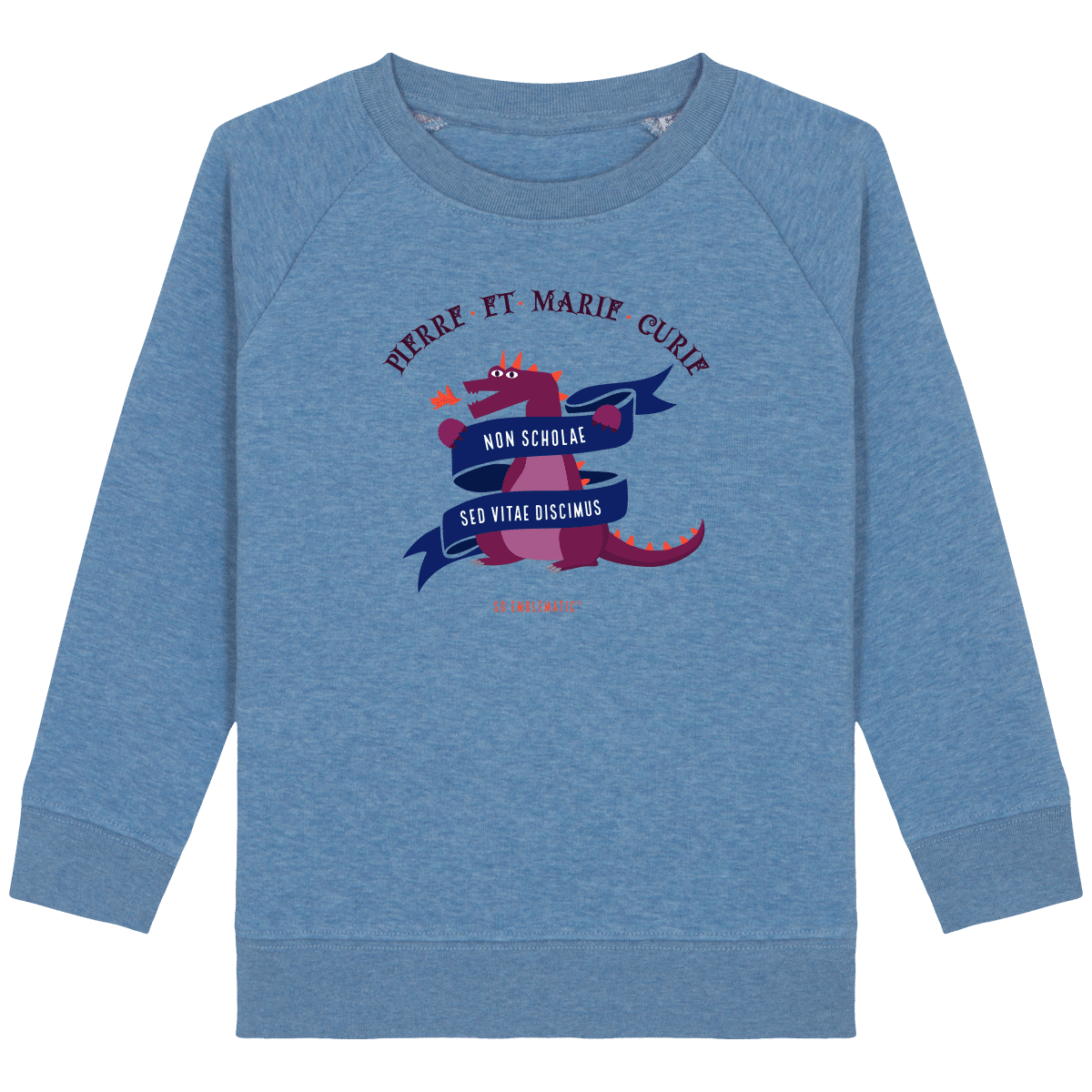Sweat Enfant DRAGON PIERRE ET MARIE CURIE. Sweat enfant col rond en coton BIO de la marque STANLEY STELLA. Manches raglan, Col en côte 1×1. Bande de propreté intérieur col en jersey. 1/2 lune intérieur col dans la matière principale, Côte 1×1 au bas de manches et bas de corps. Surpiqûre double aux emmanchures, bas de manches et bas de corps. Sweat intérieur en molleton non brossé (non duveteux). 85% coton biologique filé et peigné, 15% polyester recyclé. Coupe normale du 3/4 ans au 12/14 ans. 300 G/M².