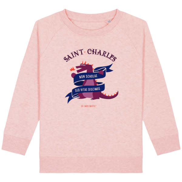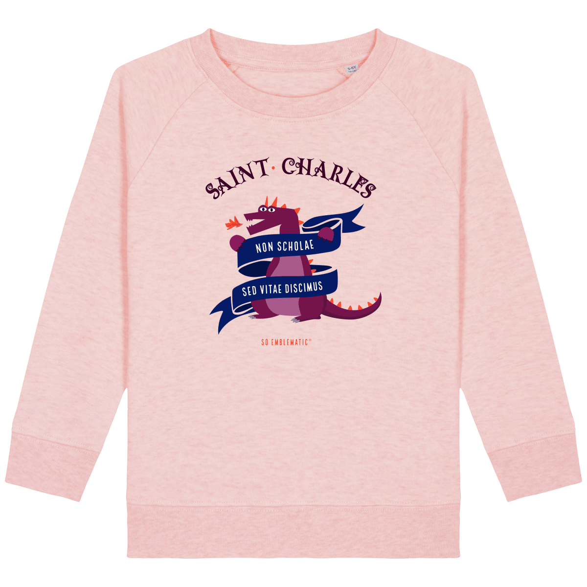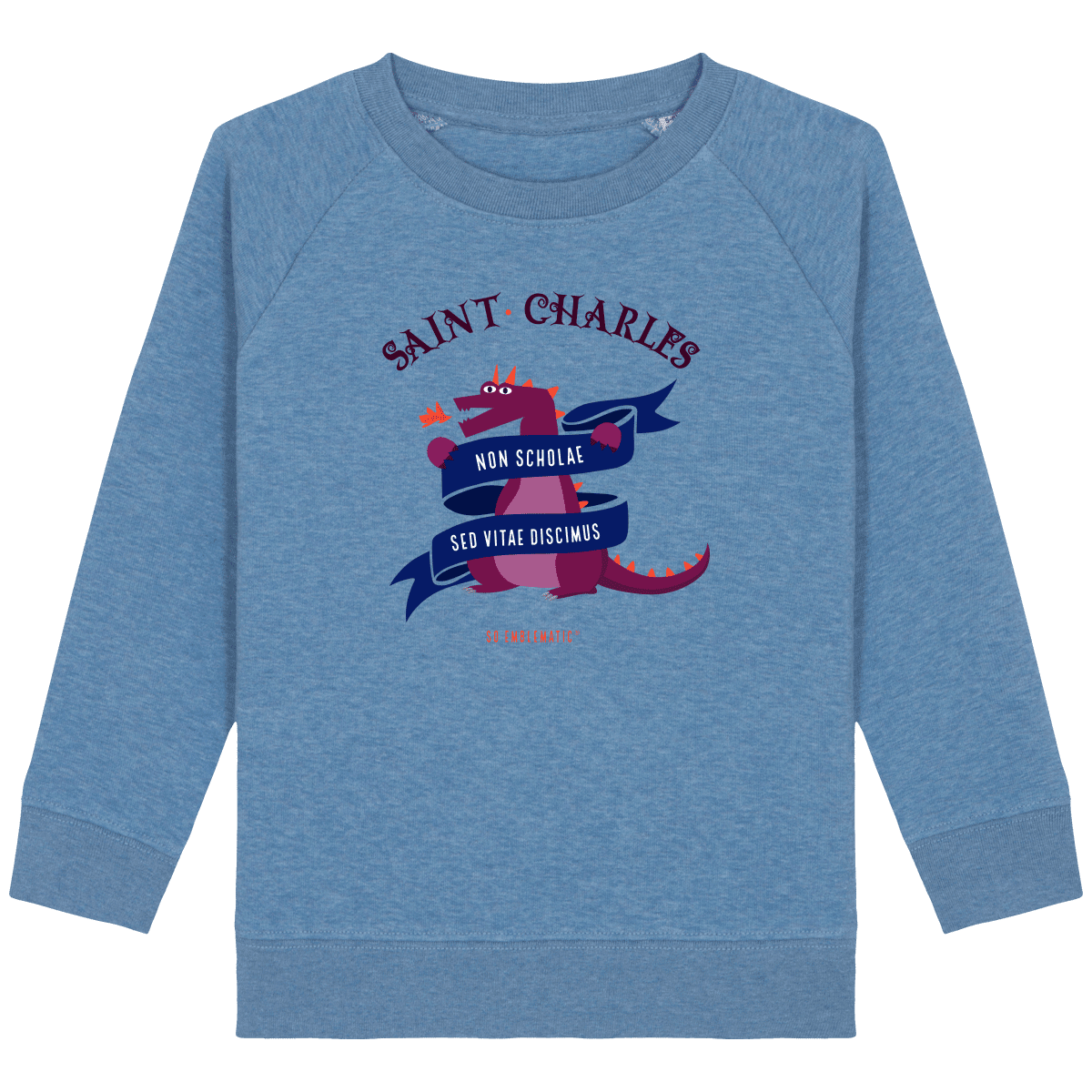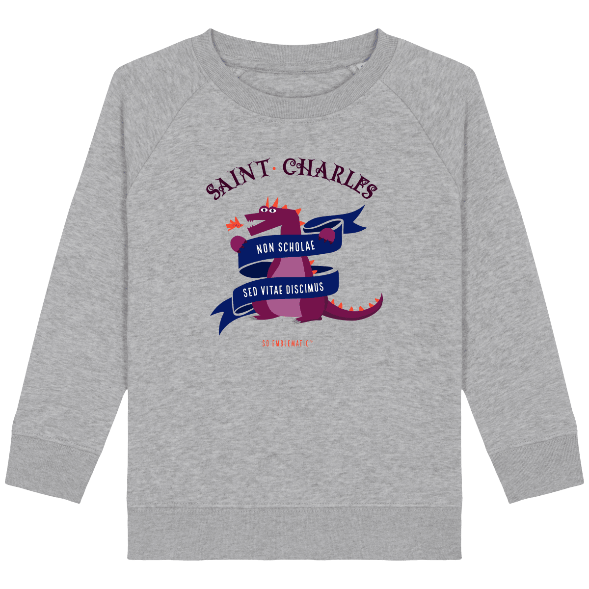 Sweat Enfant DRAGON SAINT-CHARLES. Sweat enfant col rond en coton BIO de la marque STANLEY STELLA. Manches raglan, Col en côte 1×1. Bande de propreté intérieur col en jersey. 1/2 lune intérieur col dans la matière principale, Côte 1×1 au bas de manches et bas de corps. Surpiqûre double aux emmanchures, bas de manches et bas de corps. Sweat intérieur en molleton non brossé (non duveteux). 85% coton biologique filé et peigné, 15% polyester recyclé. Coupe normale du 3/4 ans au 12/14 ans. 300 G/M².