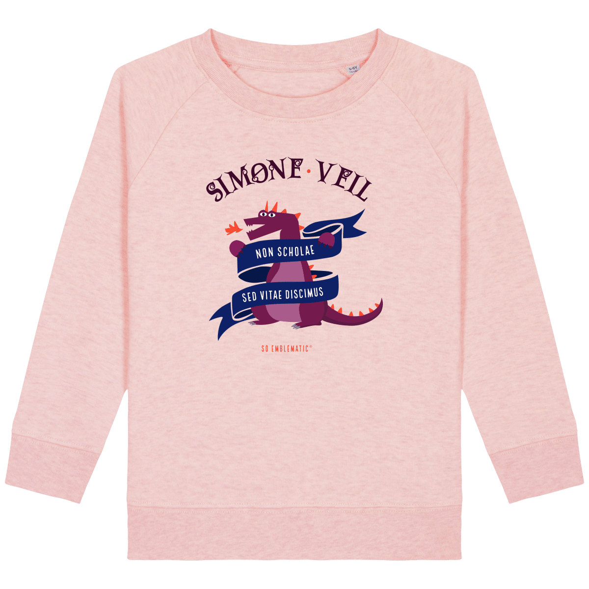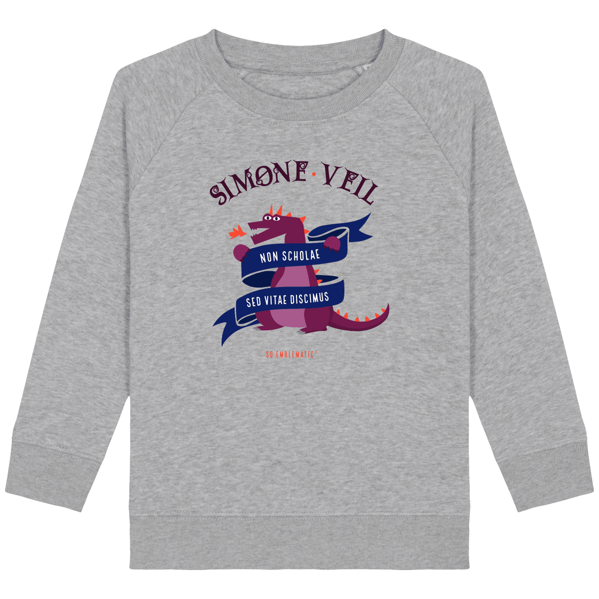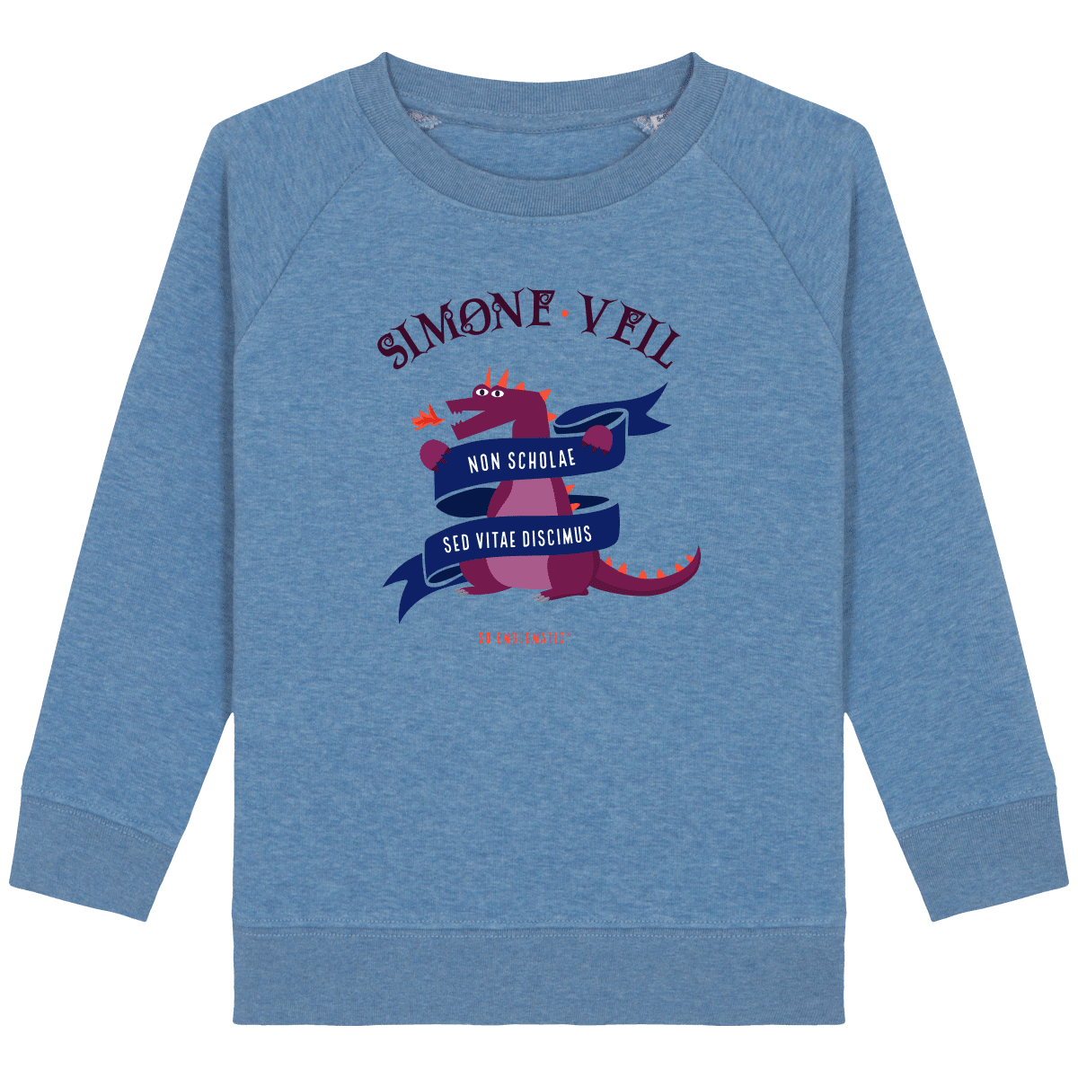 Sweat Enfant DRAGON SIMONE VEIL. Sweat enfant col rond en coton BIO de la marque STANLEY STELLA. Manches raglan, Col en côte 1×1. Bande de propreté intérieur col en jersey. 1/2 lune intérieur col dans la matière principale, Côte 1×1 au bas de manches et bas de corps. Surpiqûre double aux emmanchures, bas de manches et bas de corps. Sweat intérieur en molleton non brossé (non duveteux). 85% coton biologique filé et peigné, 15% polyester recyclé. Coupe normale du 3/4 ans au 12/14 ans. 300 G/M².