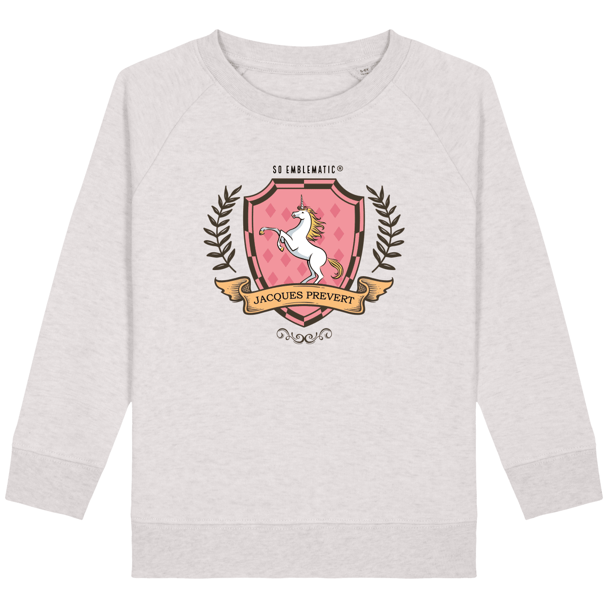 Sweat Enfant fille Licorne JACQUES PREVERT. Sweat enfant col rond en coton BIO de la marque STANLEY STELLA. Manches raglan, Col en côte 1×1. Bande de propreté intérieur col en jersey. 1/2 lune intérieur col dans la matière principale, Côte 1×1 au bas de manches et bas de corps. Surpiqûre double aux emmanchures, bas de manches et bas de corps. Sweat intérieur en molleton non brossé (non duveteux). 85% coton biologique filé et peigné, 15% polyester recyclé. Coupe normale du 3/4 ans au 12/14 ans. 300 G/M².