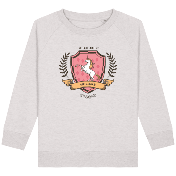 Sweat Enfant fille Licorne MOLIERE. Sweat enfant col rond en coton BIO de la marque STANLEY STELLA. Manches raglan, Col en côte 1×1. Bande de propreté intérieur col en jersey. 1/2 lune intérieur col dans la matière principale, Côte 1×1 au bas de manches et bas de corps. Surpiqûre double aux emmanchures, bas de manches et bas de corps. Sweat intérieur en molleton non brossé (non duveteux). 85% coton biologique filé et peigné, 15% polyester recyclé. Coupe normale du 3/4 ans au 12/14 ans. 300 G/M².
