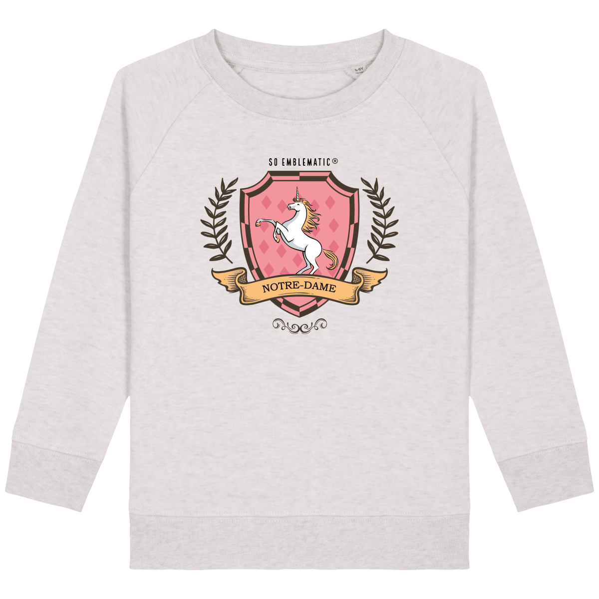 Sweat Enfant fille Licorne NOTRE-DAME. Sweat enfant col rond en coton BIO de la marque STANLEY STELLA. Manches raglan, Col en côte 1×1. Bande de propreté intérieur col en jersey. 1/2 lune intérieur col dans la matière principale, Côte 1×1 au bas de manches et bas de corps. Surpiqûre double aux emmanchures, bas de manches et bas de corps. Sweat intérieur en molleton non brossé (non duveteux). 85% coton biologique filé et peigné, 15% polyester recyclé. Coupe normale du 3/4 ans au 12/14 ans. 300 G/M².