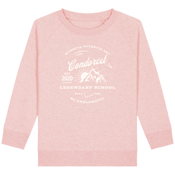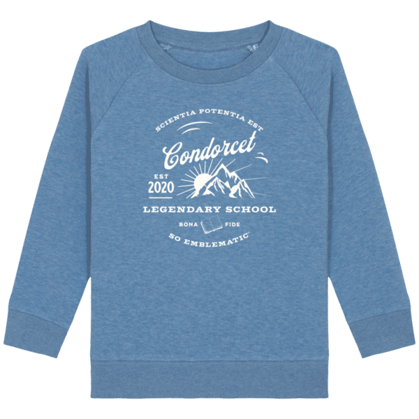 Sweat Enfant pour l’école Condorcet. Sweat enfant col rond en coton BIO de la marque STANLEY STELLA. Manches raglan, Col en côte 1×1. Bande de propreté intérieur col en jersey. 1/2 lune intérieur col dans la matière principale, Côte 1×1 au bas de manches et bas de corps. Surpiqûre double aux emmanchures, bas de manches et bas de corps. Sweat intérieur en molleton non brossé (non duveteux). 85% coton biologique filé et peigné, 15% polyester recyclé. Coupe normale du 3/4 ans au 12/14 ans. 300 G/M².