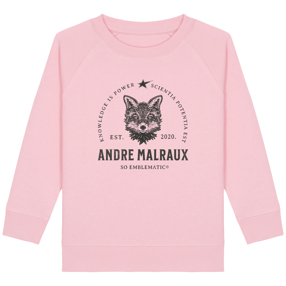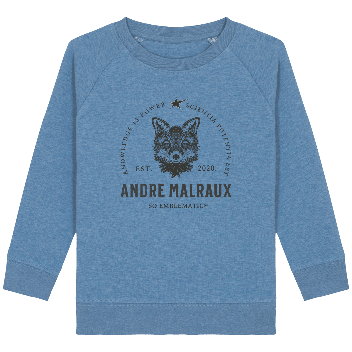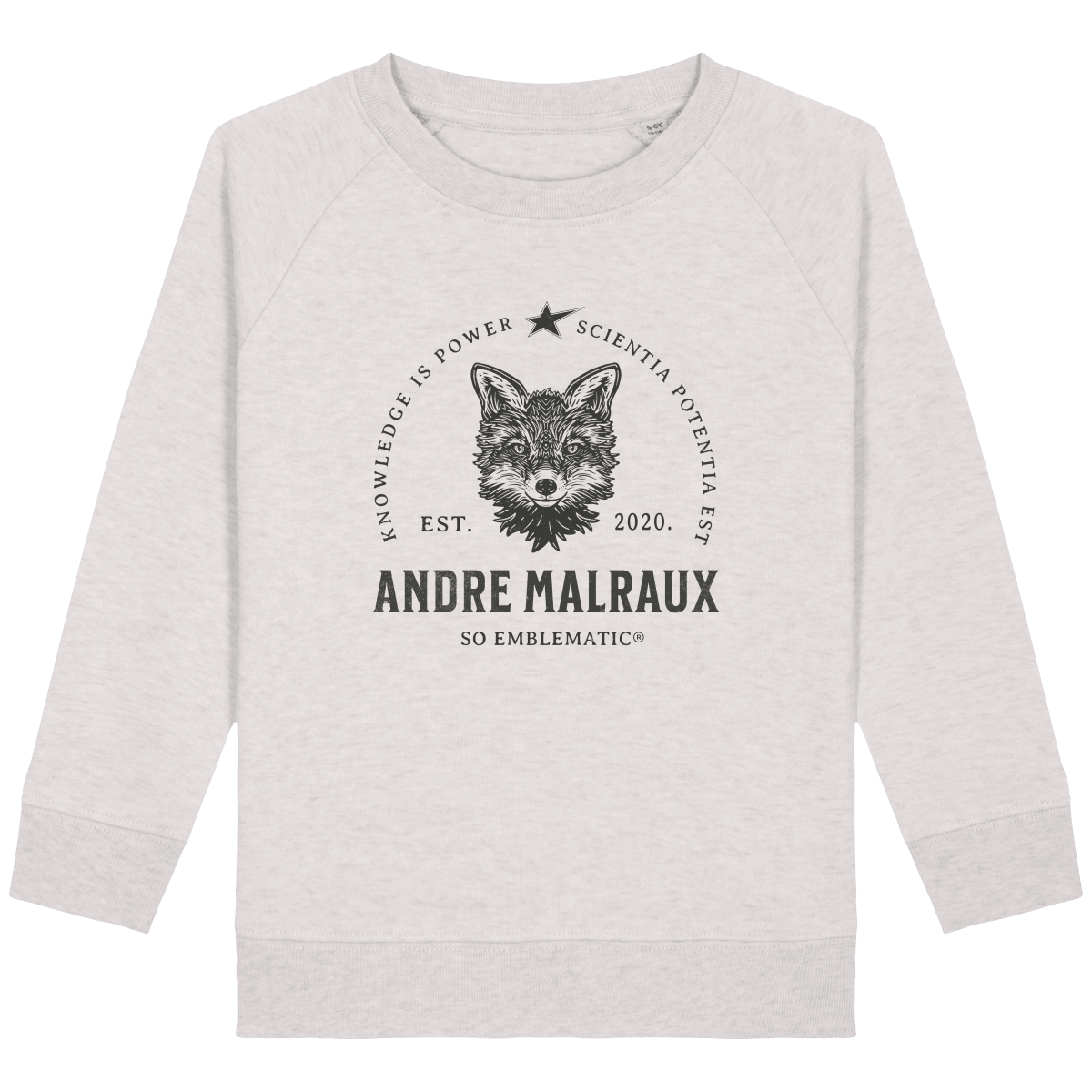 Sweat Enfant Renard ANDRE MALRAUX. Sweat enfant col rond en coton BIO de la marque STANLEY STELLA. Manches raglan, Col en côte 1×1. Bande de propreté intérieur col en jersey. 1/2 lune intérieur col dans la matière principale, Côte 1×1 au bas de manches et bas de corps. Surpiqûre double aux emmanchures, bas de manches et bas de corps. Sweat intérieur en molleton non brossé (non duveteux). 85% coton biologique filé et peigné, 15% polyester recyclé. Coupe normale du 3/4 ans au 12/14 ans. 300 G/M².