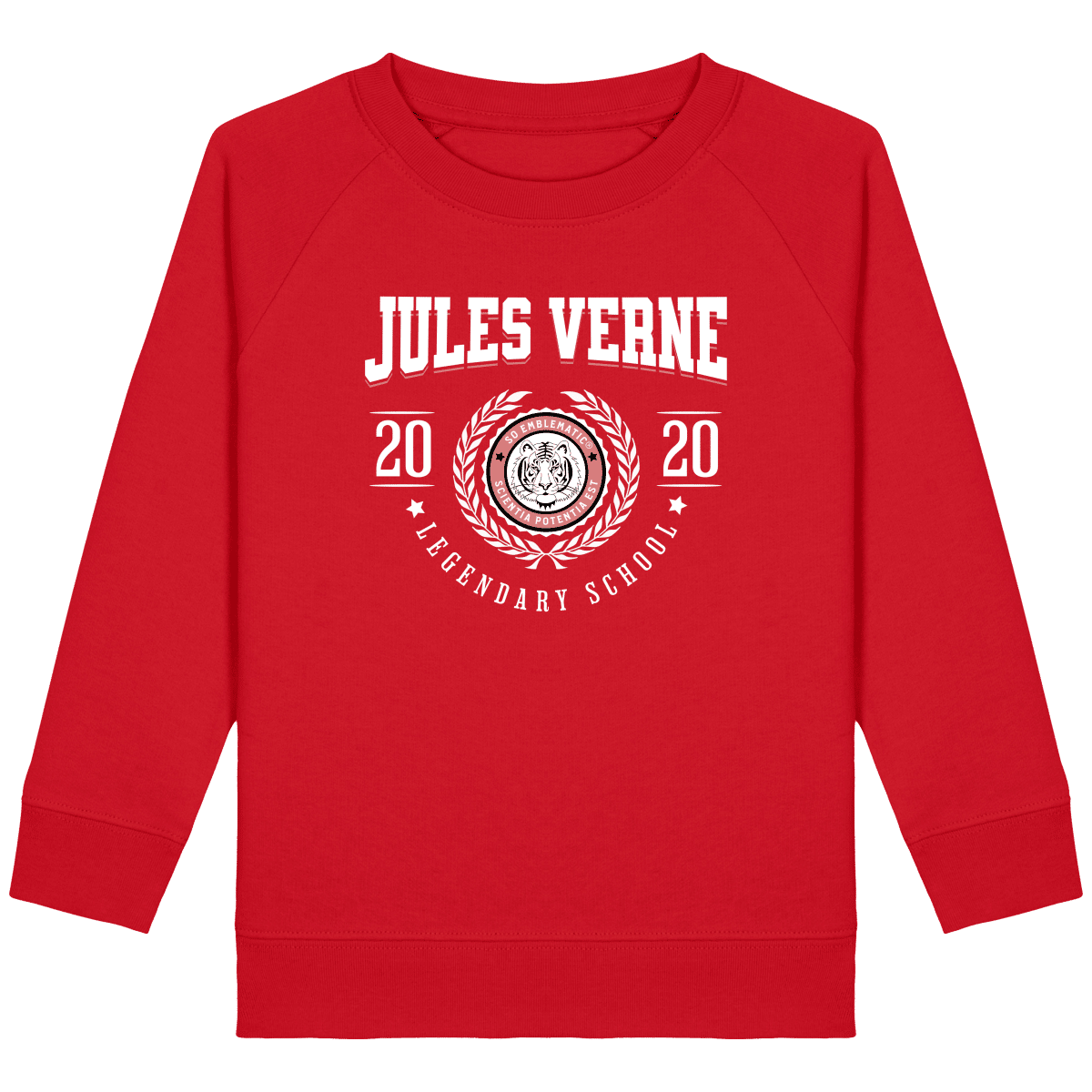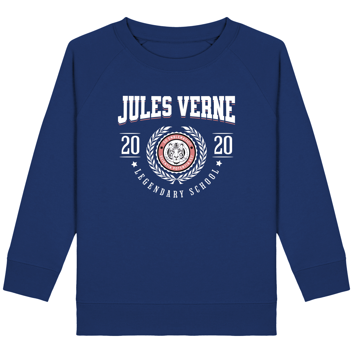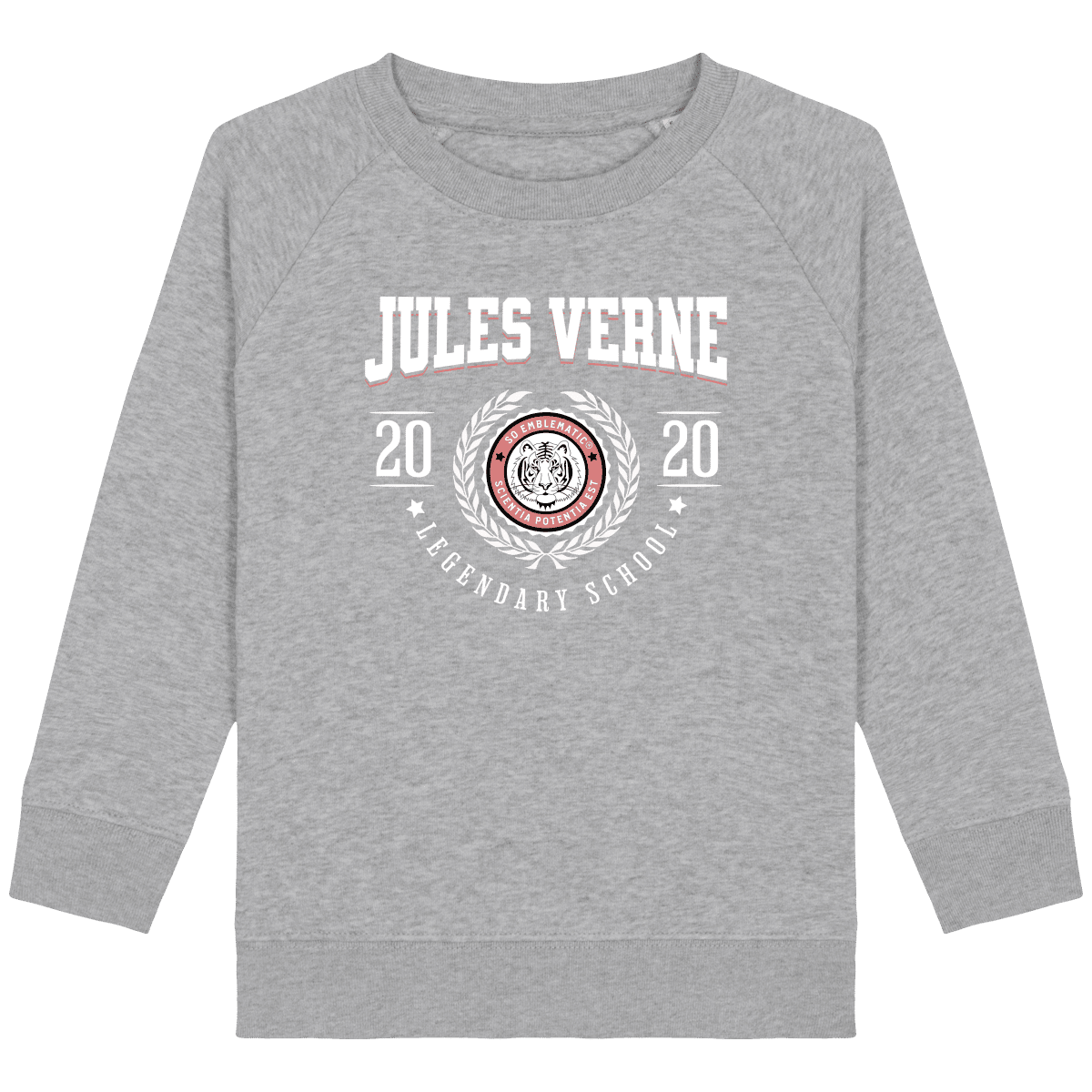 Sweat Enfant University JULES VERNE. Sweat enfant col rond en coton BIO de la marque STANLEY STELLA. Manches raglan, Col en côte 1×1. Bande de propreté intérieur col en jersey. 1/2 lune intérieur col dans la matière principale, Côte 1×1 au bas de manches et bas de corps. Surpiqûre double aux emmanchures, bas de manches et bas de corps. Sweat intérieur en molleton non brossé (non duveteux). 85% coton biologique filé et peigné, 15% polyester recyclé. Coupe normale du 3/4 ans au 12/14 ans. 300 G/M².