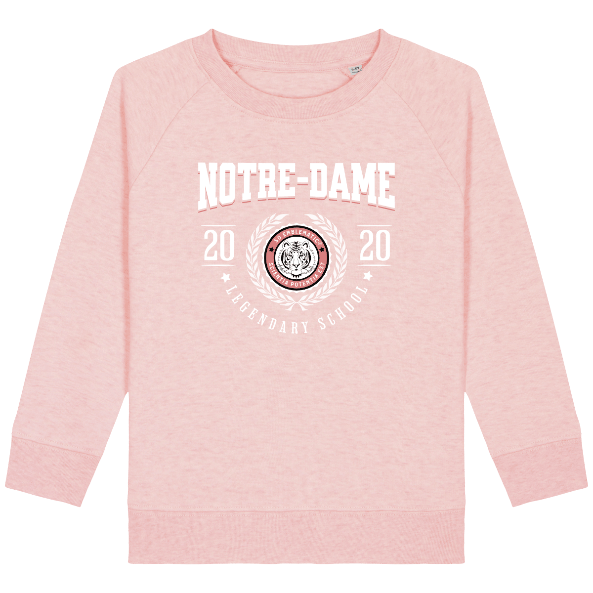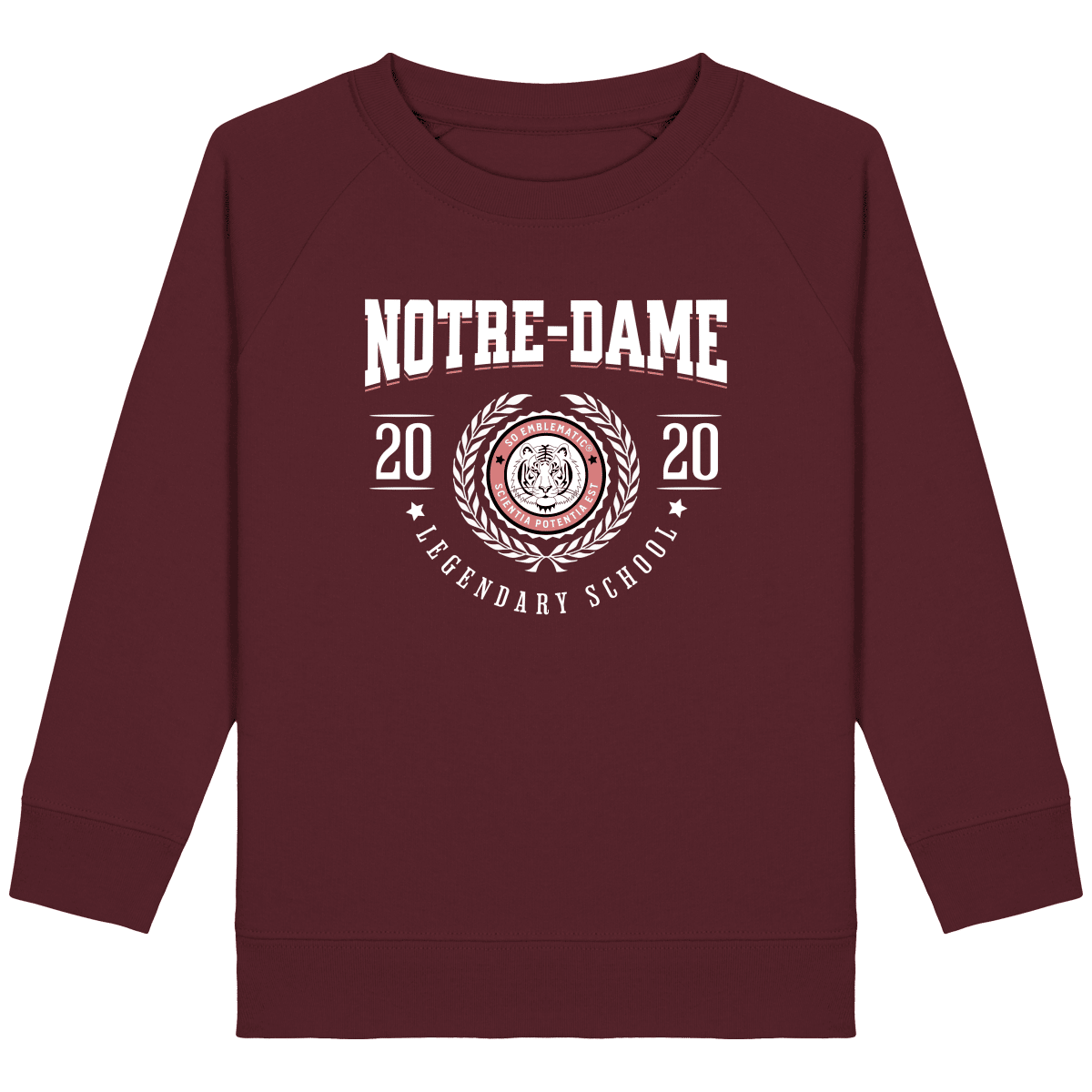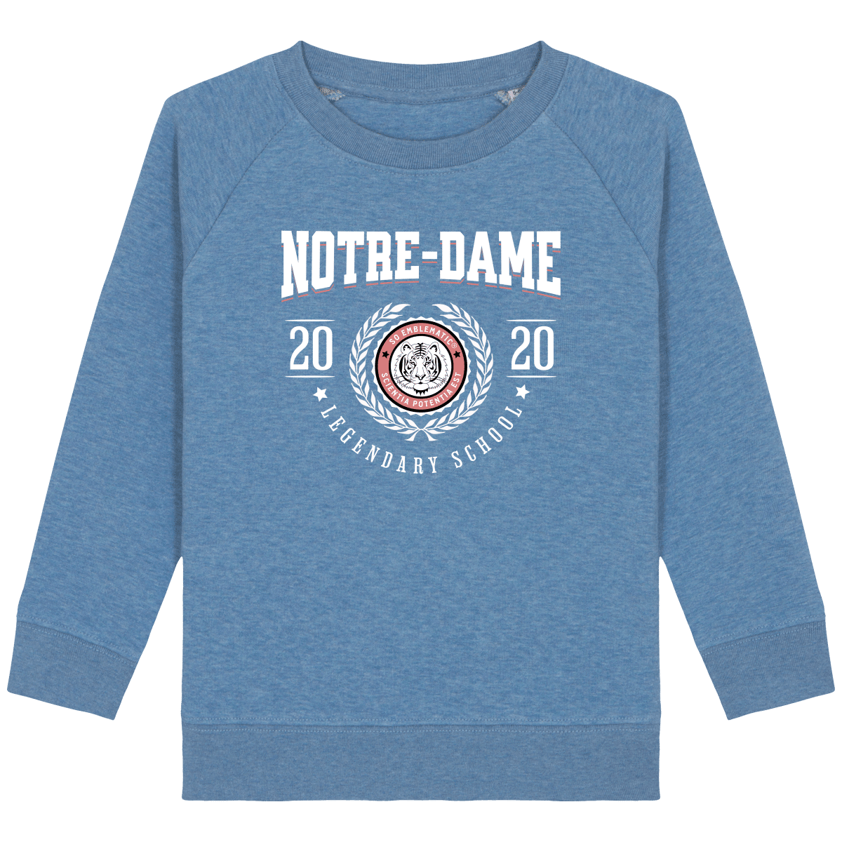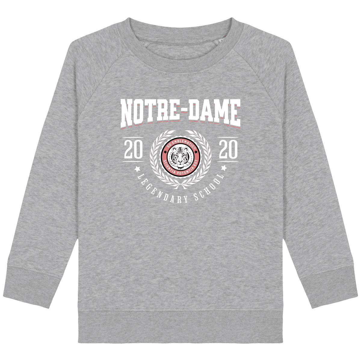 Sweat Enfant University NOTRE-DAME. Sweat enfant col rond en coton BIO de la marque STANLEY STELLA. Manches raglan, Col en côte 1×1. Bande de propreté intérieur col en jersey. 1/2 lune intérieur col dans la matière principale, Côte 1×1 au bas de manches et bas de corps. Surpiqûre double aux emmanchures, bas de manches et bas de corps. Sweat intérieur en molleton non brossé (non duveteux). 85% coton biologique filé et peigné, 15% polyester recyclé. Coupe normale du 3/4 ans au 12/14 ans. 300 G/M².