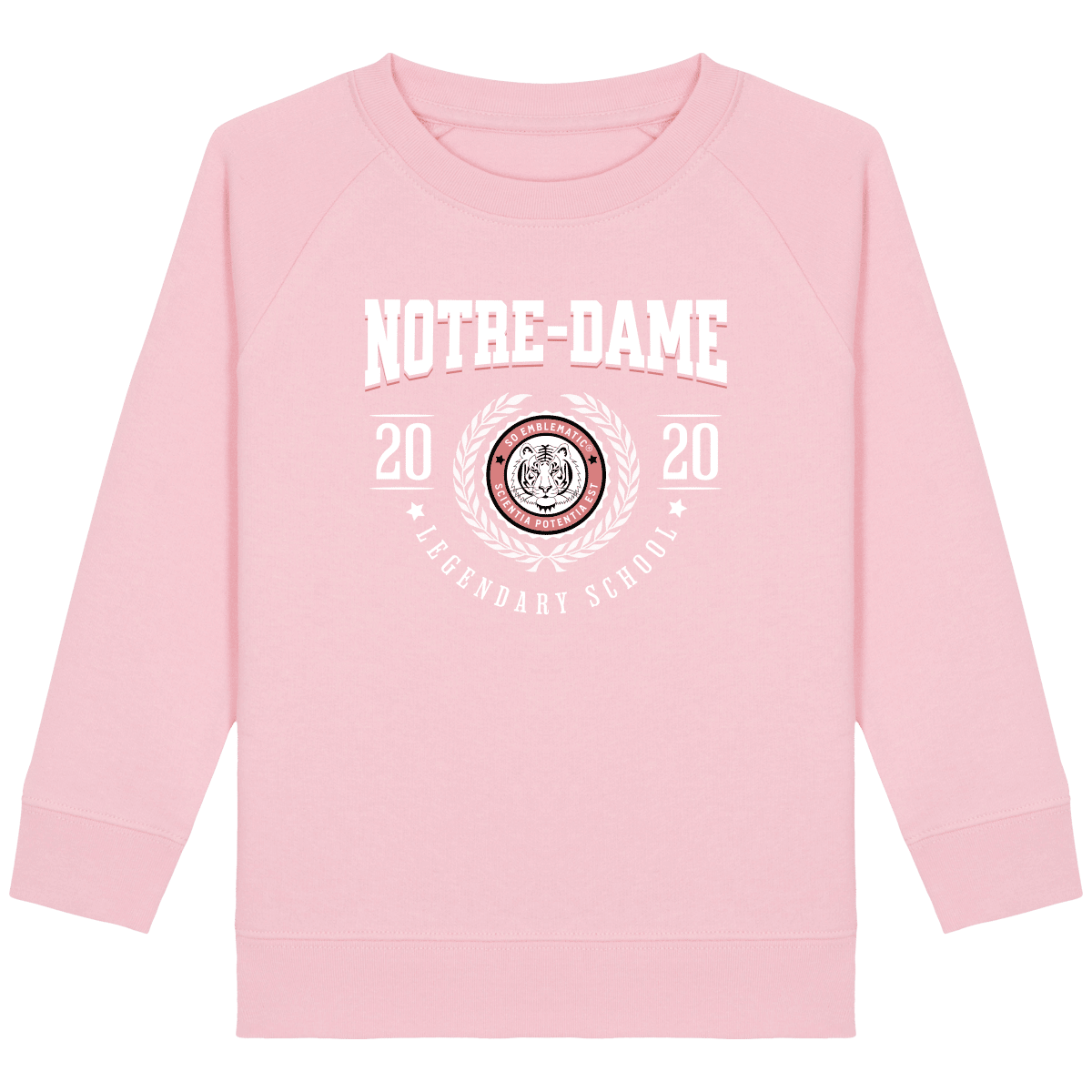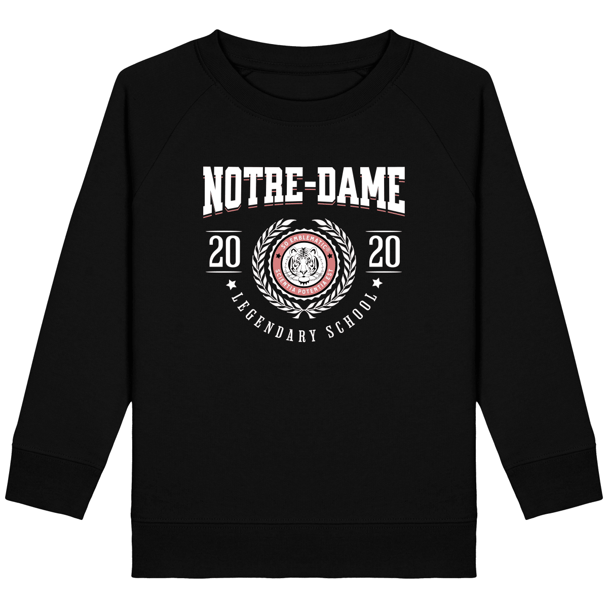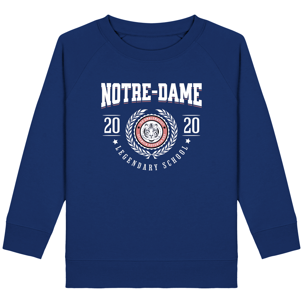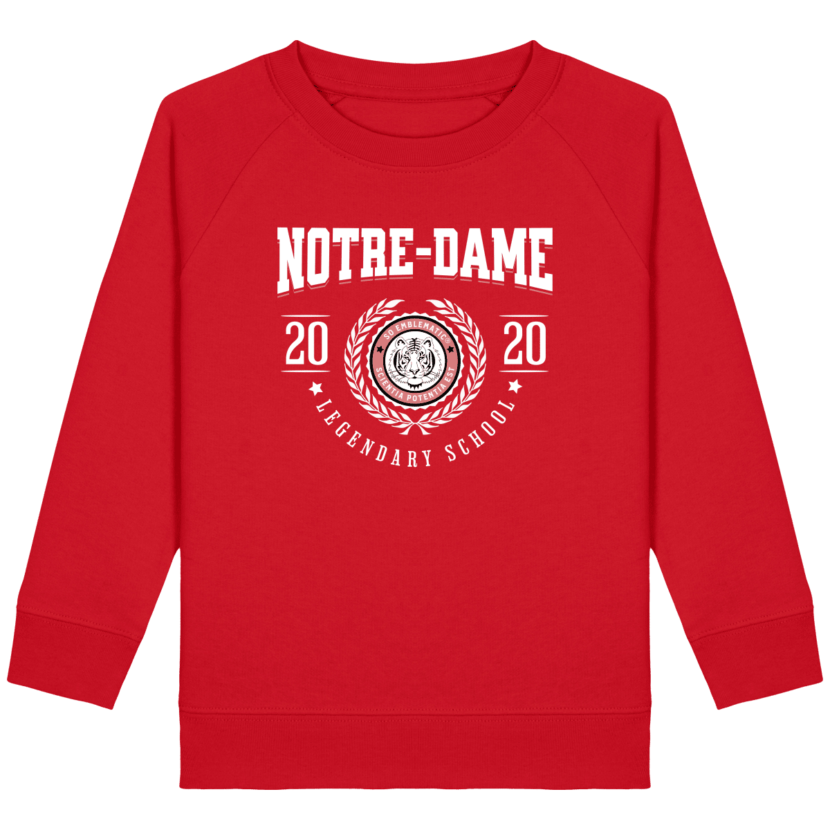 Sweat Enfant University NOTRE-DAME. Sweat enfant col rond en coton BIO de la marque STANLEY STELLA. Manches raglan, Col en côte 1×1. Bande de propreté intérieur col en jersey. 1/2 lune intérieur col dans la matière principale, Côte 1×1 au bas de manches et bas de corps. Surpiqûre double aux emmanchures, bas de manches et bas de corps. Sweat intérieur en molleton non brossé (non duveteux). 85% coton biologique filé et peigné, 15% polyester recyclé. Coupe normale du 3/4 ans au 12/14 ans. 300 G/M².