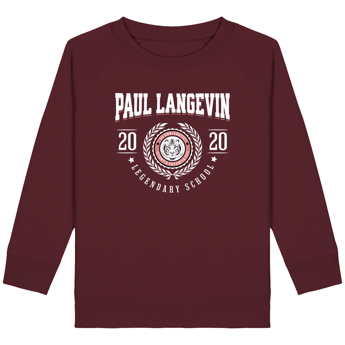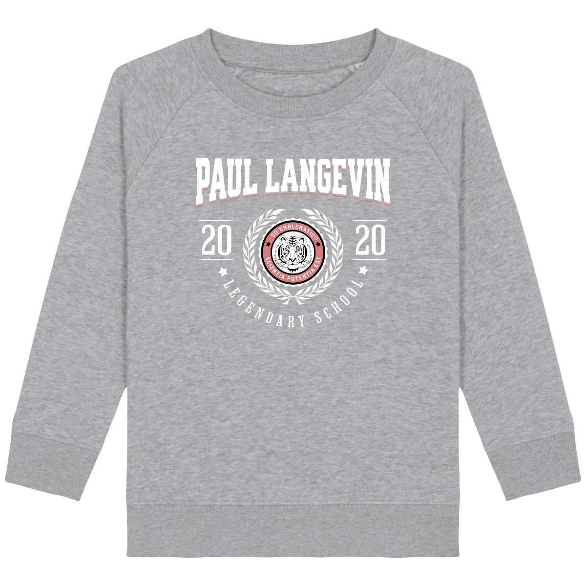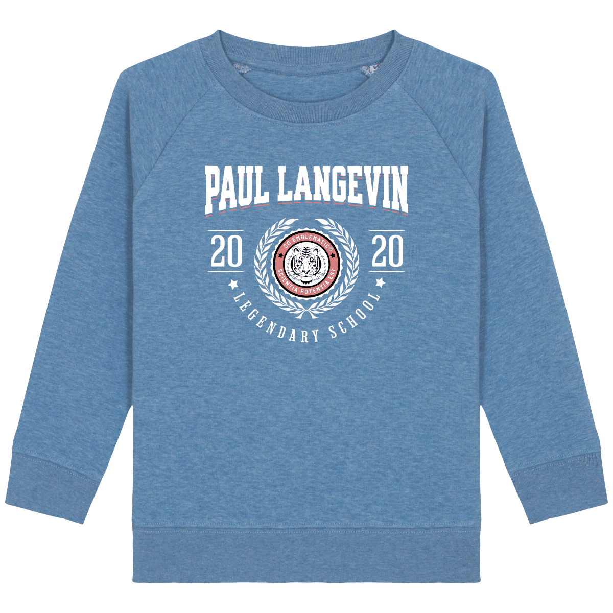 Sweat Enfant University PAUL LANGEVIN. Sweat enfant col rond en coton BIO de la marque STANLEY STELLA. Manches raglan, Col en côte 1×1. Bande de propreté intérieur col en jersey. 1/2 lune intérieur col dans la matière principale, Côte 1×1 au bas de manches et bas de corps. Surpiqûre double aux emmanchures, bas de manches et bas de corps. Sweat intérieur en molleton non brossé (non duveteux). 85% coton biologique filé et peigné, 15% polyester recyclé. Coupe normale du 3/4 ans au 12/14 ans. 300 G/M².