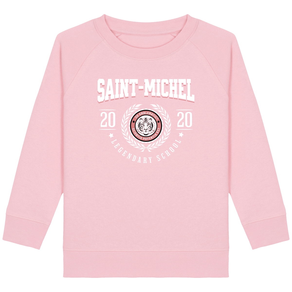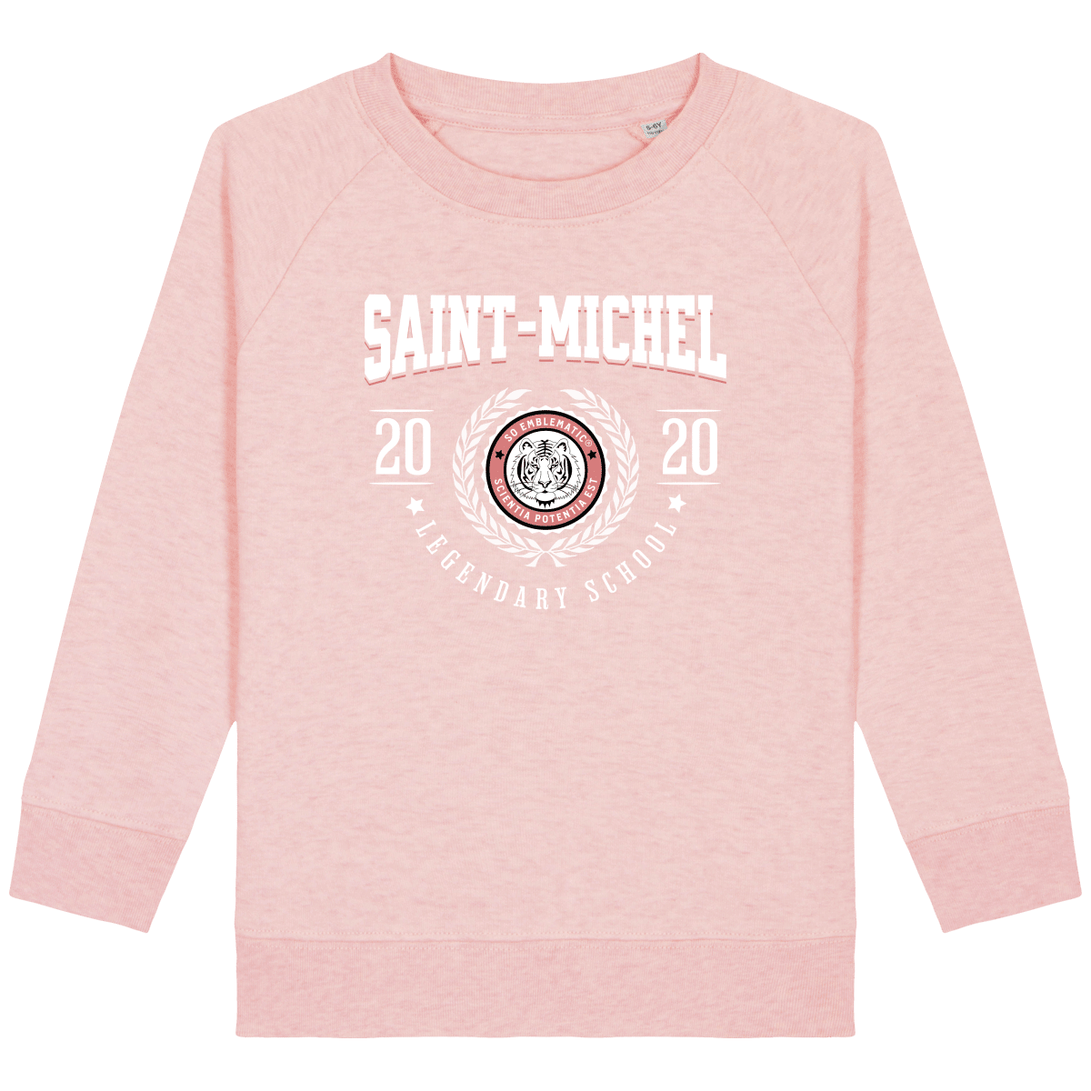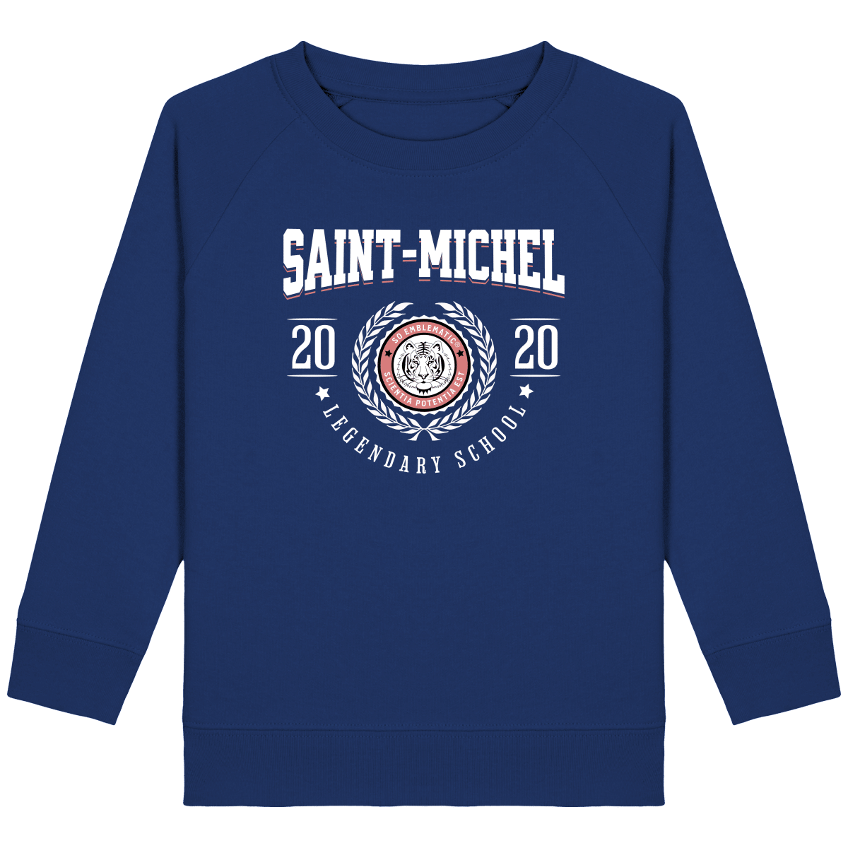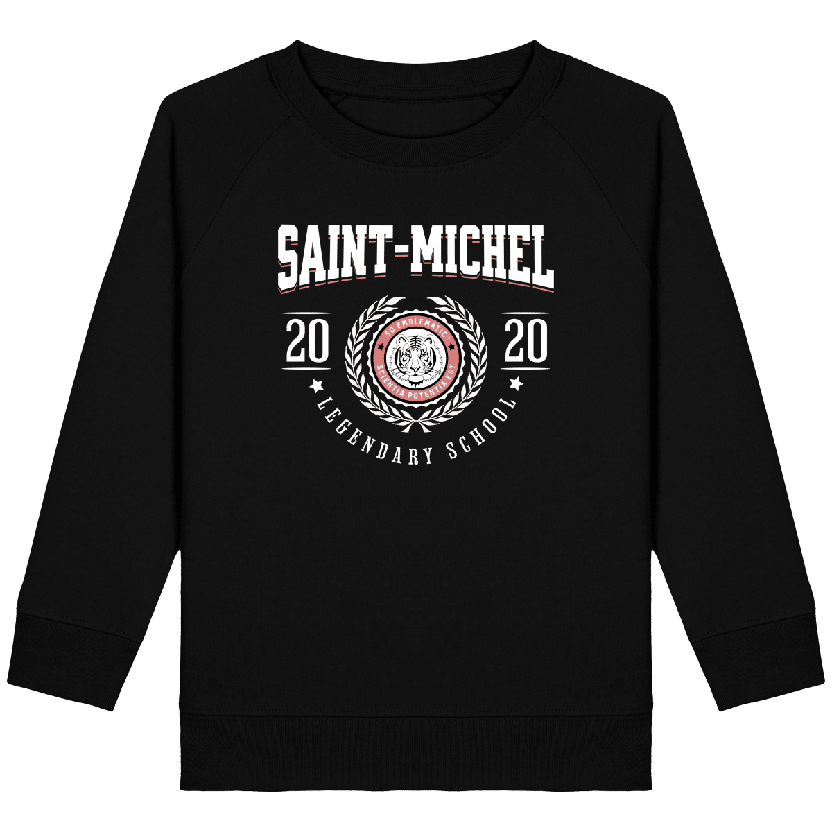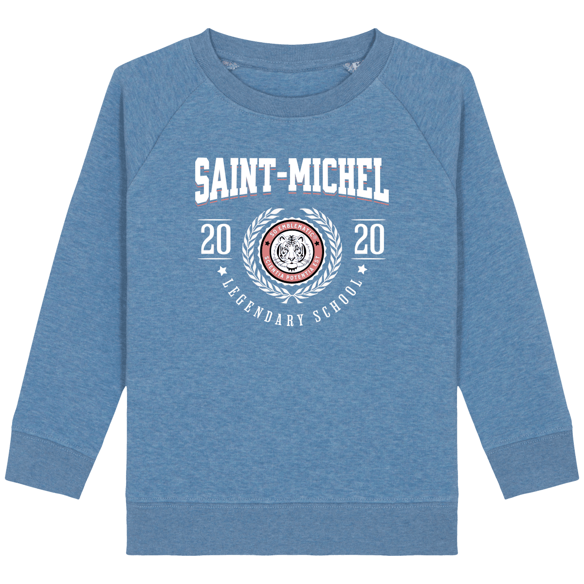 Sweat Enfant University SAINT-MICHEL. Sweat enfant col rond en coton BIO de la marque STANLEY STELLA. Manches raglan, Col en côte 1×1. Bande de propreté intérieur col en jersey. 1/2 lune intérieur col dans la matière principale, Côte 1×1 au bas de manches et bas de corps. Surpiqûre double aux emmanchures, bas de manches et bas de corps. Sweat intérieur en molleton non brossé (non duveteux). 85% coton biologique filé et peigné, 15% polyester recyclé. Coupe normale du 3/4 ans au 12/14 ans. 300 G/M².