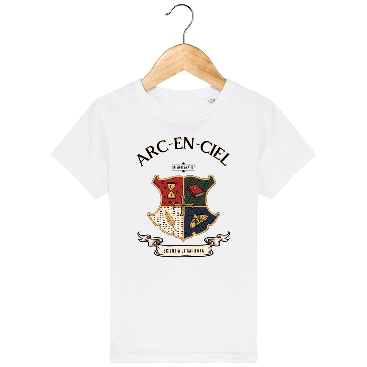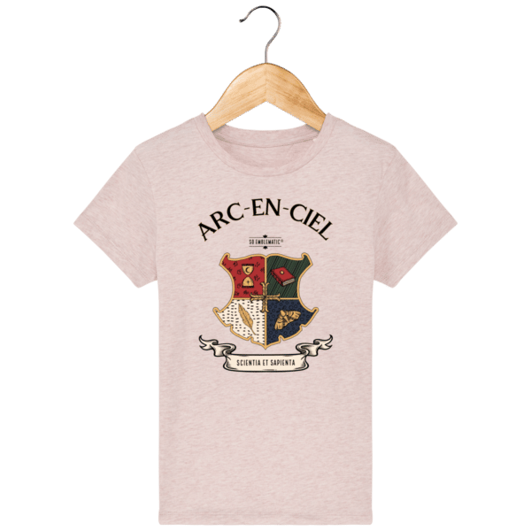 Tee Shirt Enfant Bio BLASON ECOLE ARC-EN-CIEL. T-shirt enfant iconique de la marque premium de mode éthique Stanley Stella. T-shirt enfant manches montées, col en côte 1×1, bande de propreté intérieur col dans la matière principale et surpiqûre double étroite en bas de manche et bas de corps. Composé de Jersey simple 100% COTON BIOLOGIQUE filé et peigné. Coupe normale. Grammage de 155 G/M².