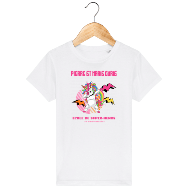 Tee Shirt Enfant Bio Ecole de Super-Héros PIERRE ET MARIE CURIE. T-shirt enfant iconique de la marque premium de mode éthique Stanley Stella. T-shirt enfant manches montées, col en côte 1×1, bande de propreté intérieur col dans la matière principale et surpiqûre double étroite en bas de manche et bas de corps. Composé de Jersey simple 100% COTON BIOLOGIQUE filé et peigné. Coupe normale. Grammage de 155 G/M².